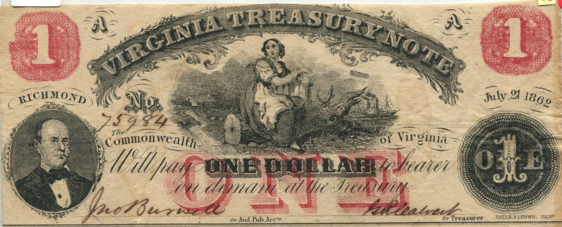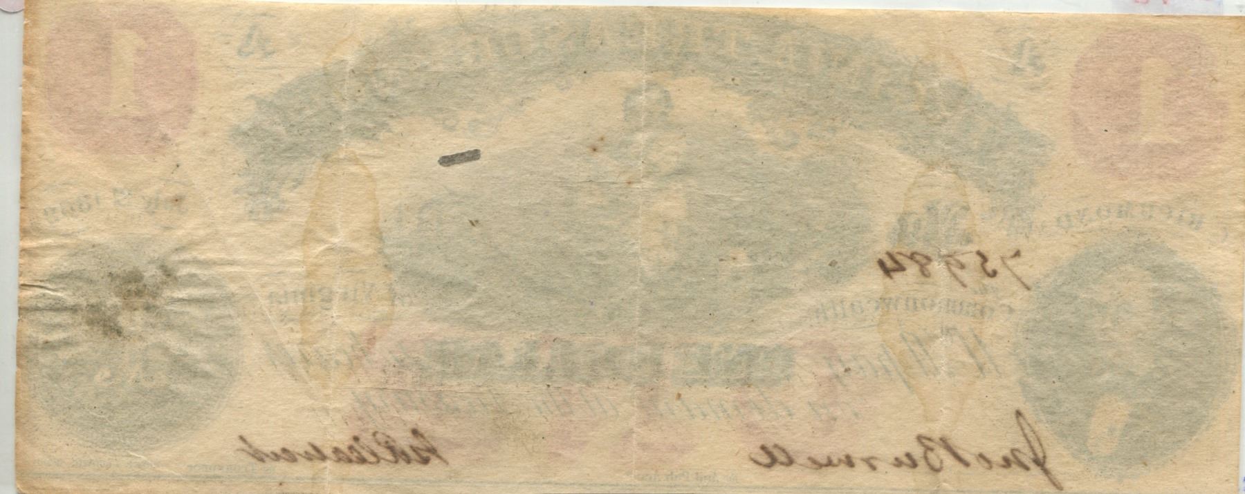 U.S. confederate Richmond Virginia treasory $1.00 note 1862 V.F. cond.