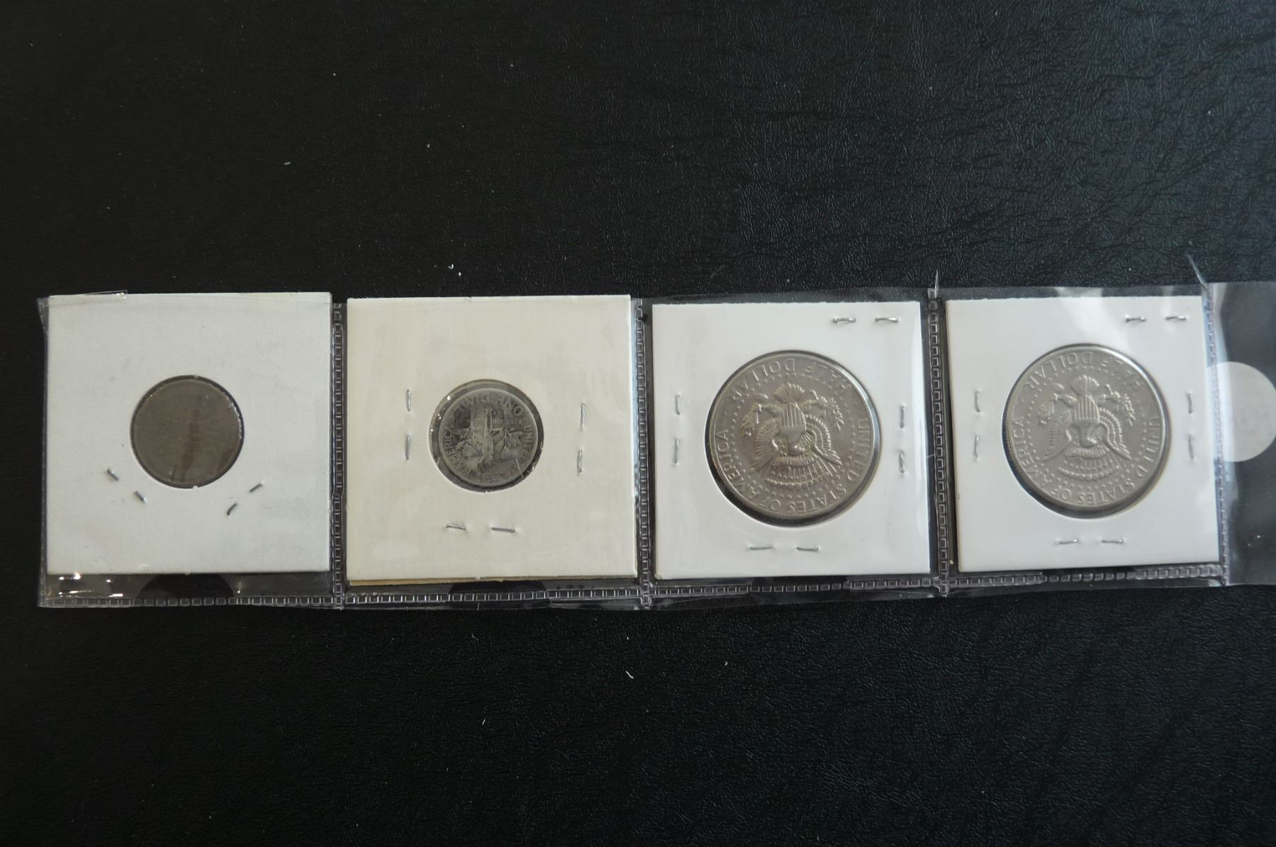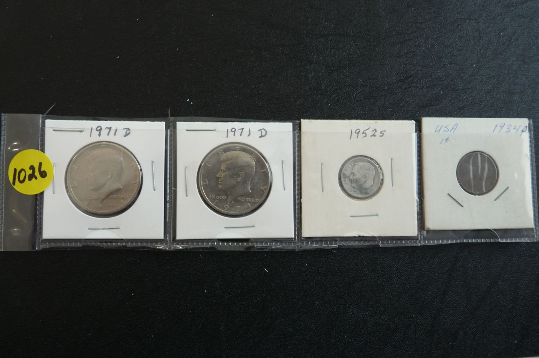 US 1971 Dollar (x2), 1952 - 10 cent coin, 1934 - 1 cent coin