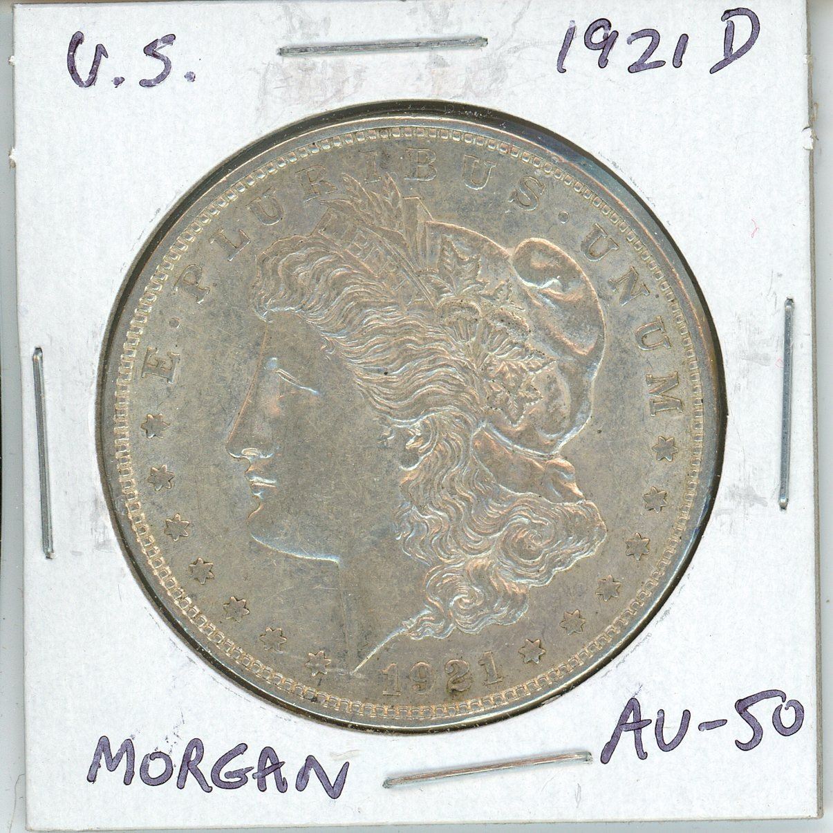 USA. 1921D Morgan Silver Dollar. Denver Mint. AU-50. Nice.