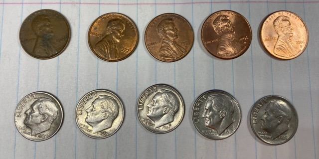 USA 1946, 1977, 1999, 2006 One Cent Pennies & 1965 x 2, 1981, 1983, 1985 Ten Cent Dimes Coins