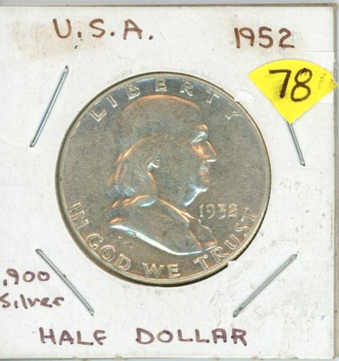 USA 1952 Franklin half dollar .900 silver V.F. condition