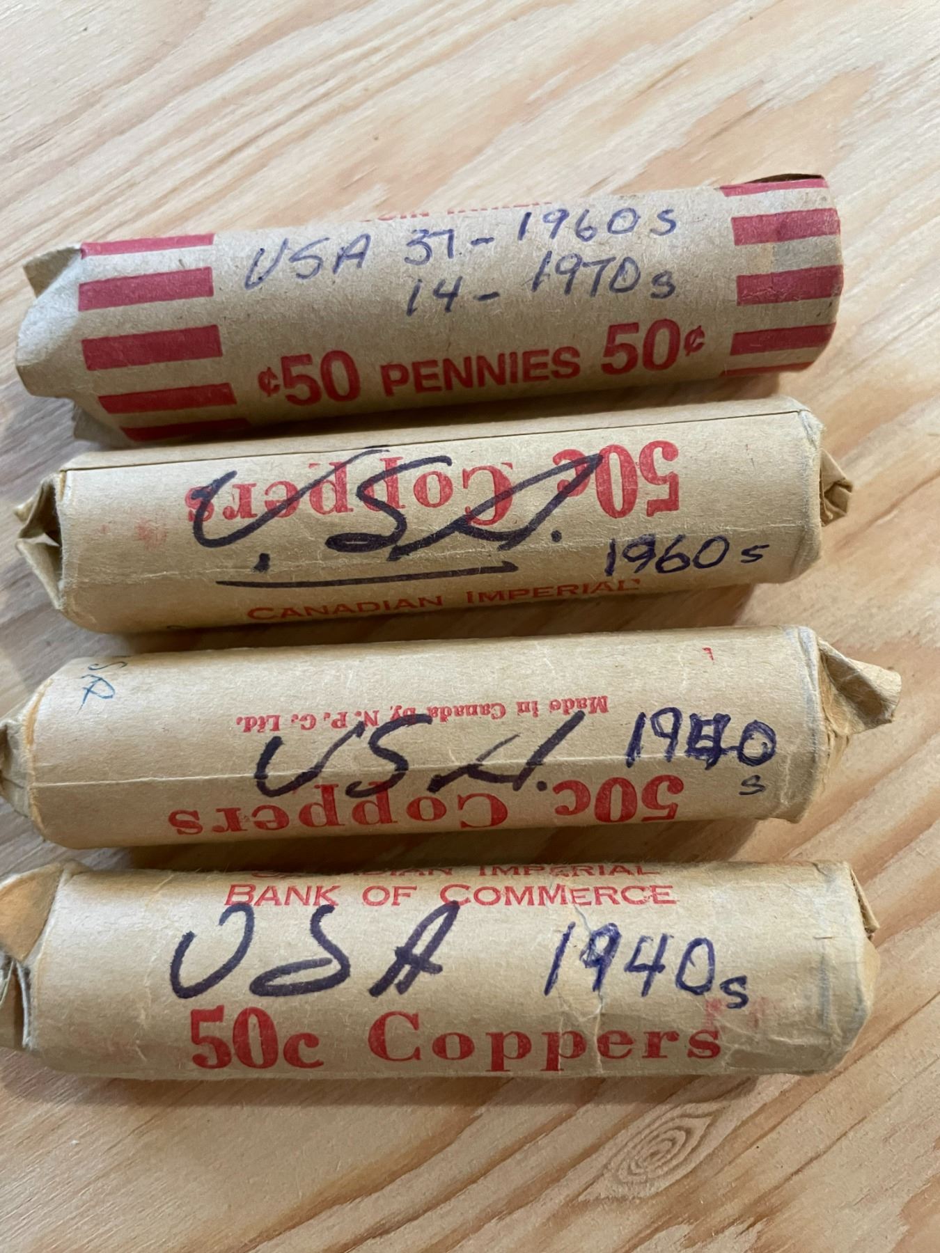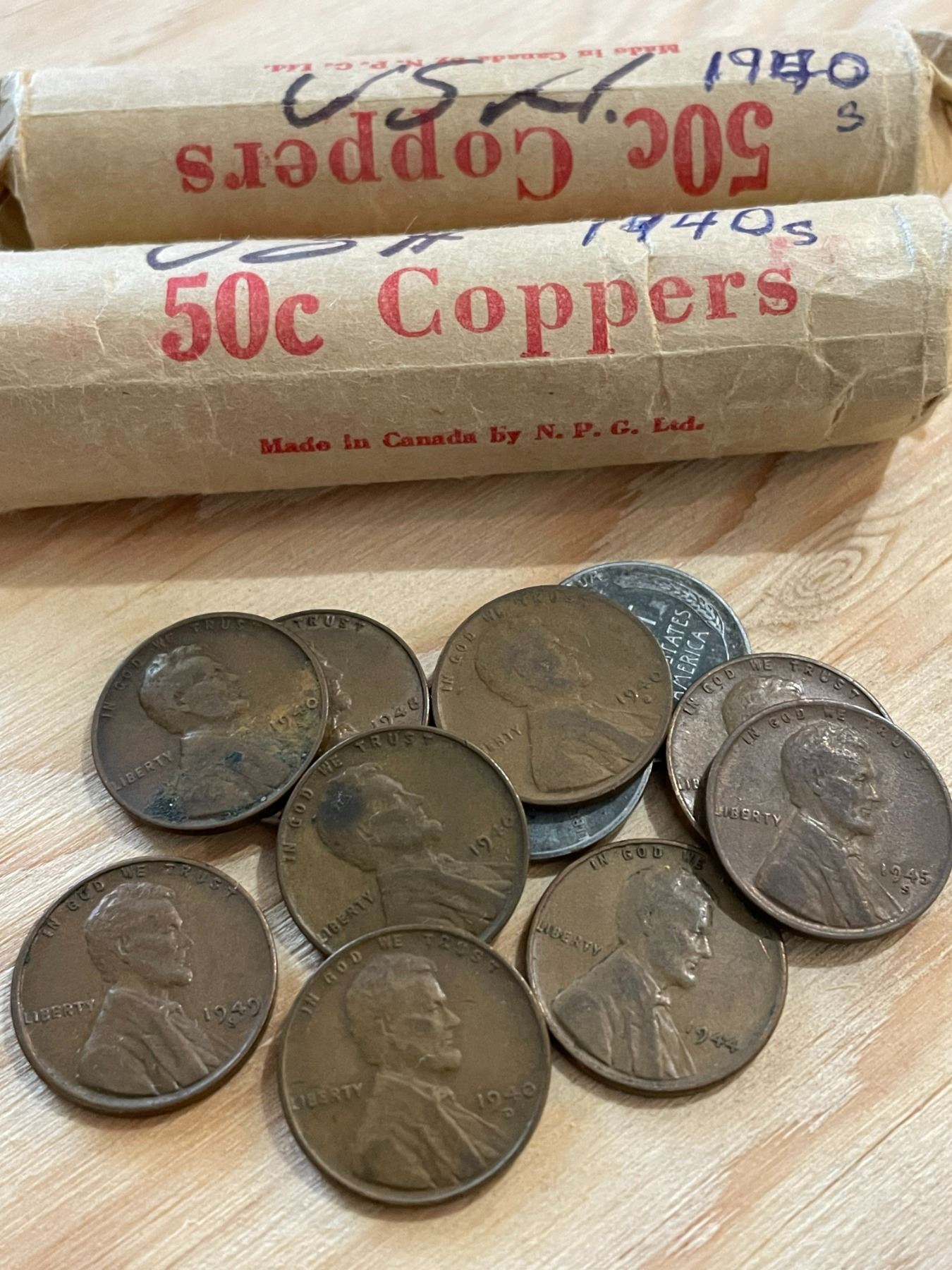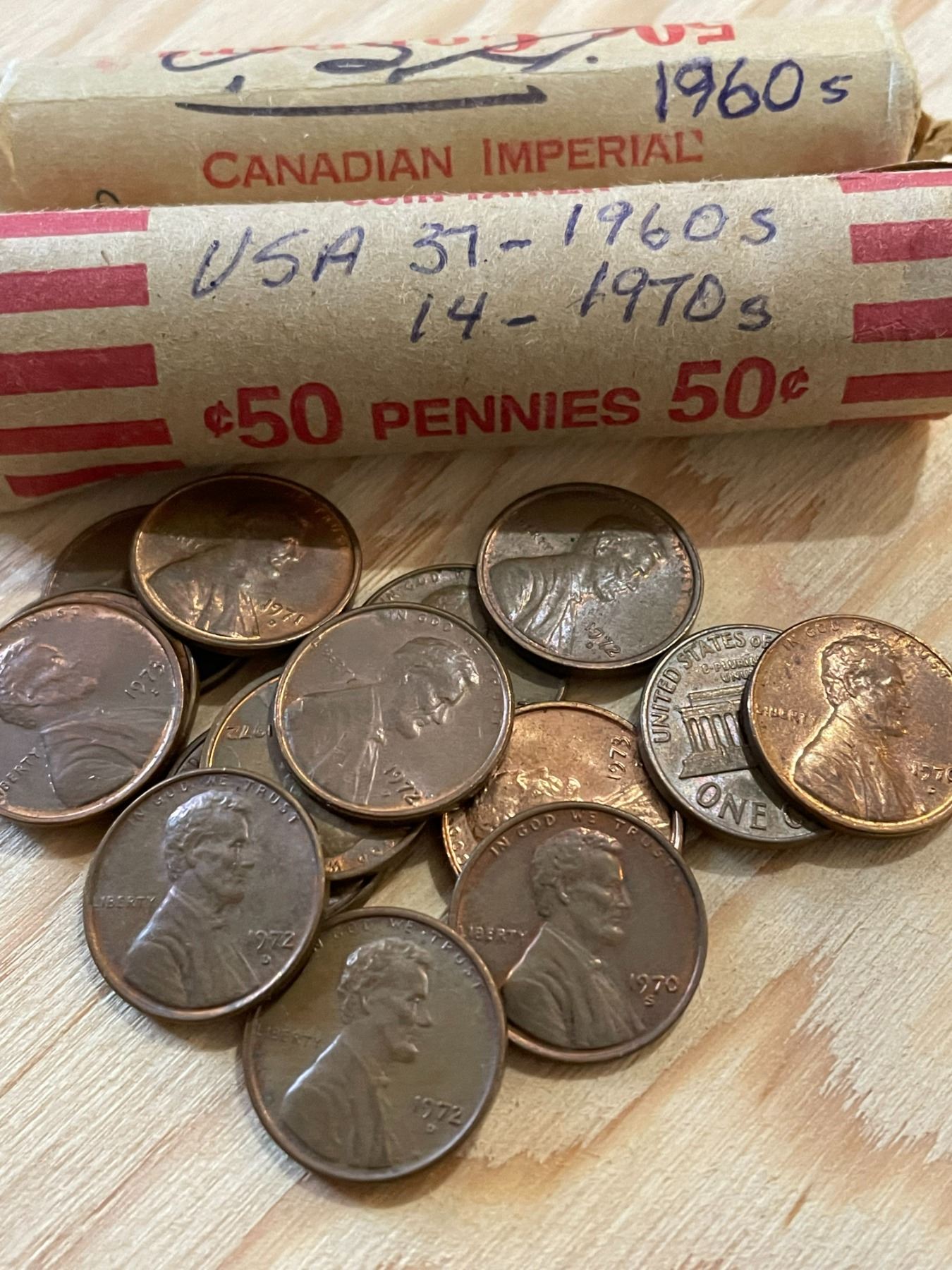 USA Pennies 1 Cent Circulated, 2 Rolls 1940s, 87 Coins 1960s, 14 Coins 1970s