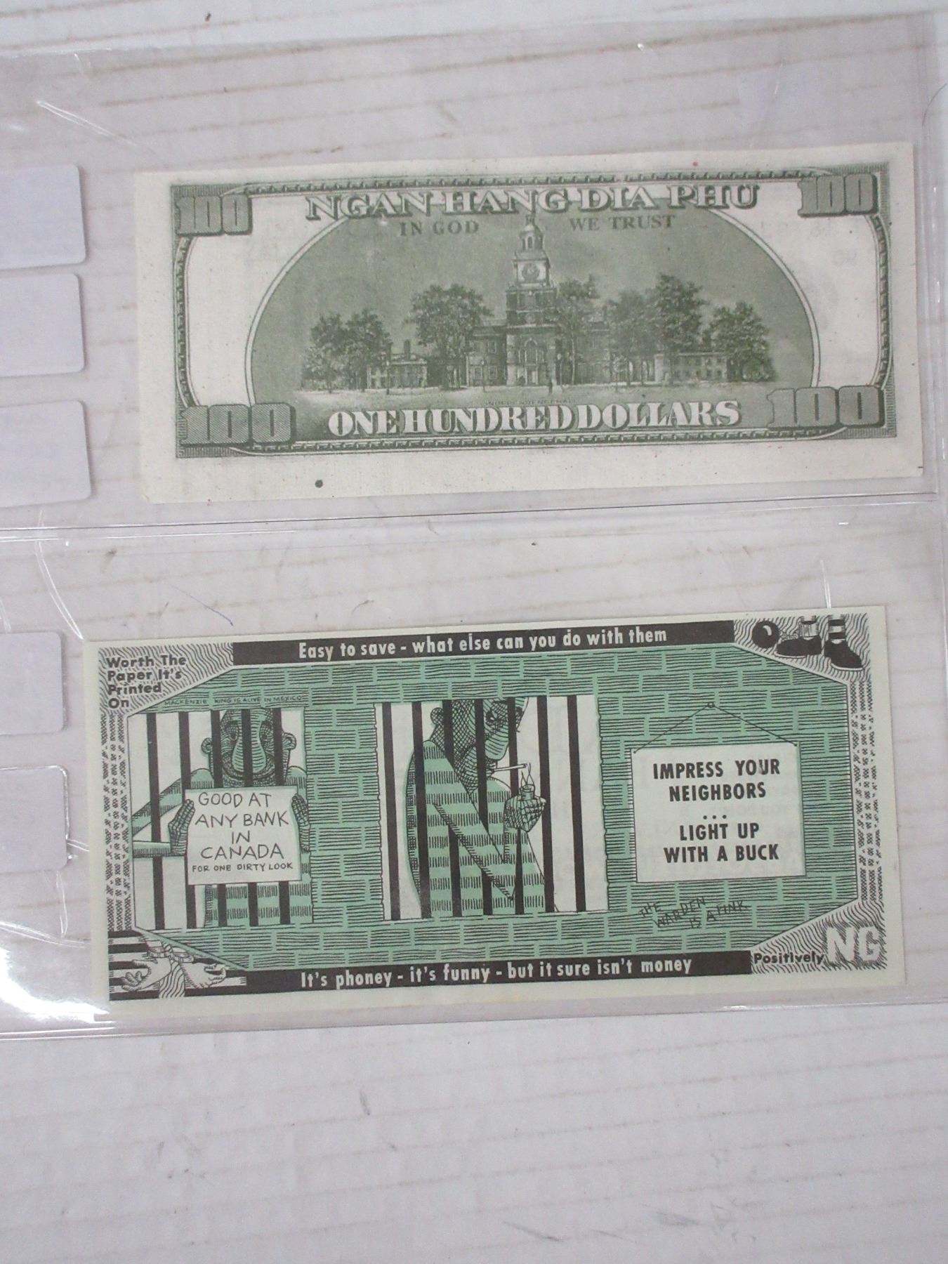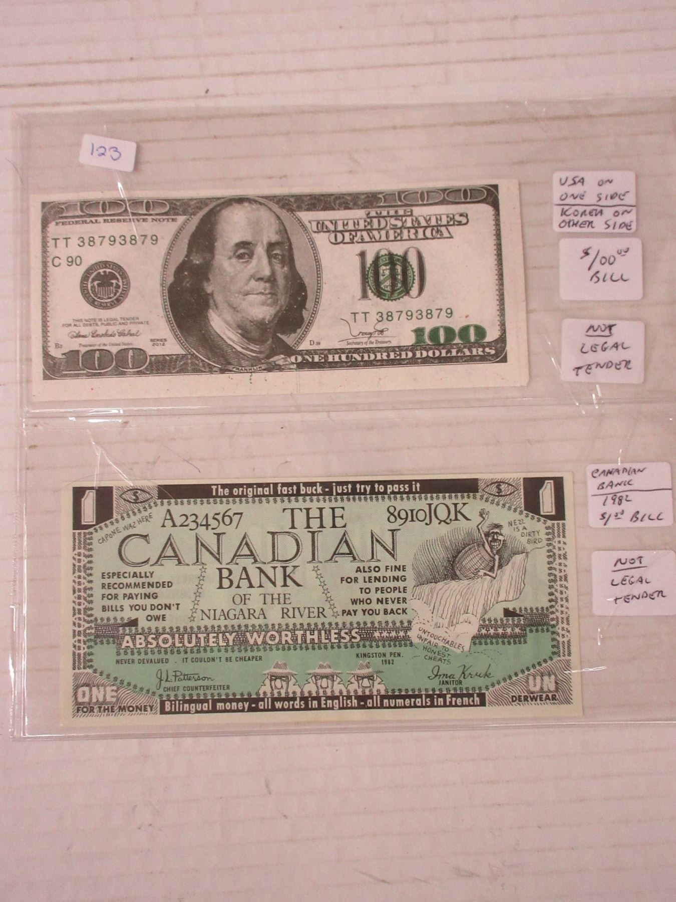 USA on one side & korea on other side- $100 bill & canadian bank ( wrothless bill- not legal tender)