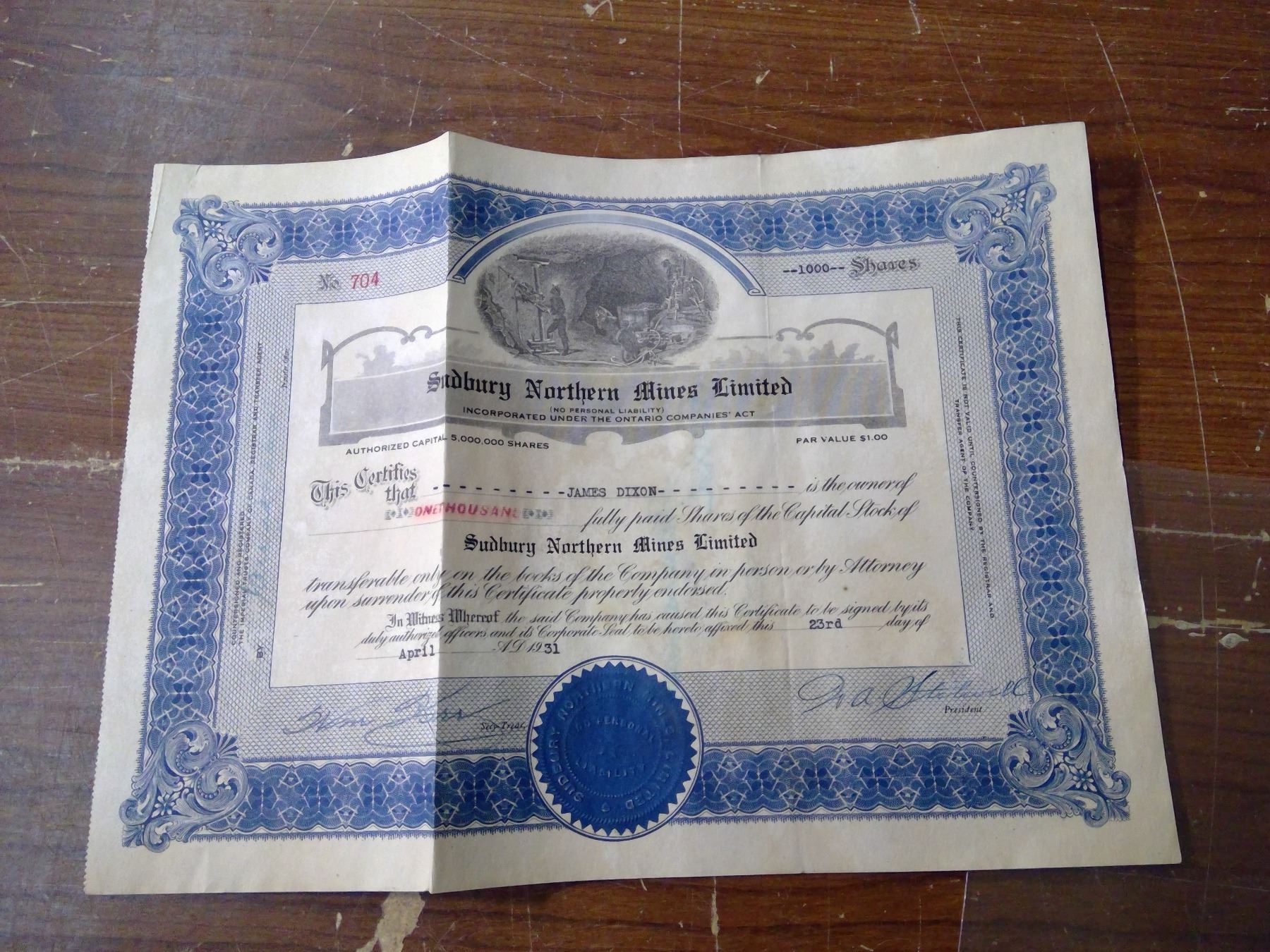 USED STOCK SHARES SUDBURY NOTHERN MINES LIMITED