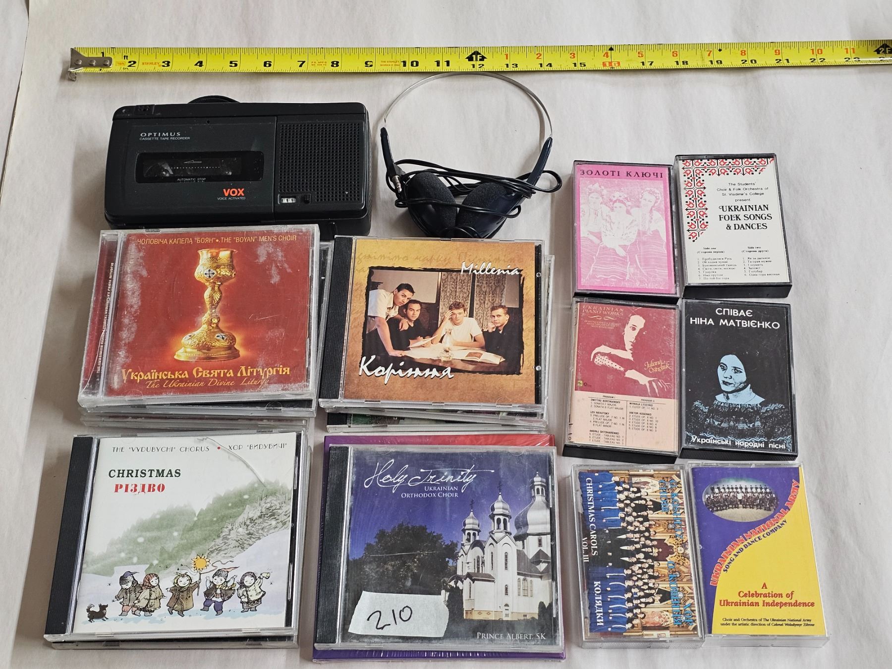Ukrainian CDs: Orthodox liturgical singing (including local Holy Trinity orthodox Church), Christmas carols, Easter Hymns. Plus Golden Harvest CD (sealed). Plus 6 Ukrainian tapes: Ukrainian National Army, 3 folklore, 1 Christmas carols and 1 piano. Added earphones and Optimus tape player.
