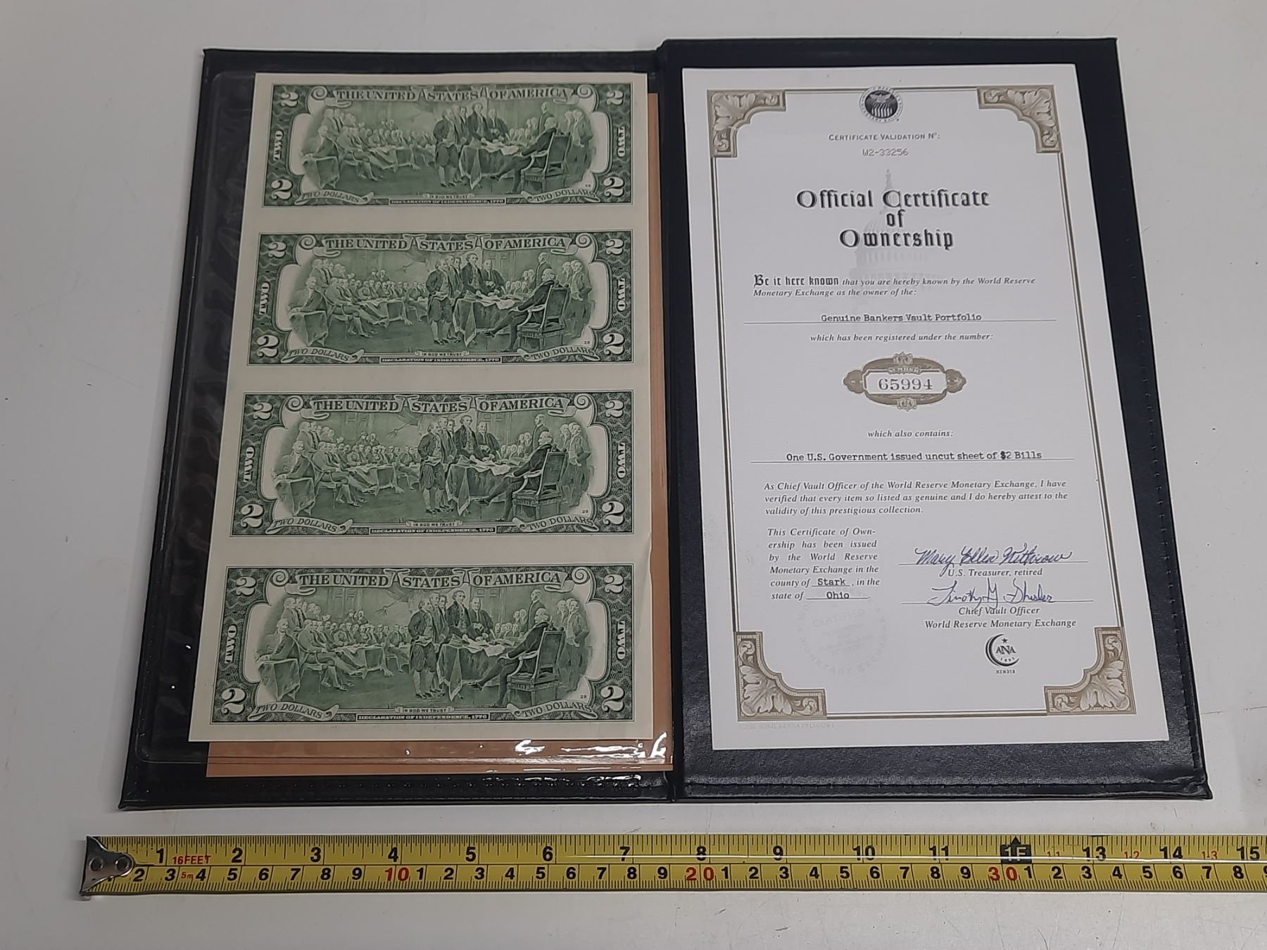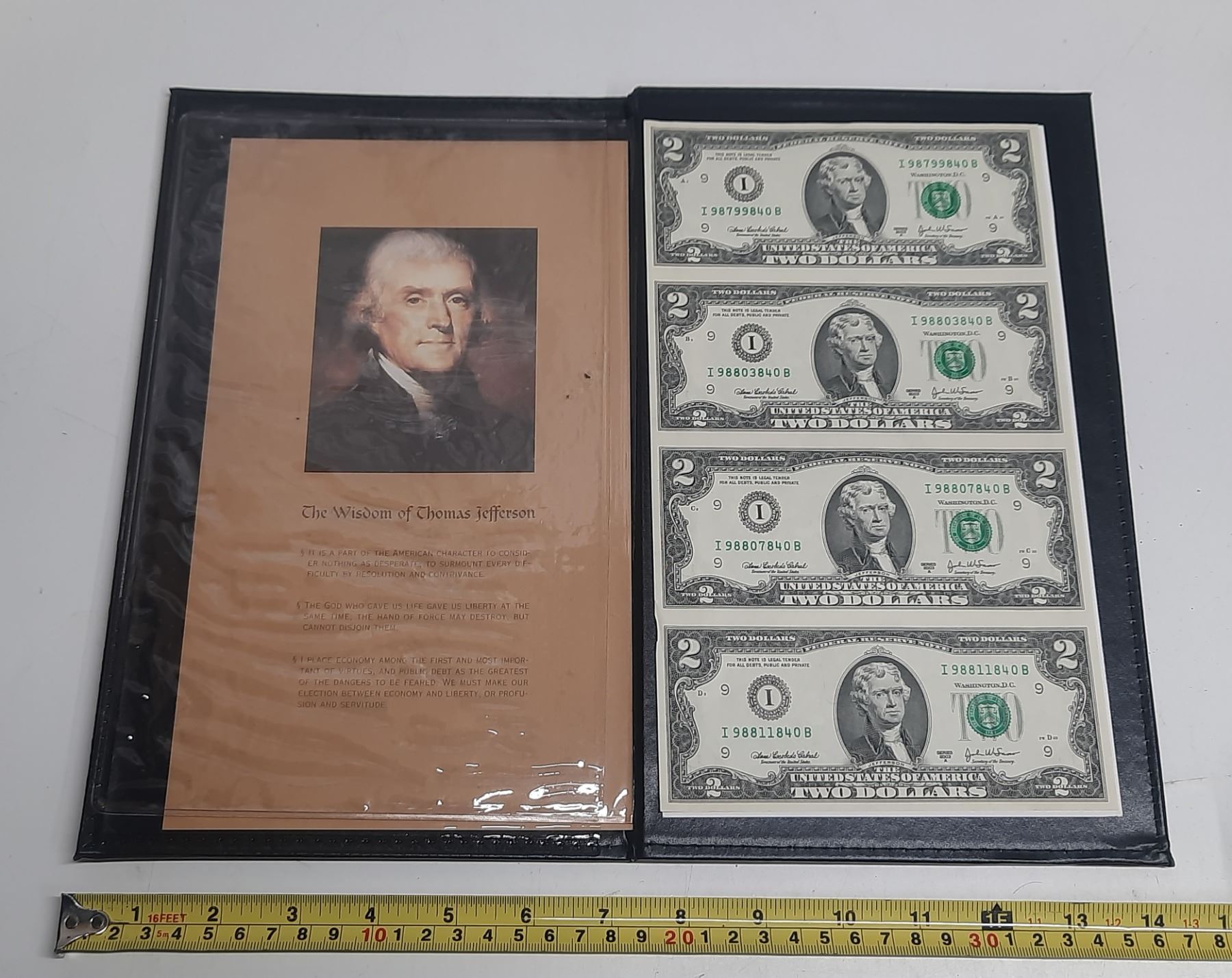 Uncut sheet of 4 U.S. 2003A $2 notes. All depict Thomas Jefferson. Housed in an album.