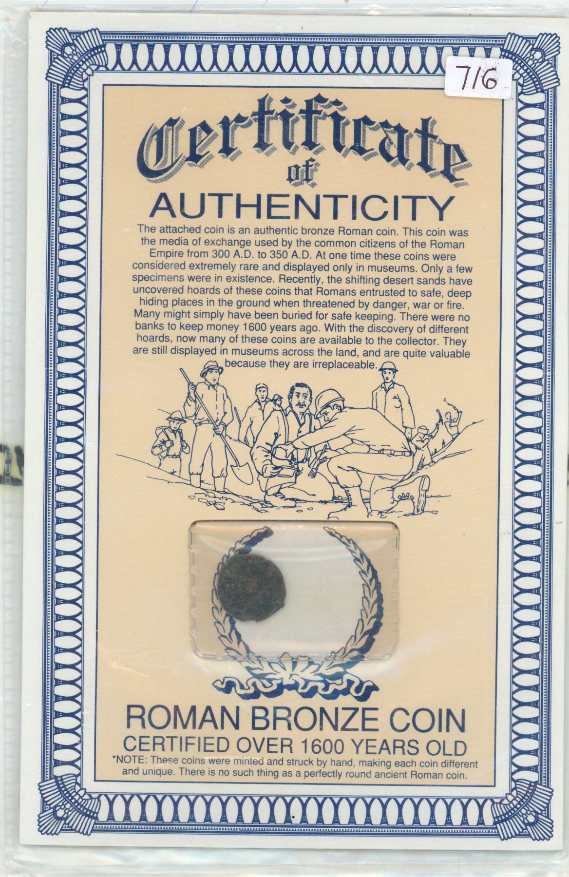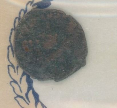 Unidentified Roman bronze coin certified to be over 1600 years old.