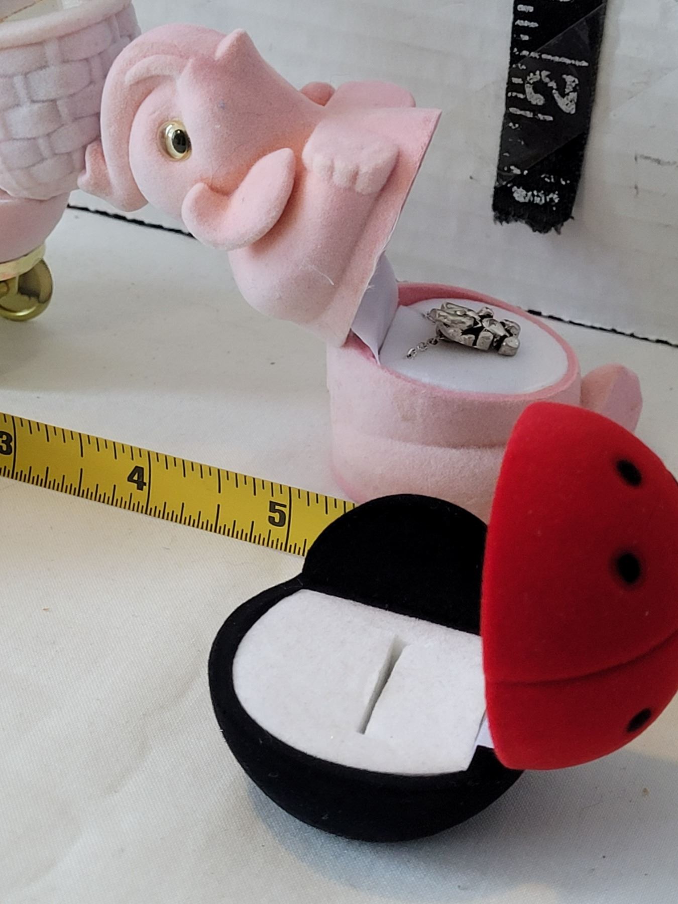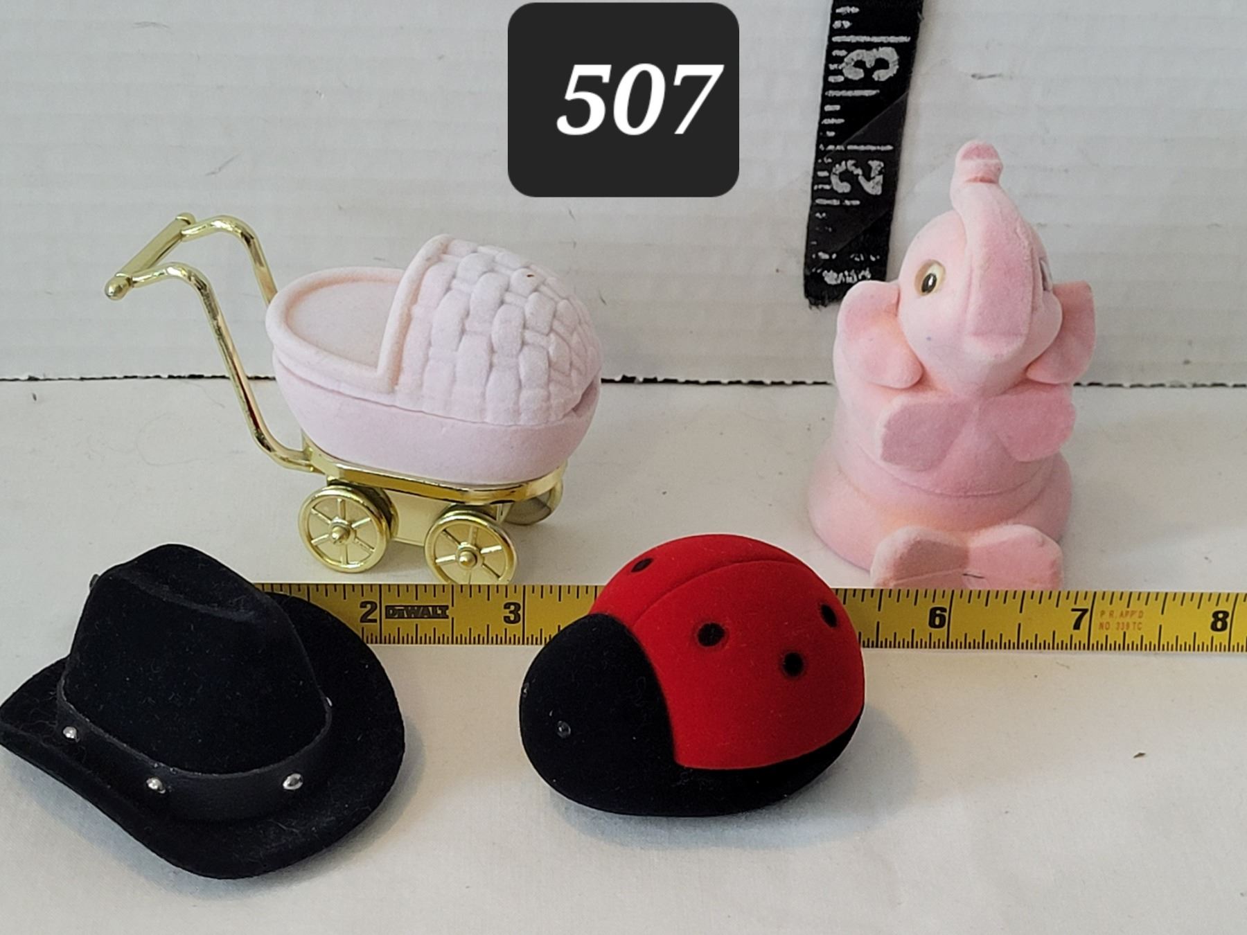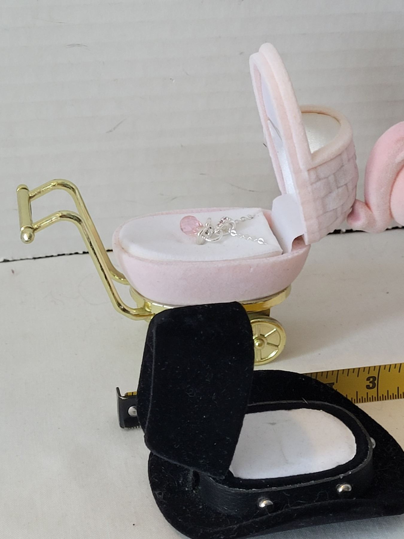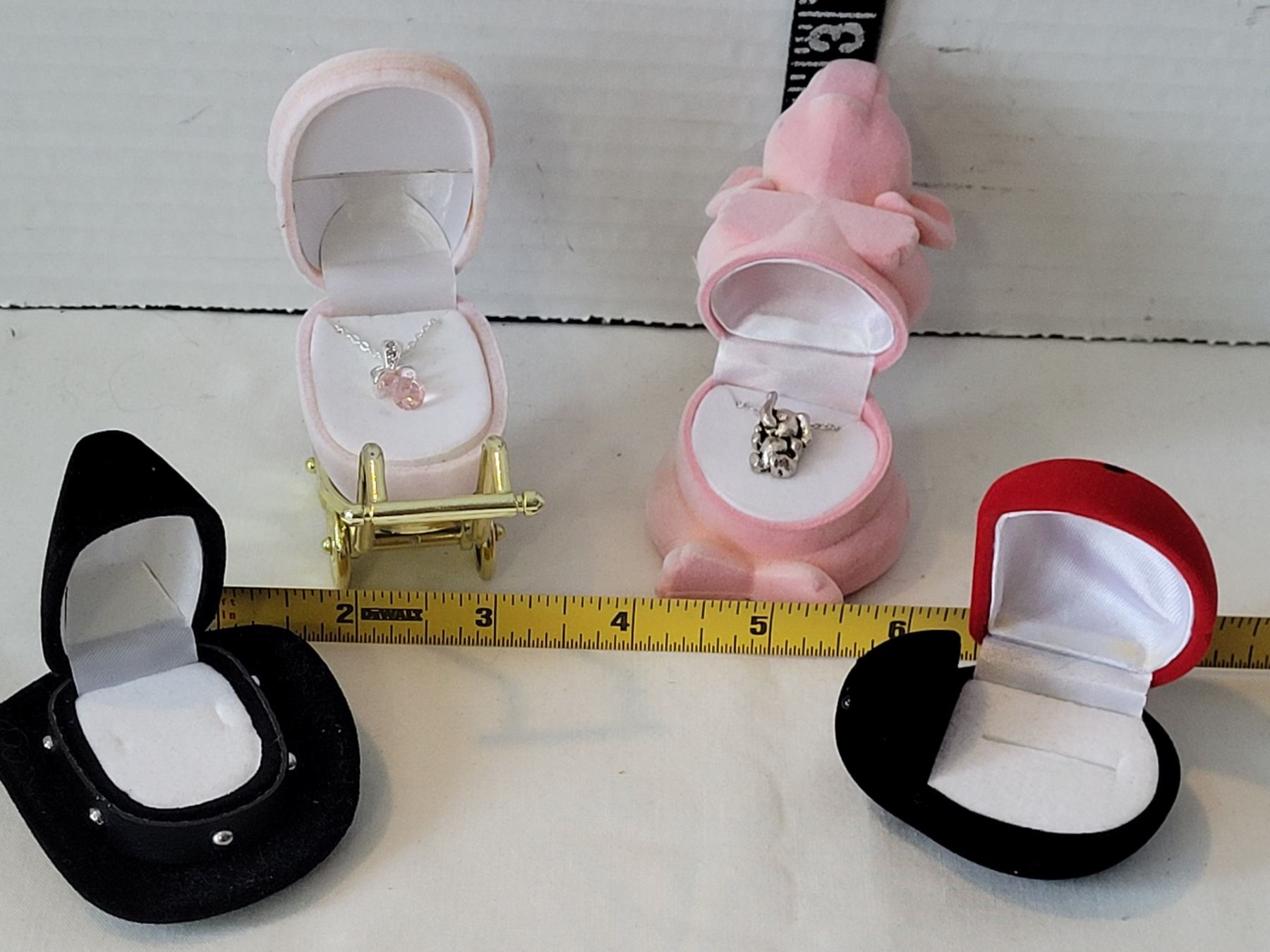Unique gift boxes. Western hat & Lady bug ring boxes. Carriage & elephant each with chain & pendant.