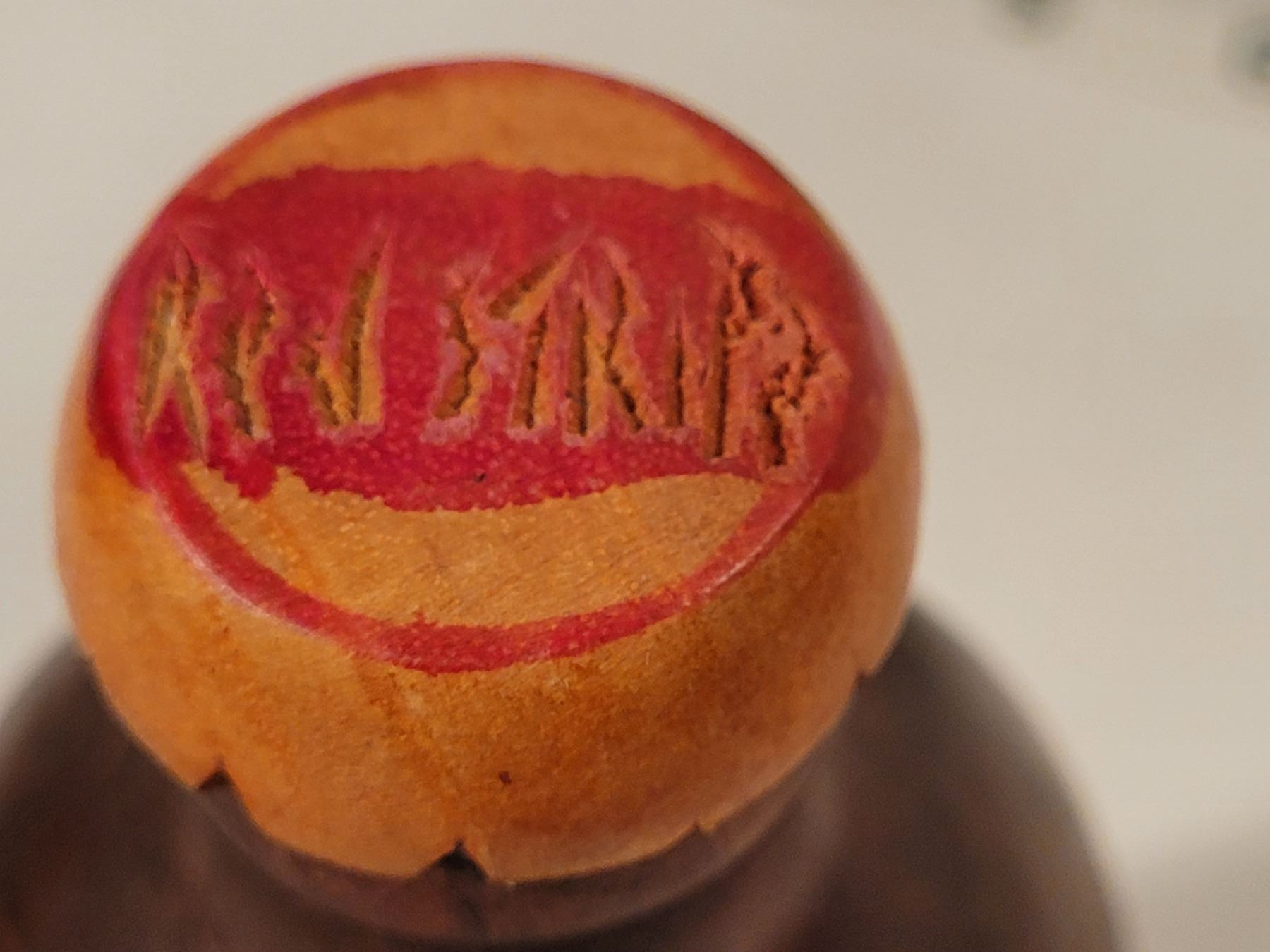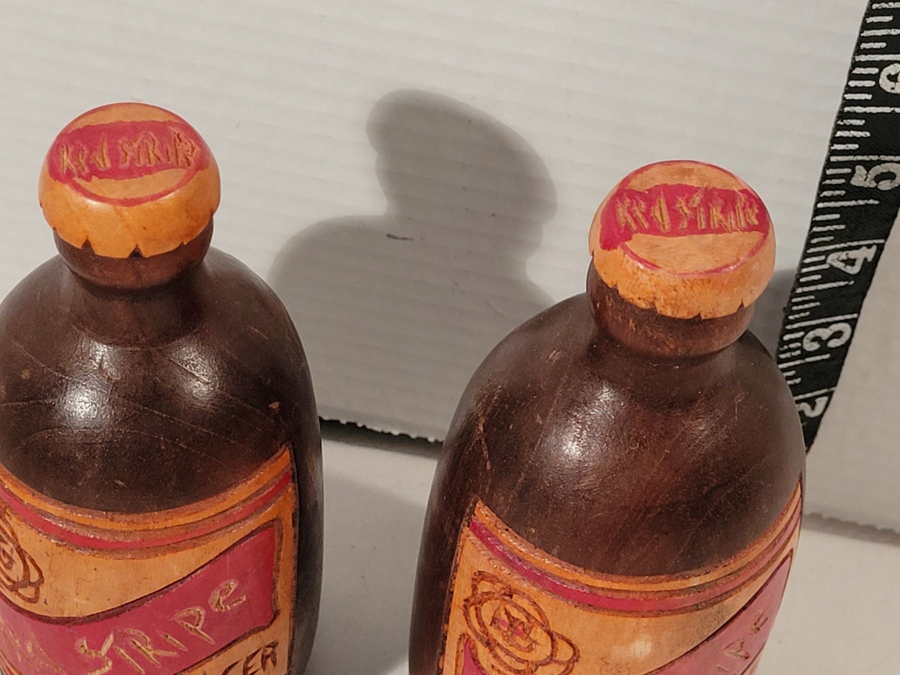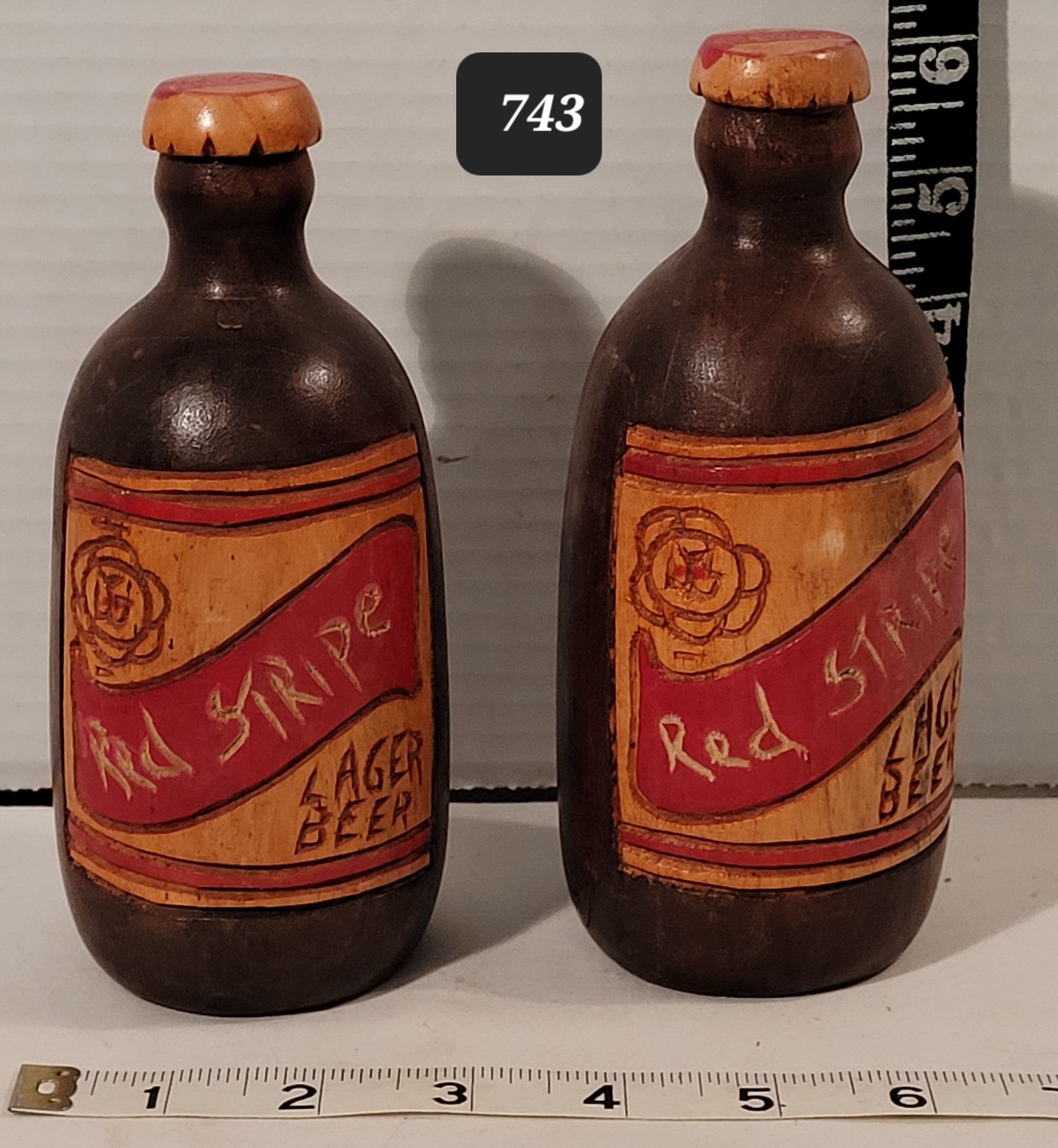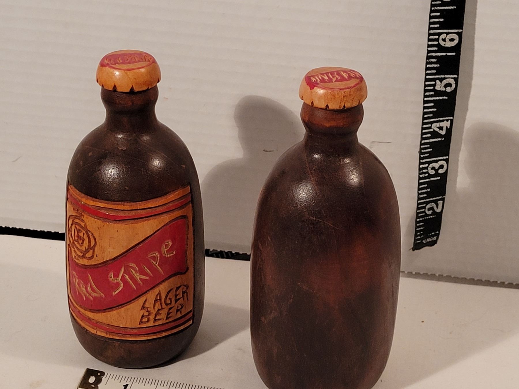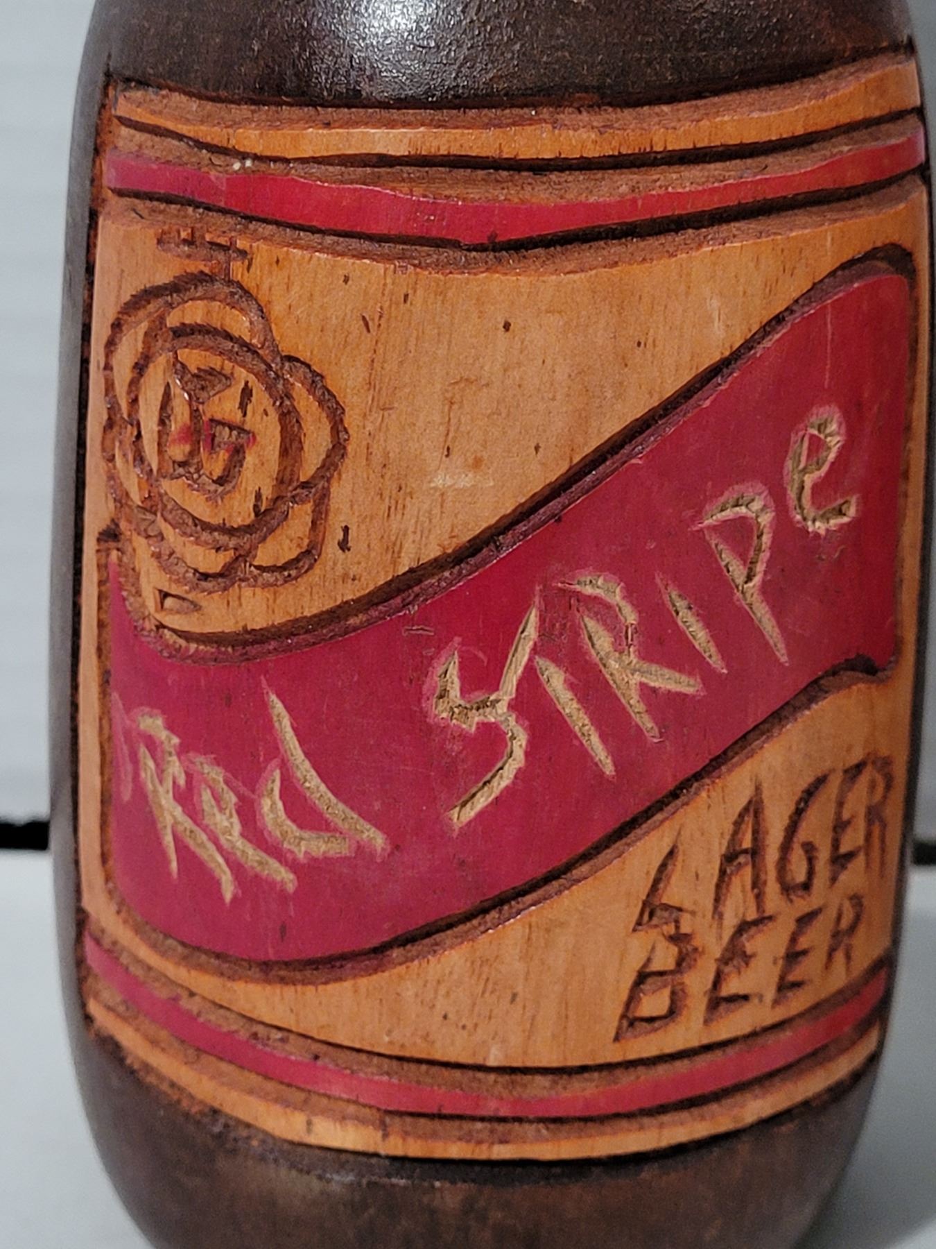 Unique & handmade wood Red Stripe Lager beer bottles.
