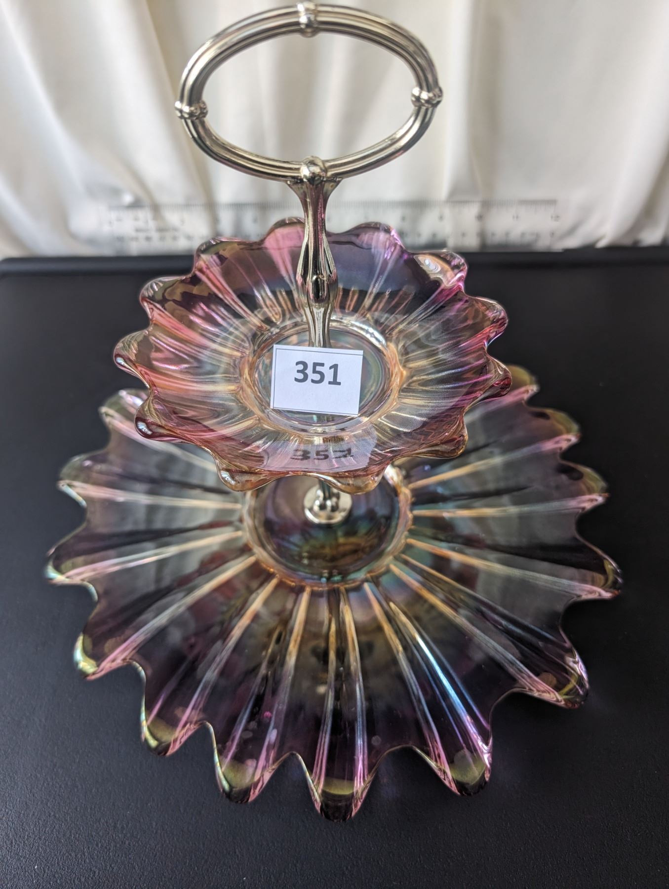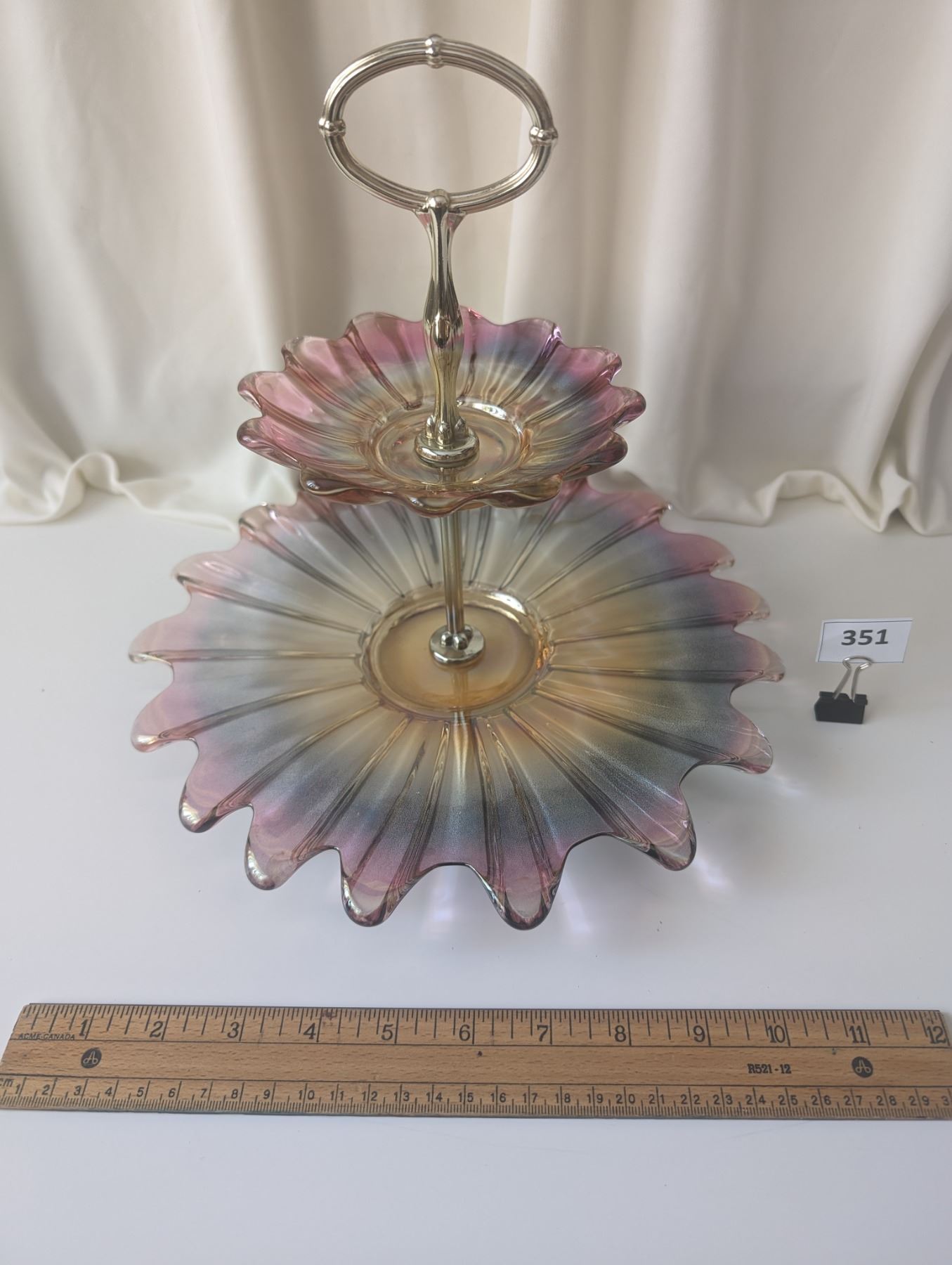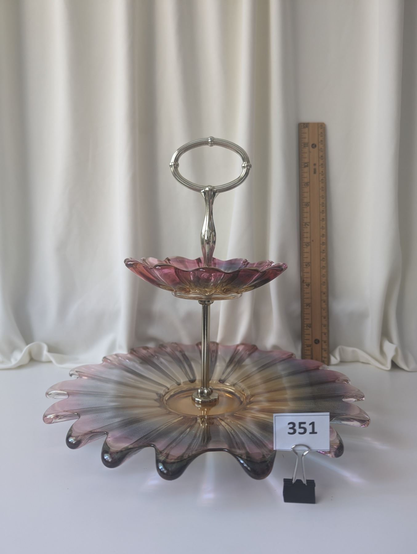 Unique vintage 2 tier cake stand federal glass celestial marigold and purple. Approx. 10.5" tall by 11" wide.