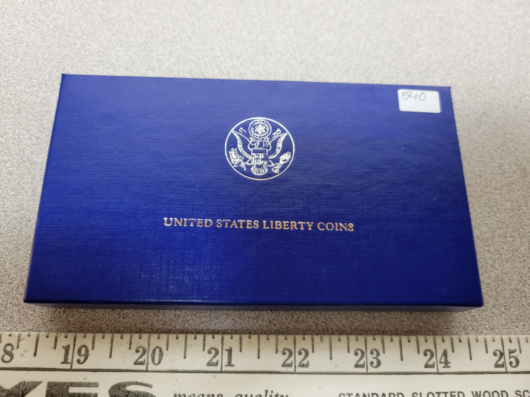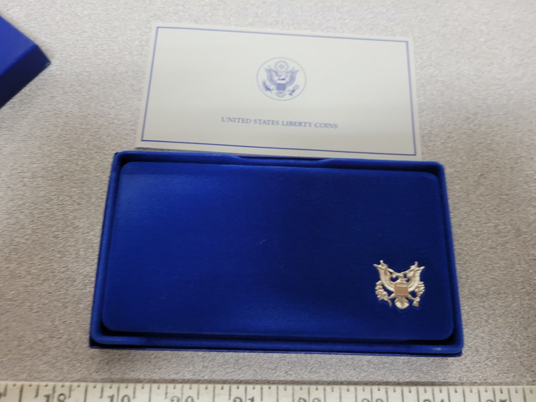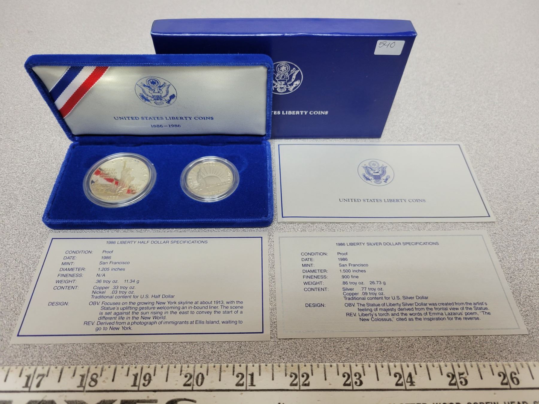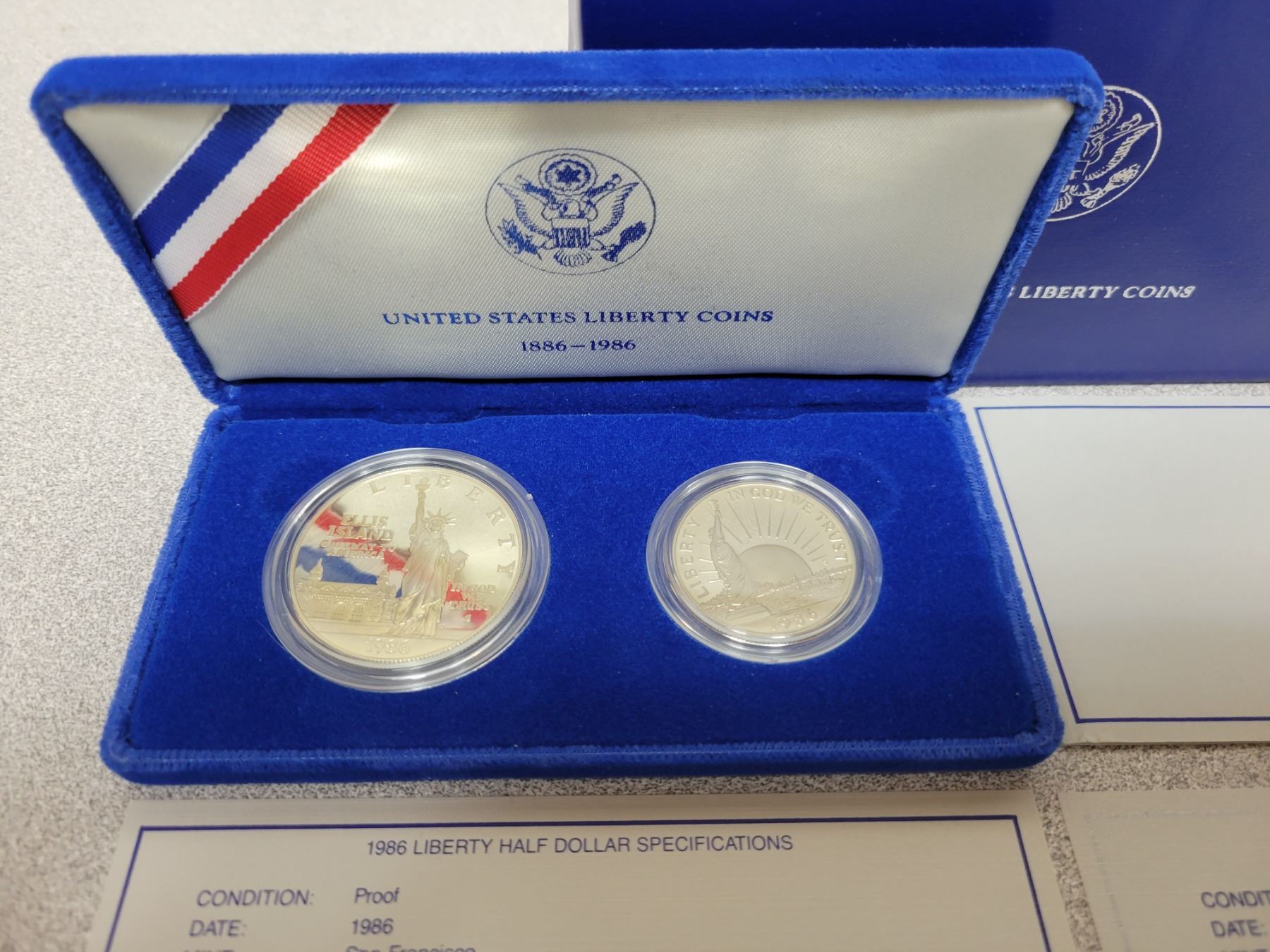 United States Liberty Coins 1886 – 1986. Includes Proof 1986 San Francisco Mint Statue of Liberty Half Dollar and Proof 1986 San Francisco Mint Ellis Island Silver Dollar. In case & box of issue.