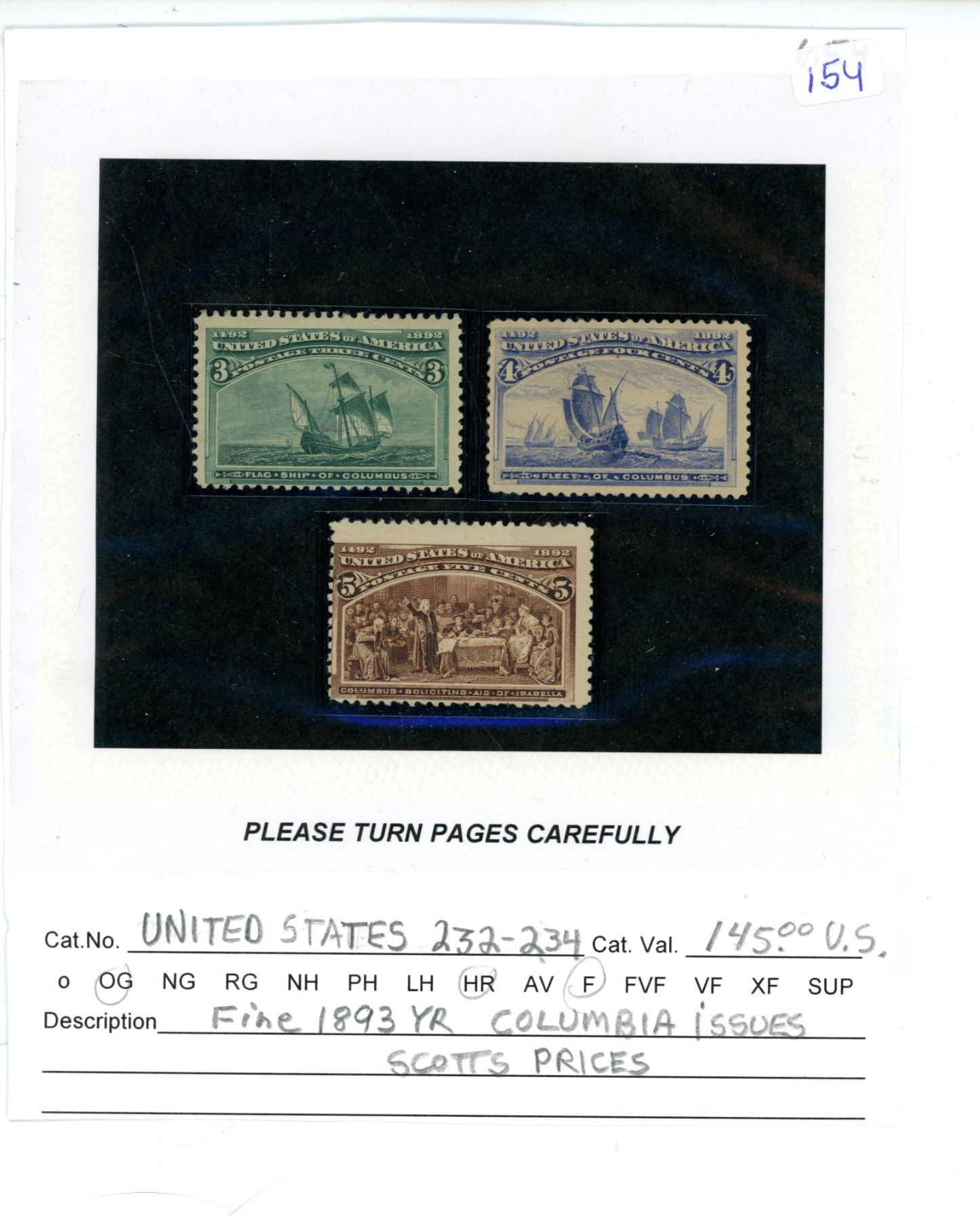 United states 232-234 columbian issues fine mint 1893 year