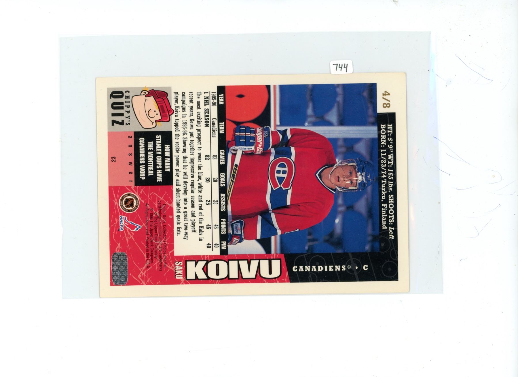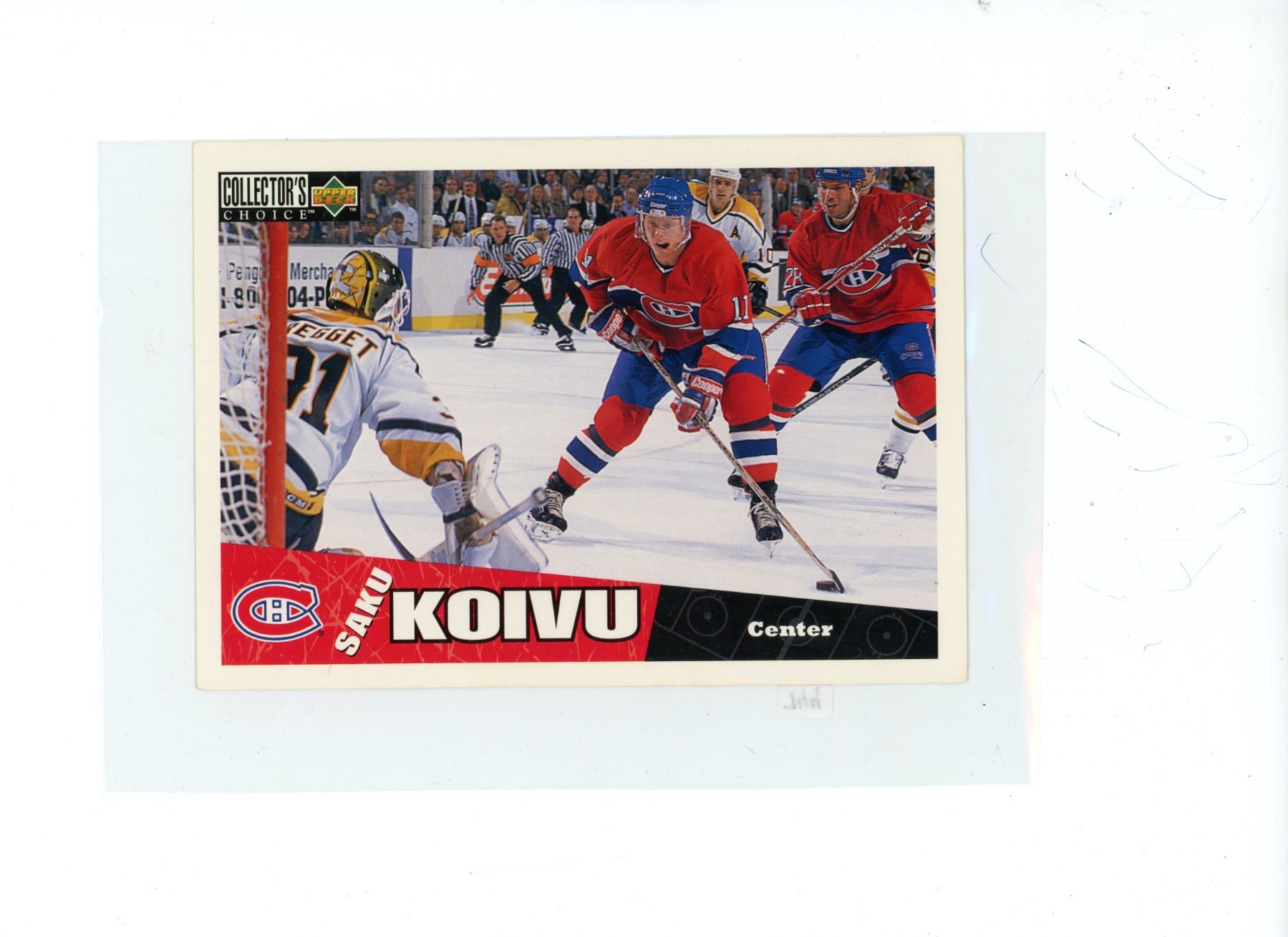 Upper Deck 1996 Saku Koivu, Montreal Canadiens Center Hockey Card. Large card measures 7” X 5”. Mint.