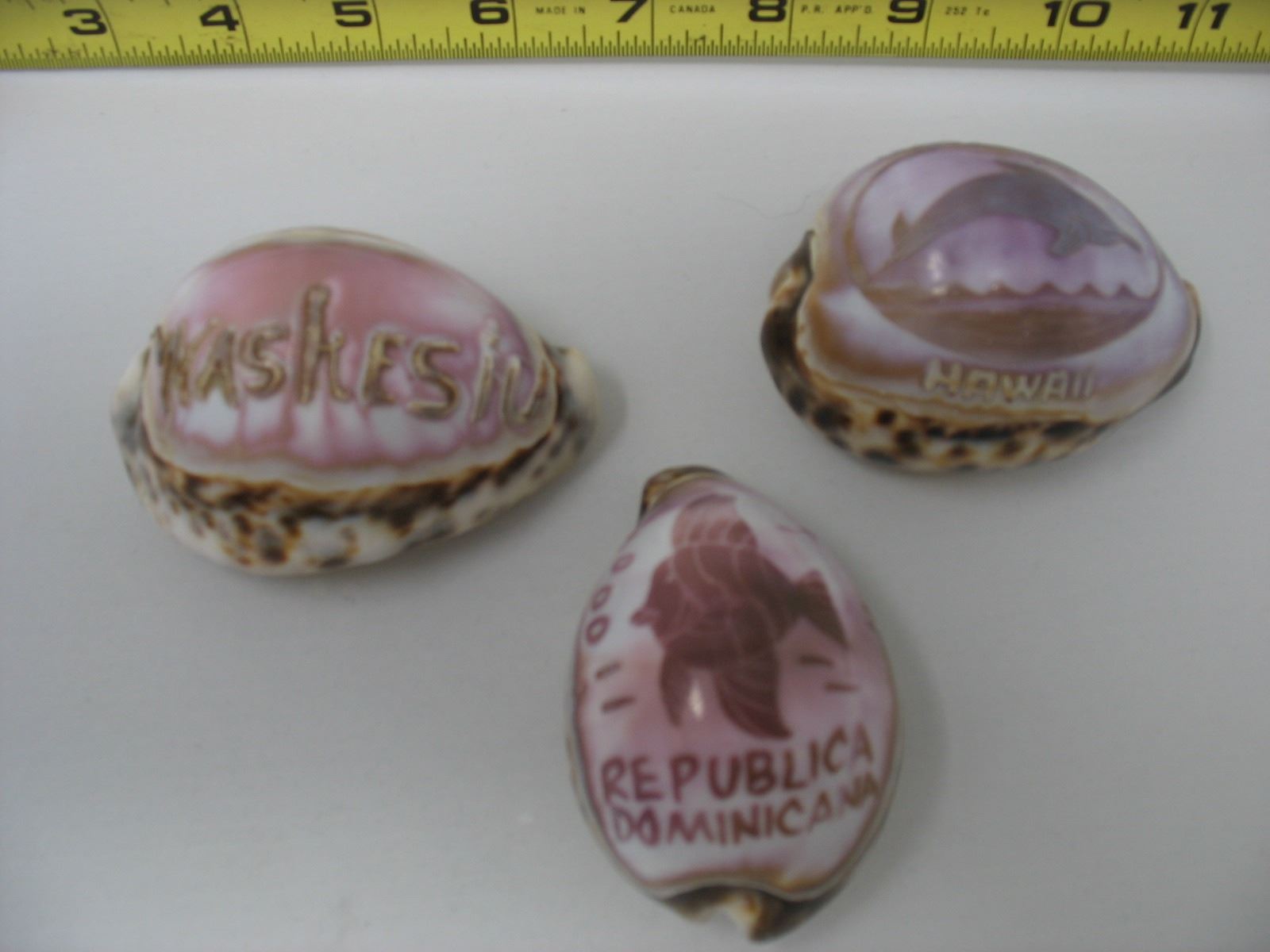 VINTAGE CARVED SEA SHELLS - LOT of 3 - Hawaii, Republic Dominican, Waskesiu