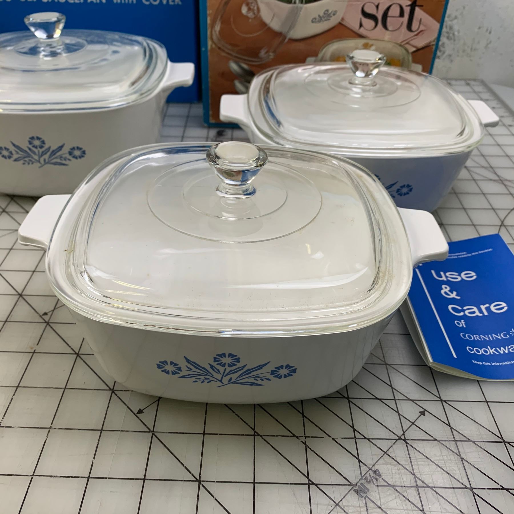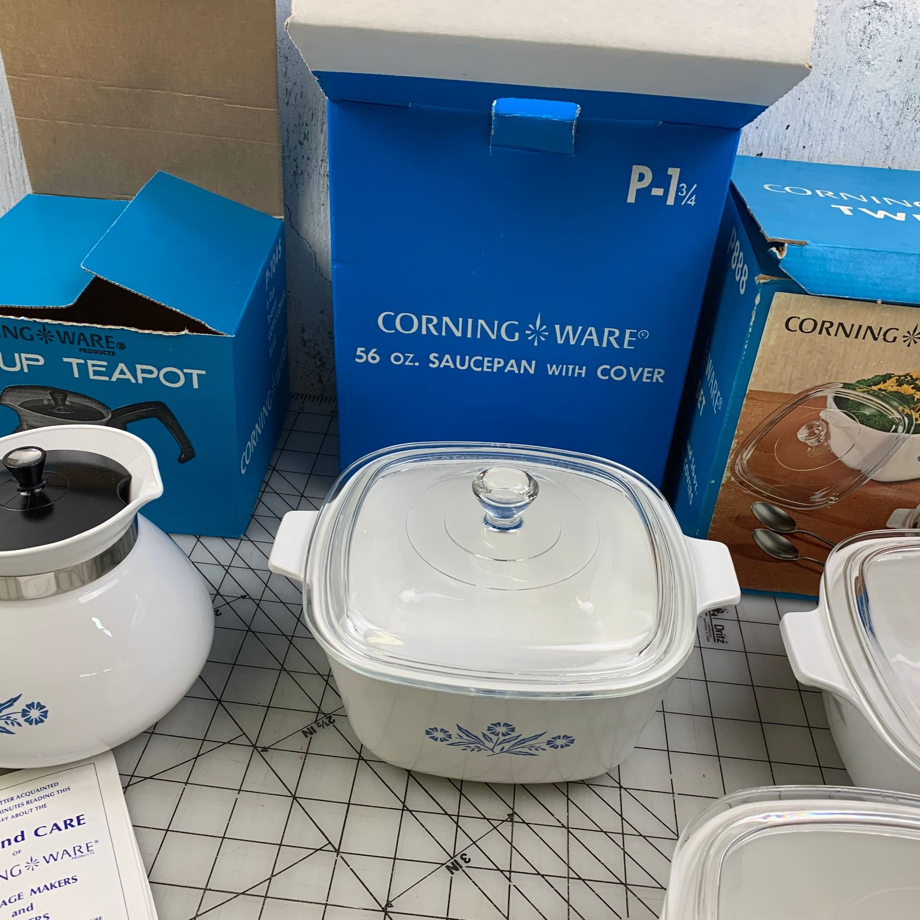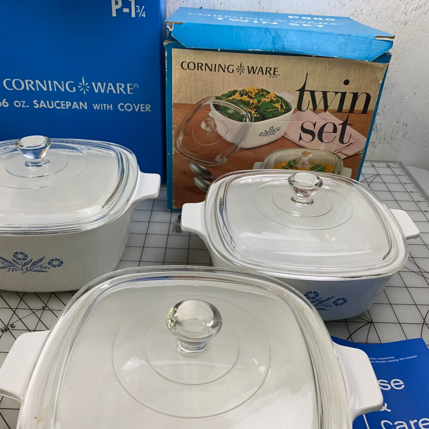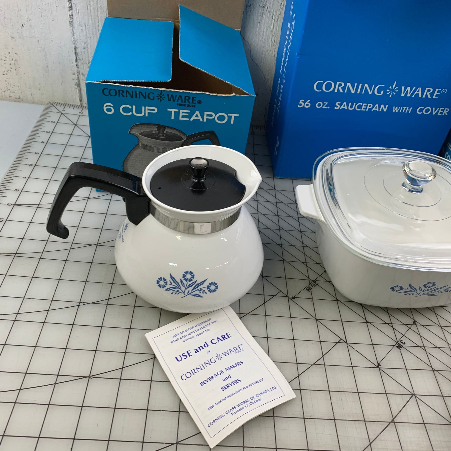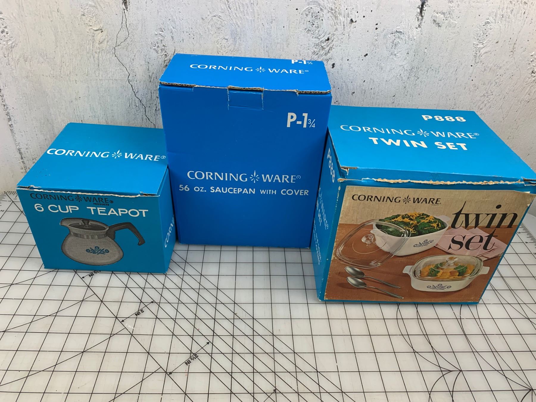VINTAGE CORNING WARE TEAPOT AND SAUCEPANS WITH BOXES