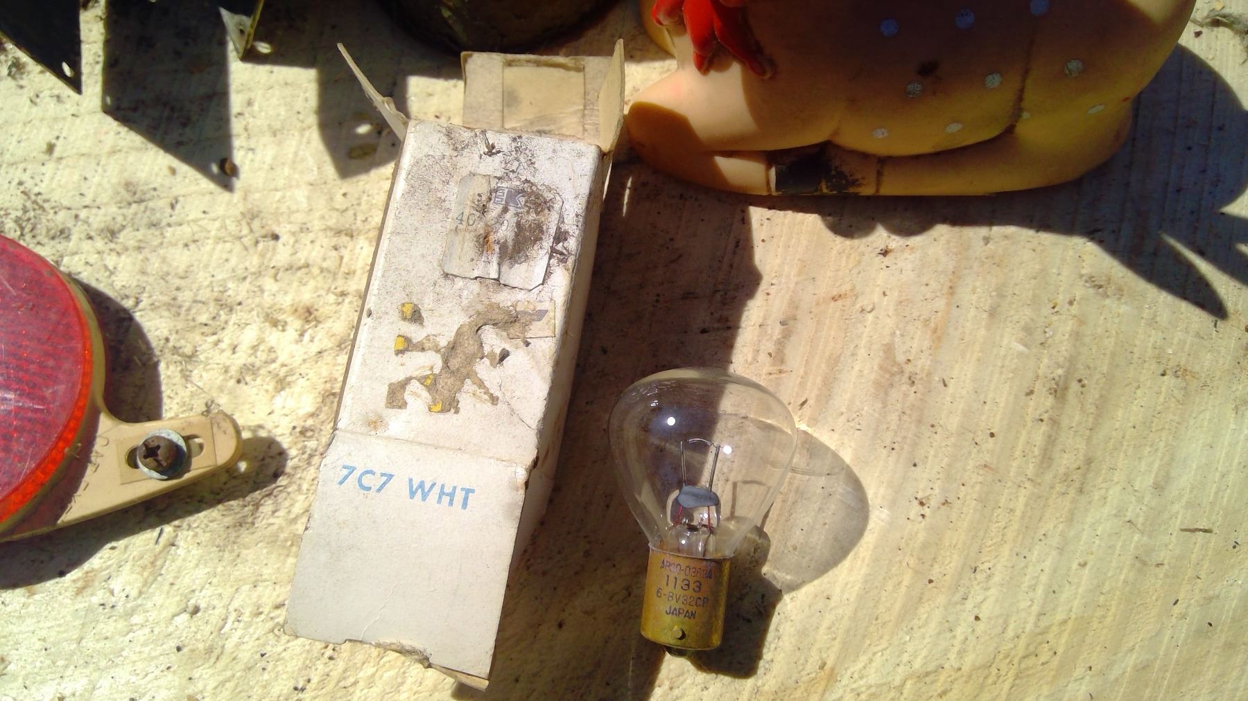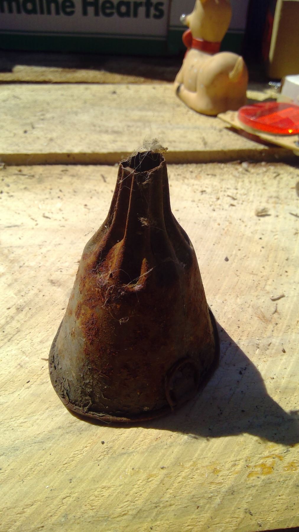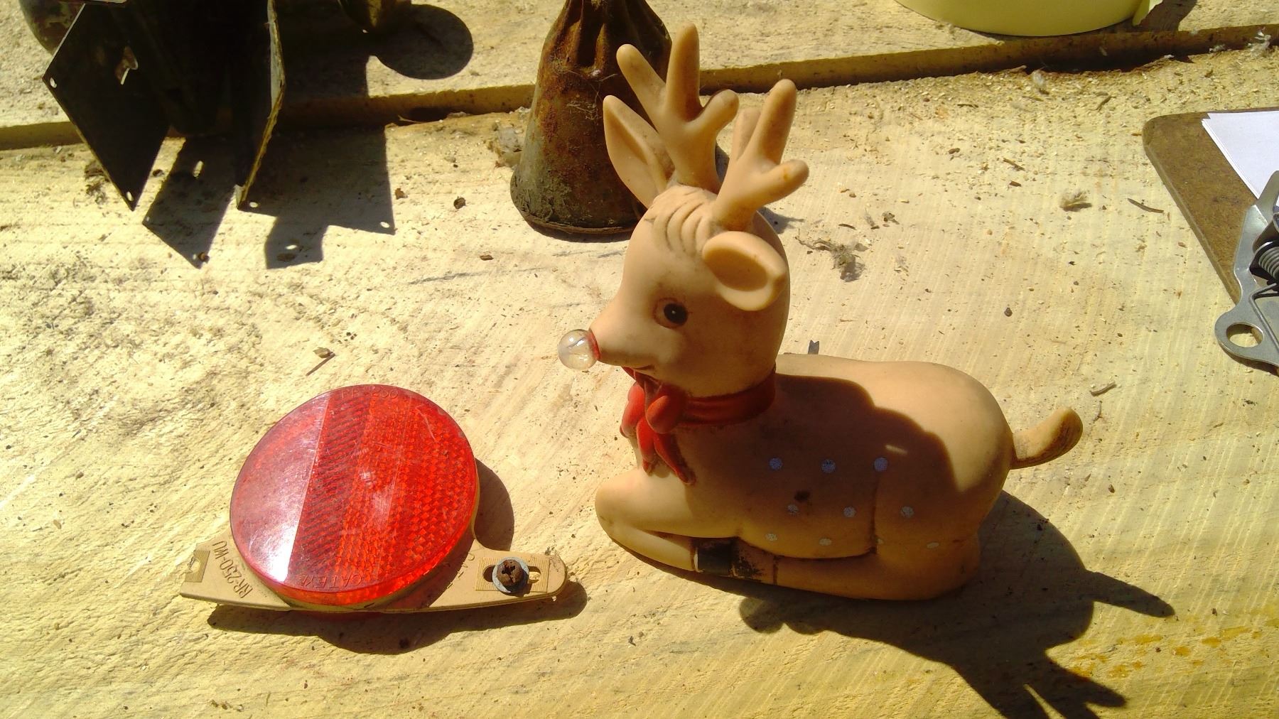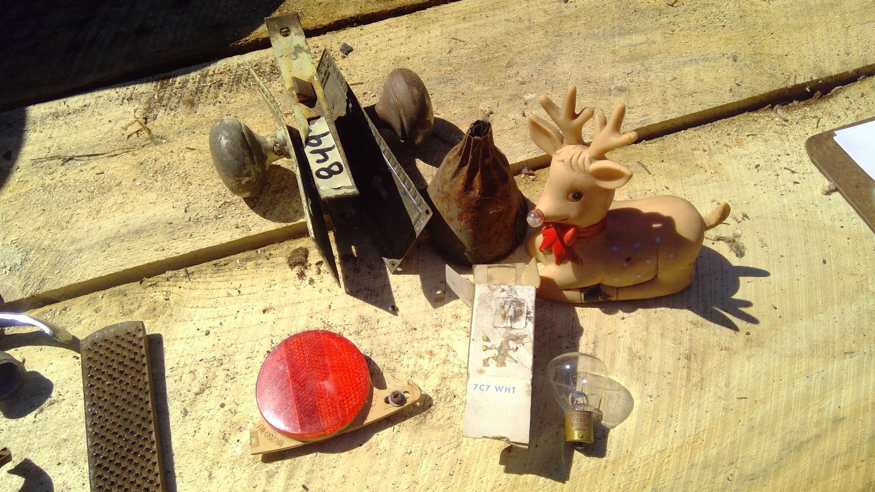 VINTAGE DOORKNOB+OLD FUNNEL+RUDOLPH FIGURE+BIKE DEFLECTOR+6V VINTAGE LIGHT BULB