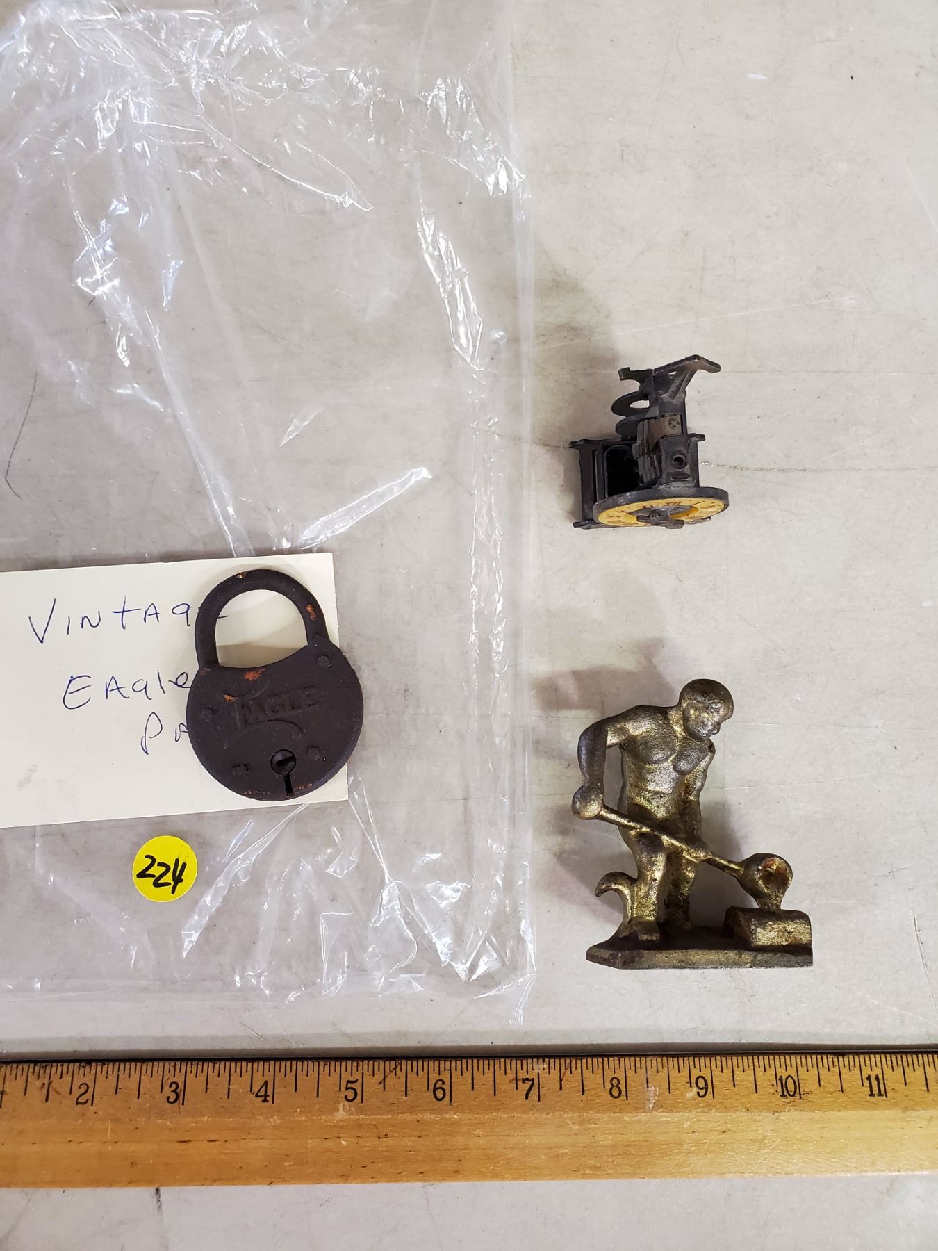 VINTAGE EAGLE PADLOCK (NO KEY), BRASS FIGURINE, PENCIL SHARPERNER (BROKEN)