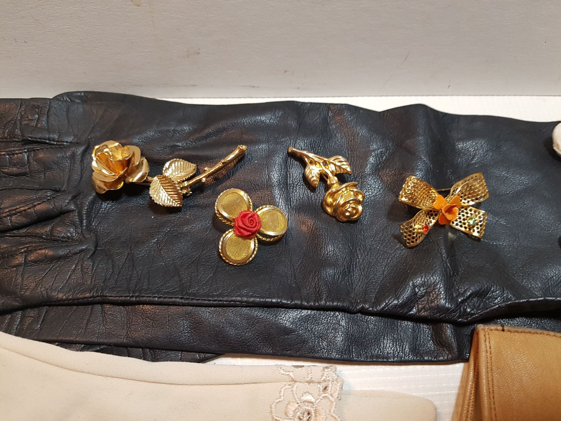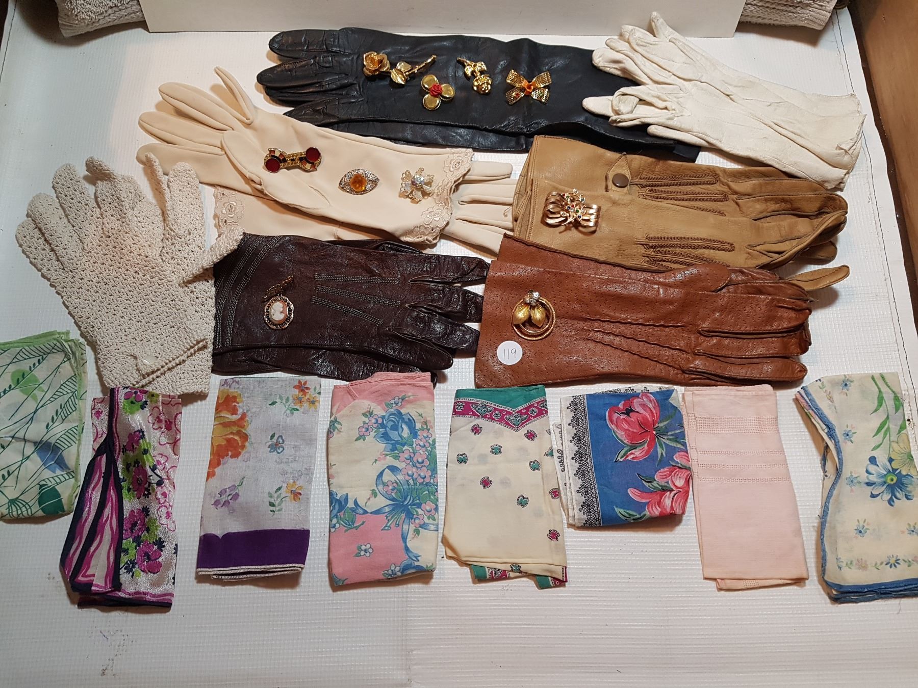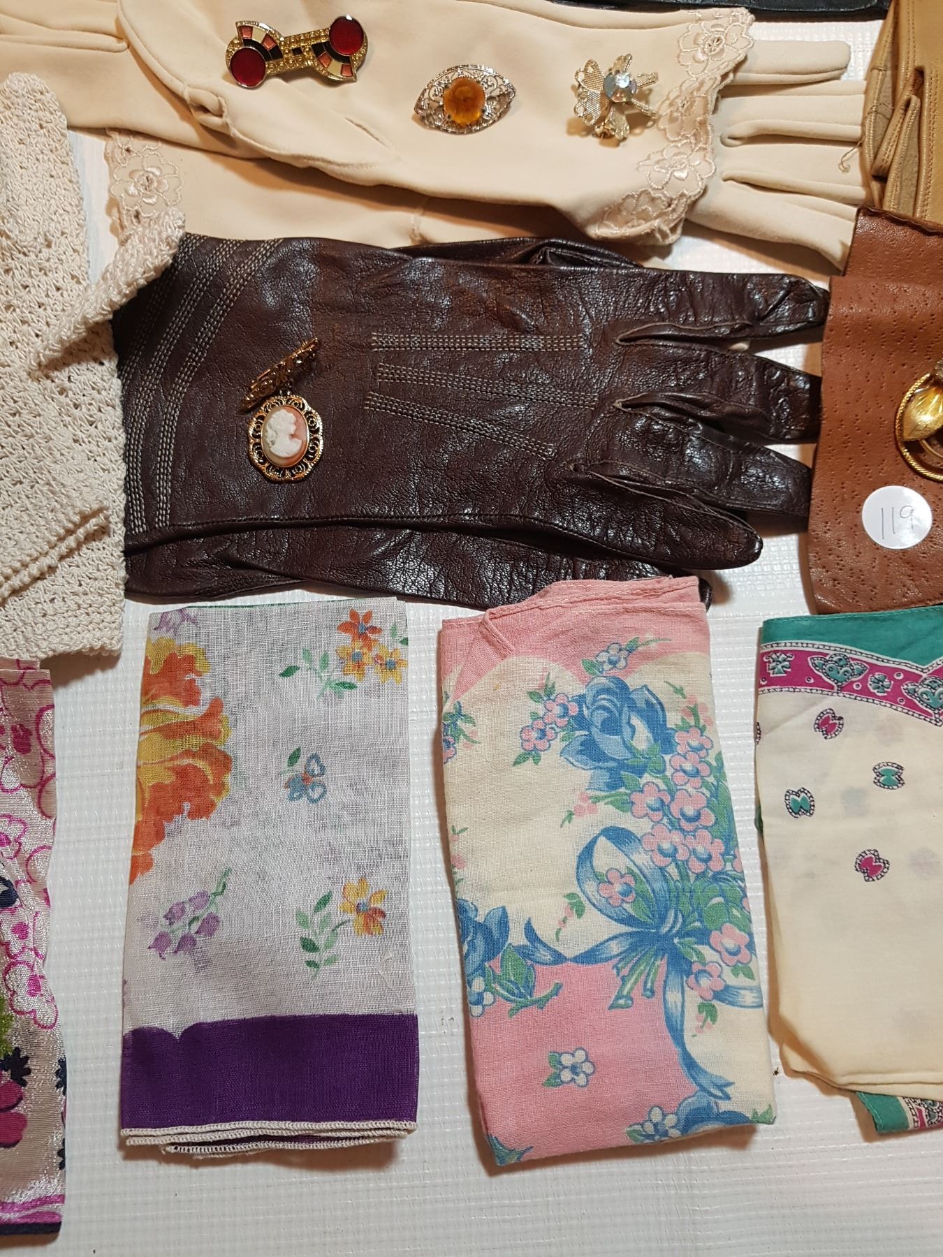 VINTAGE GLOVES, HANDERCHIEFS WITH 10 BROOCHES