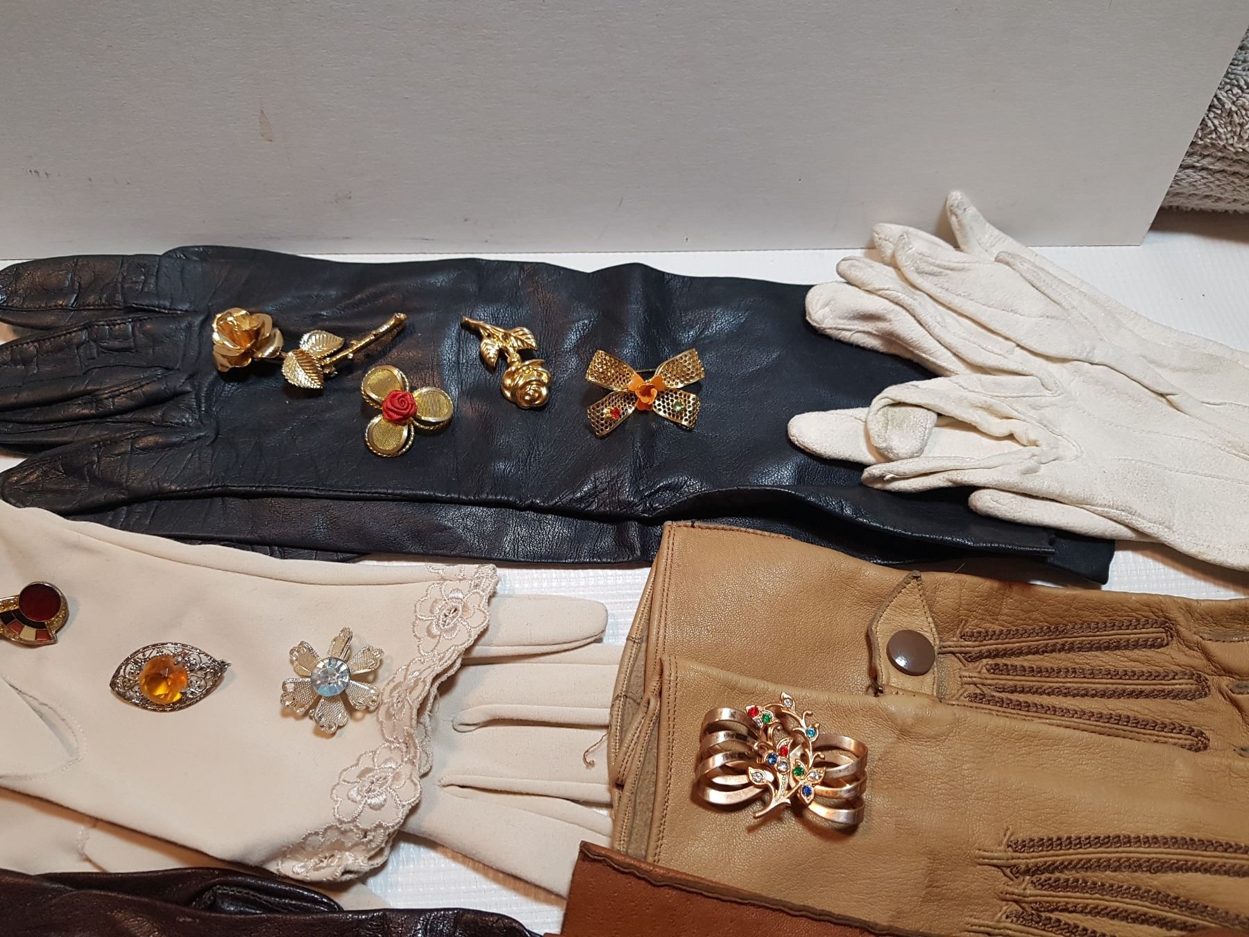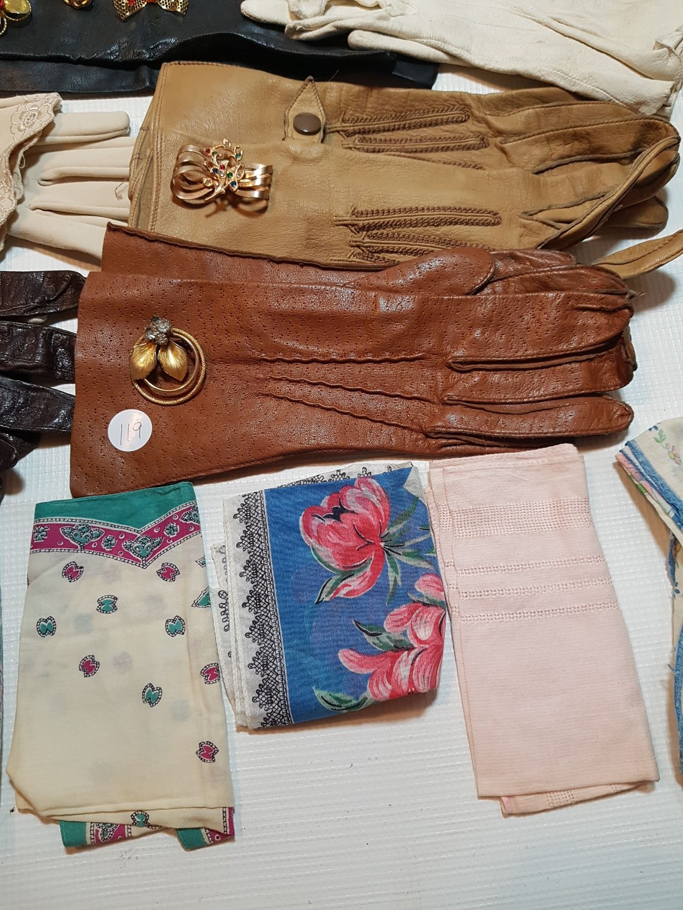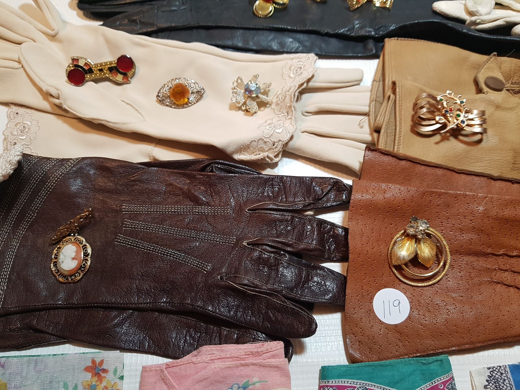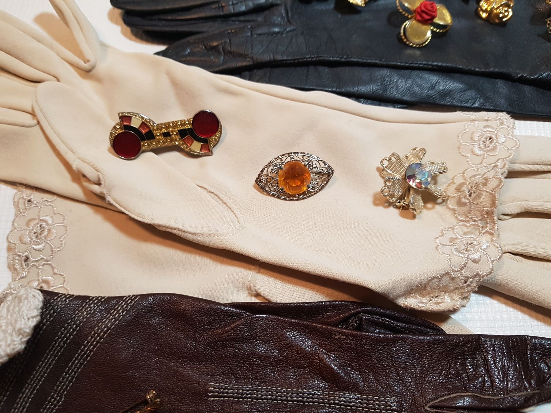 VINTAGE GLOVES, HANDERCHIEFS WITH 10 BROOCHES