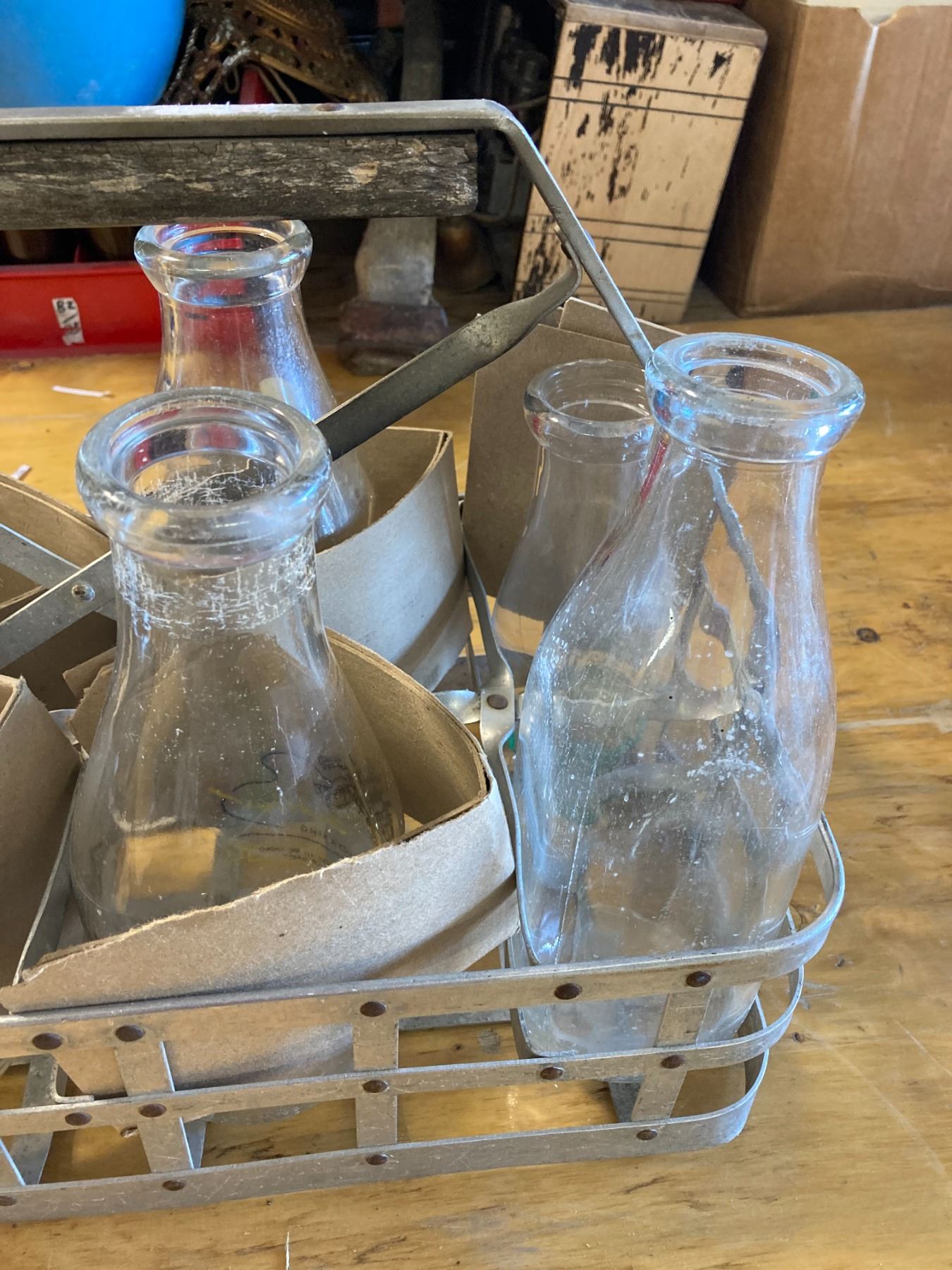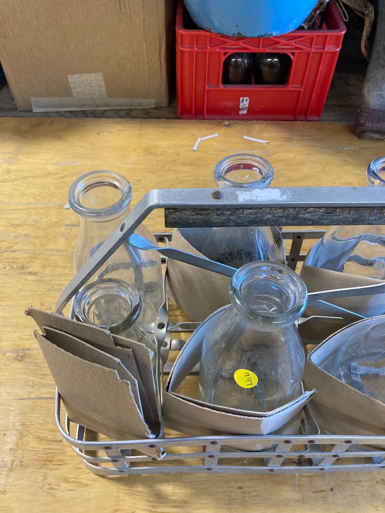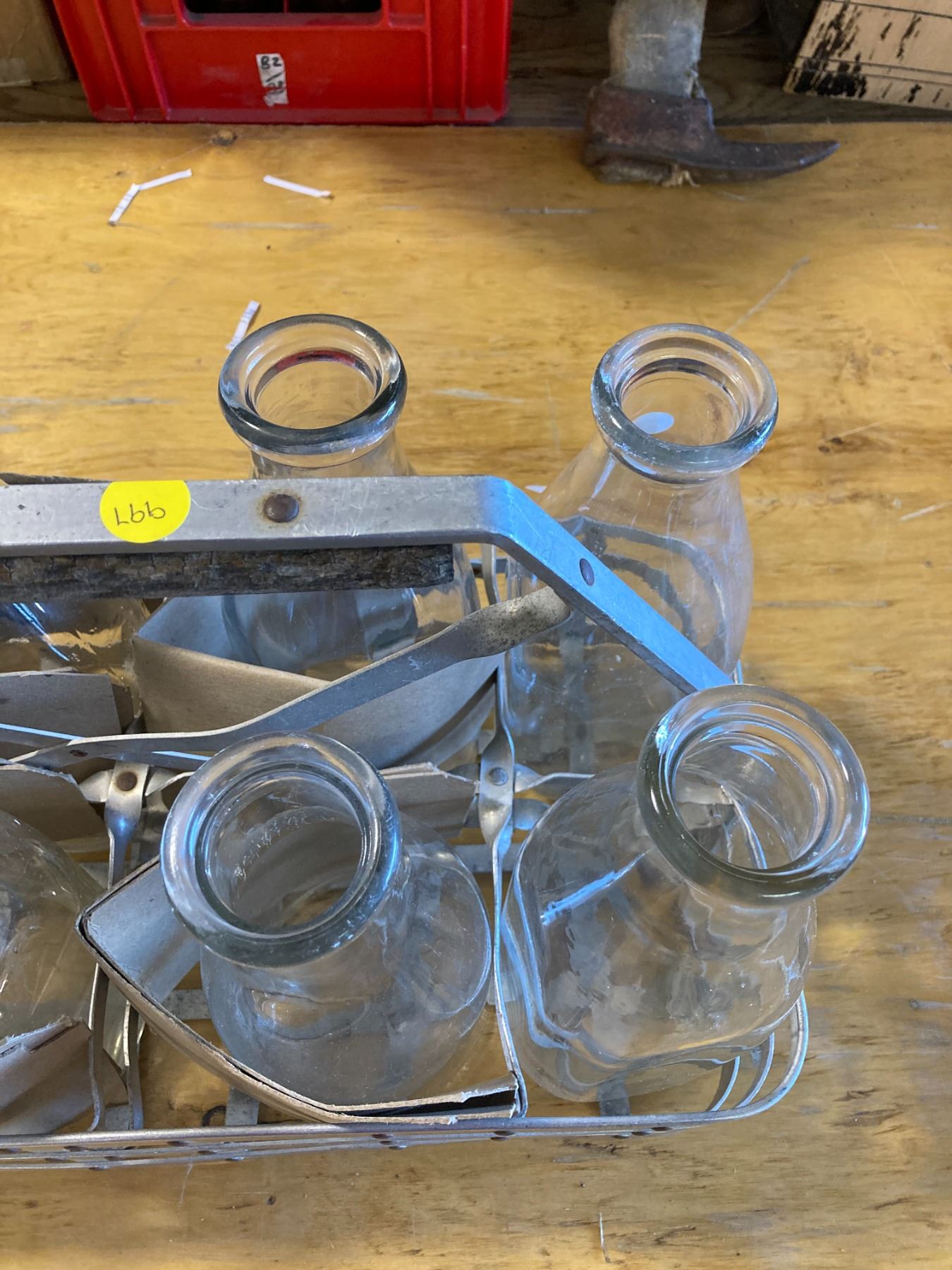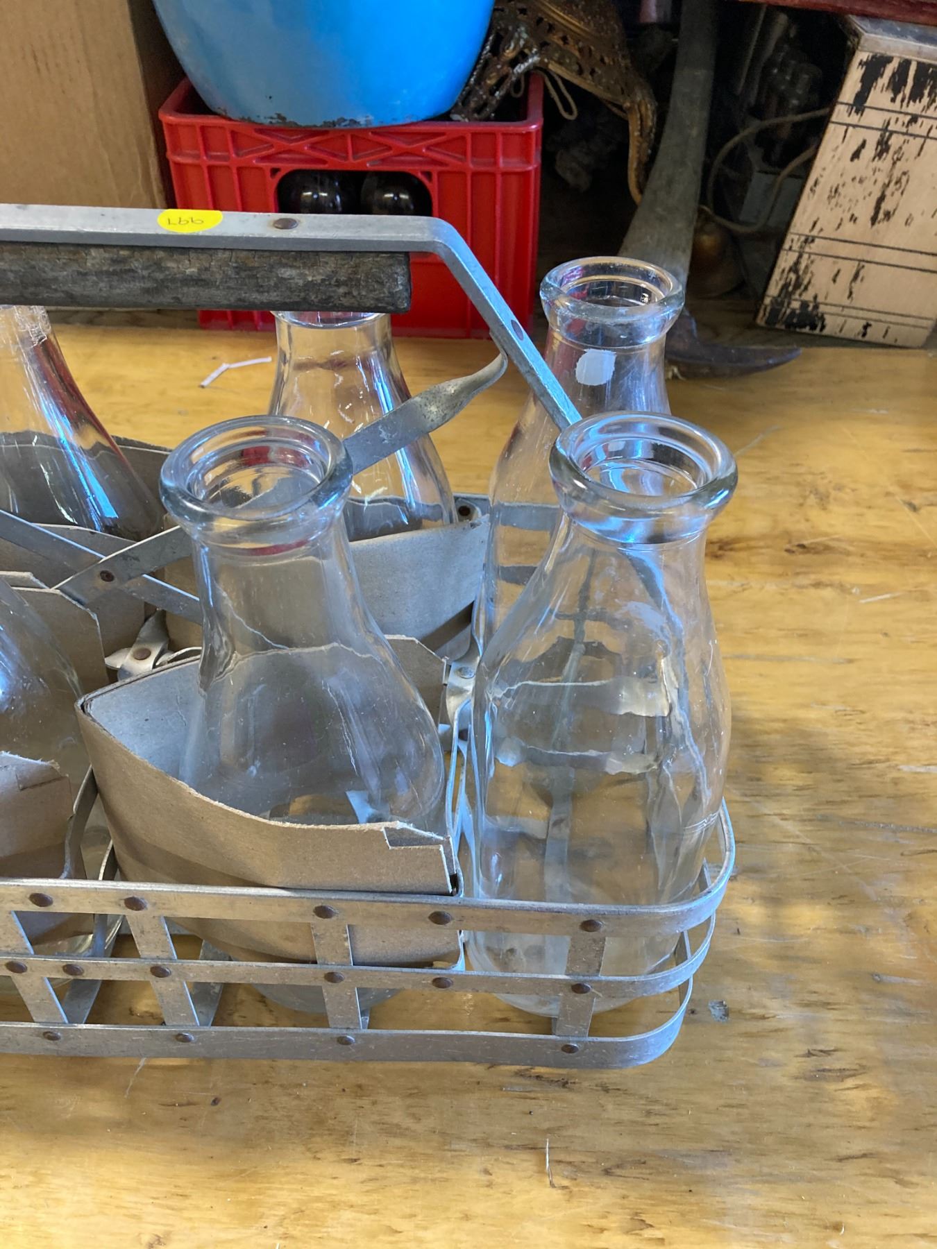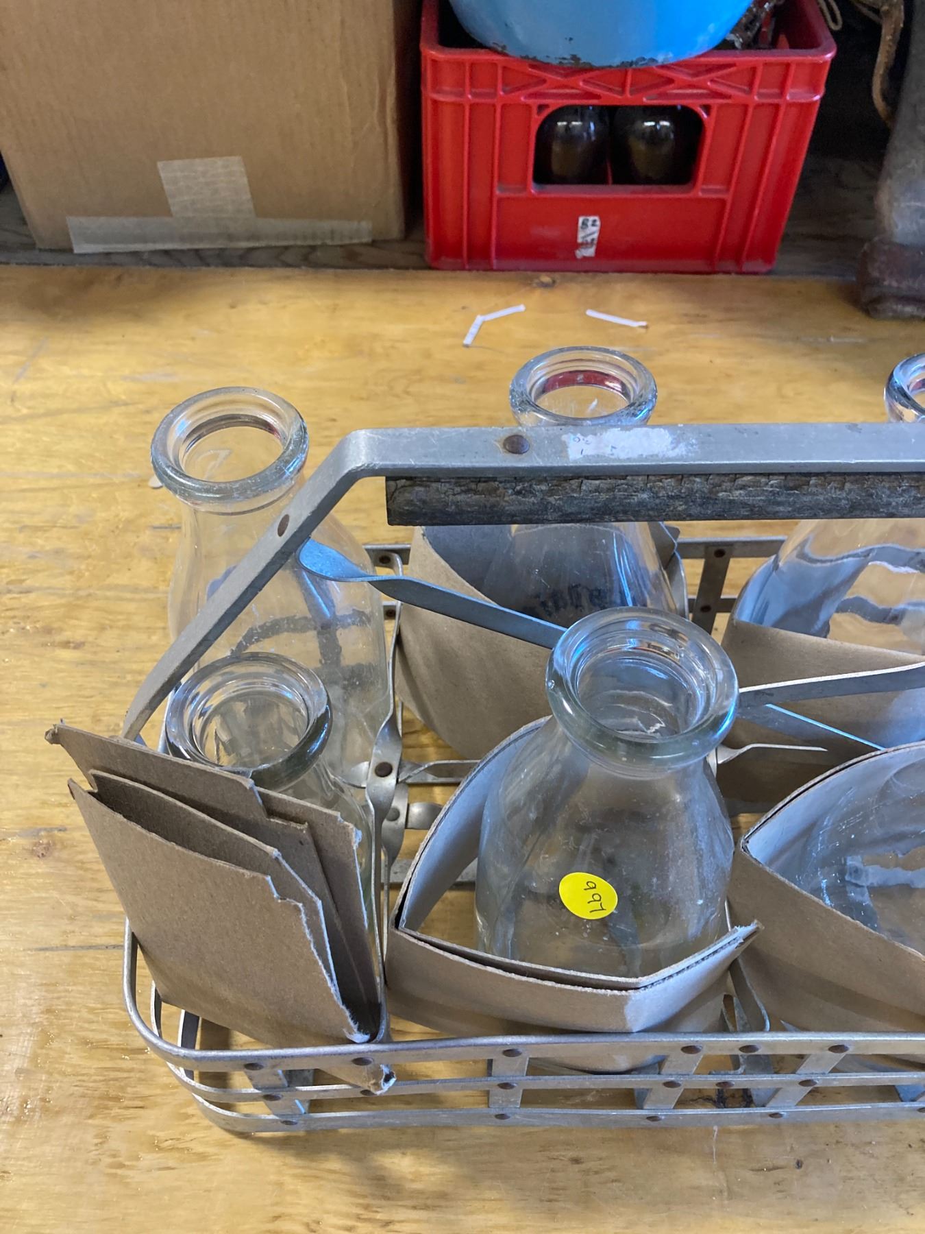 VINTAGE METAL MILK BOTTLE CARRIER WITH 7 QUART BOTTLES AND 1 PINT