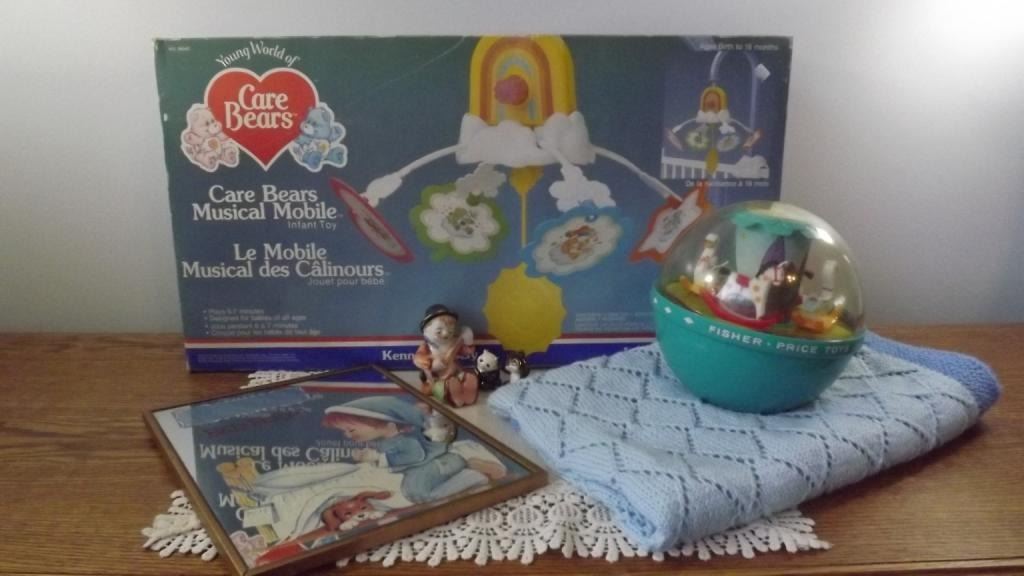 CRIB MOBILE, FISHER PRICE ROLY POLY CHIME BALL, AFGHAN, MIRROR WALL DECORE, ORNAMENTS