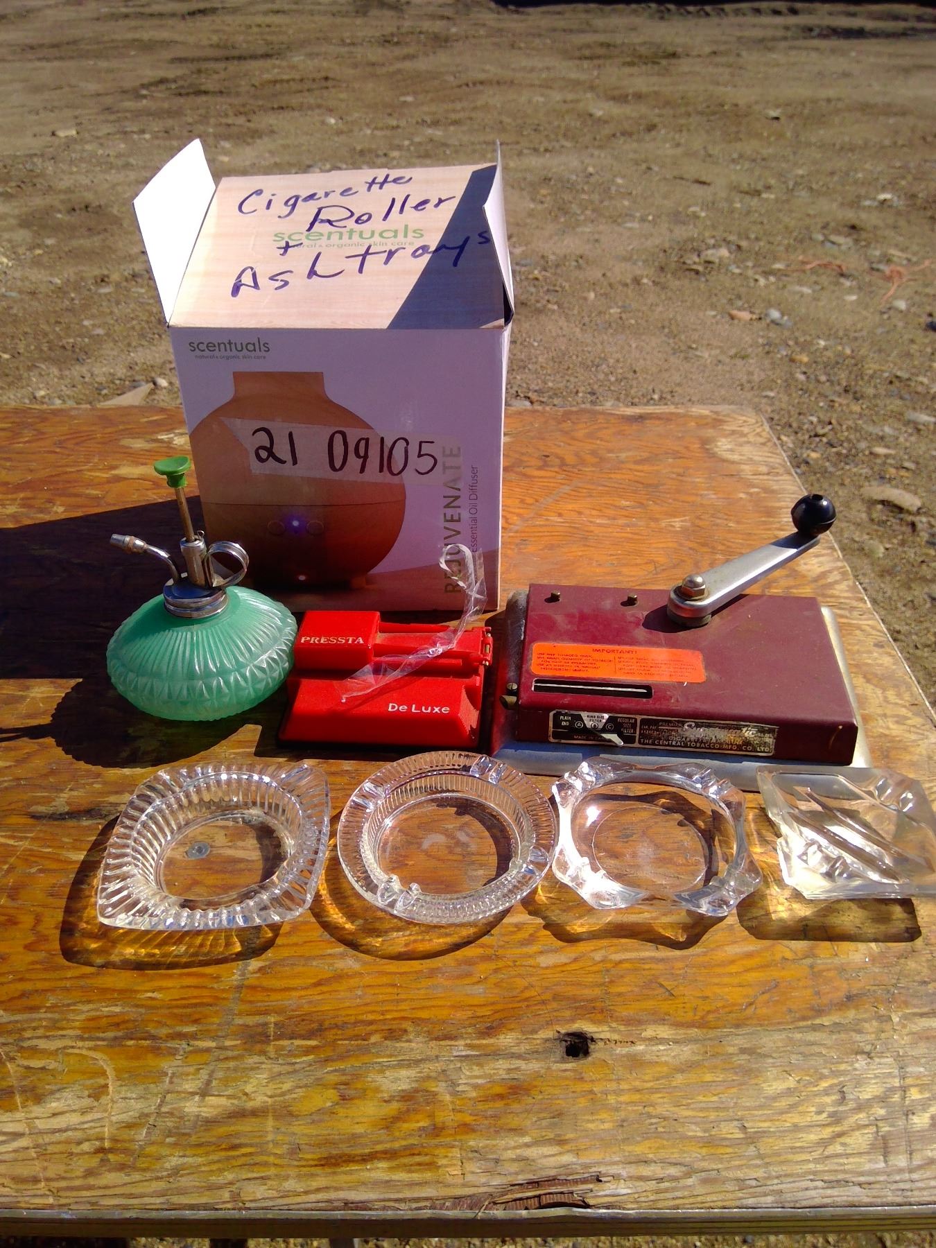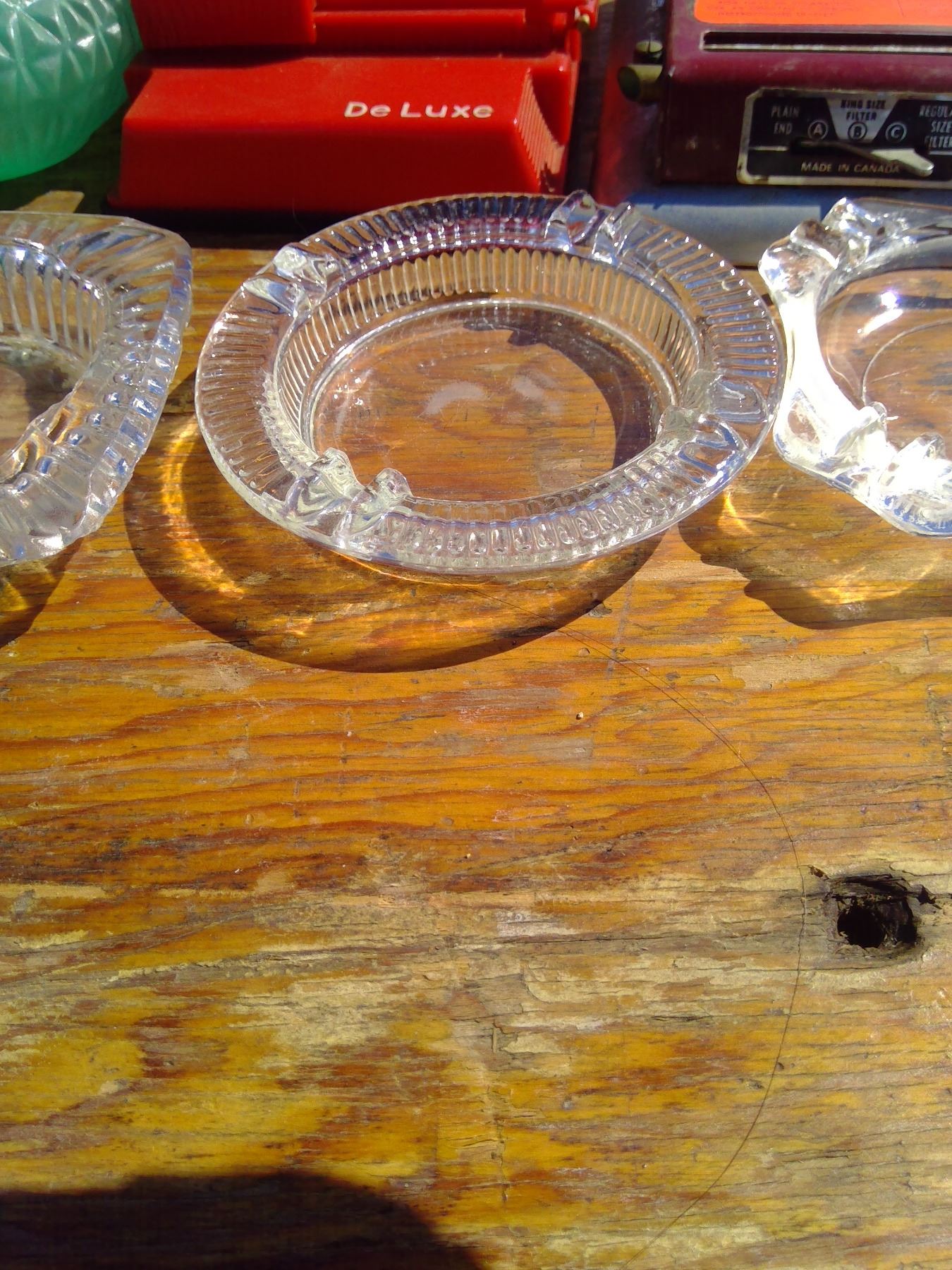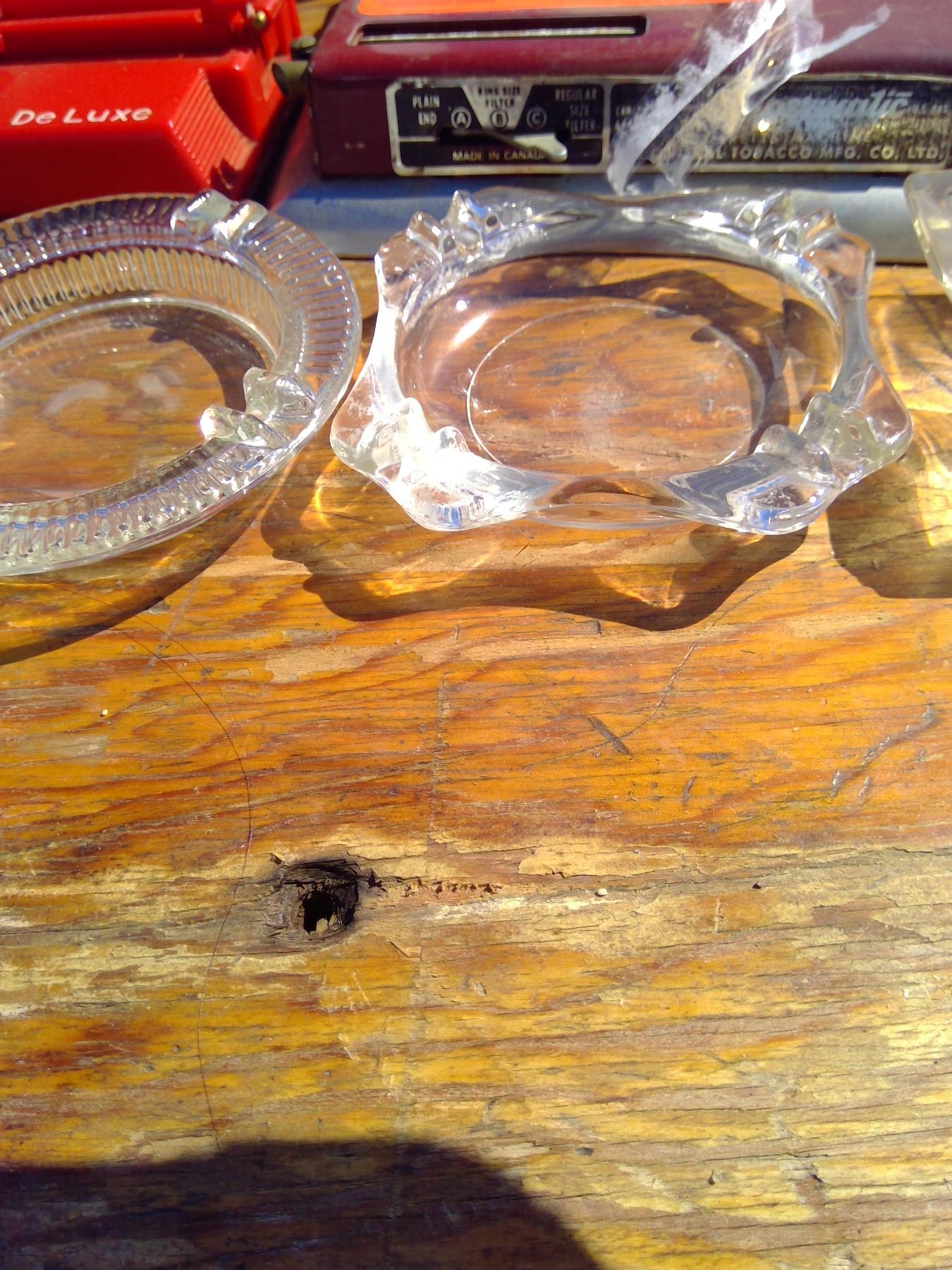 VINTAGE PERFUME BOTTLE + ASHTRAYS + VINTAGE SMOKE ROLLER