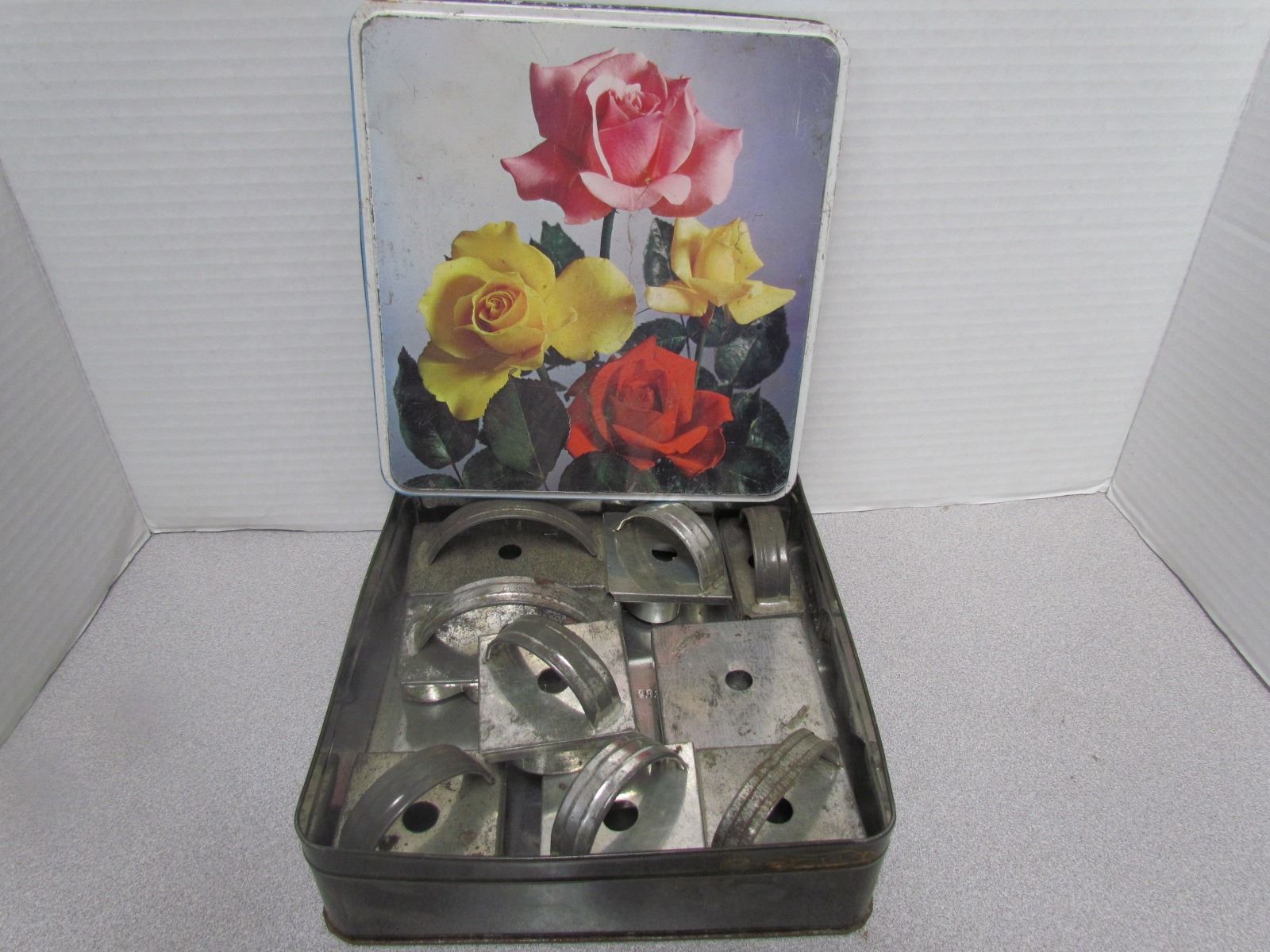 VINTAGE TIN, FULL OF COOKIE CUTTERS, DONUT CUTTERS