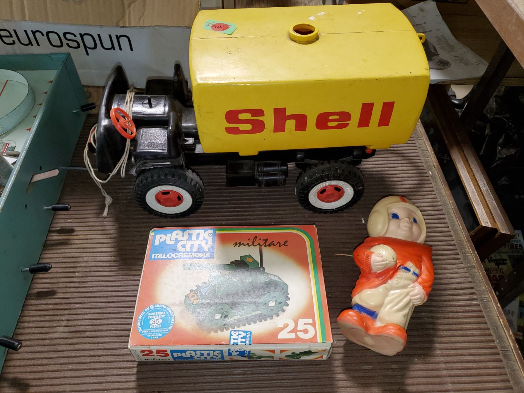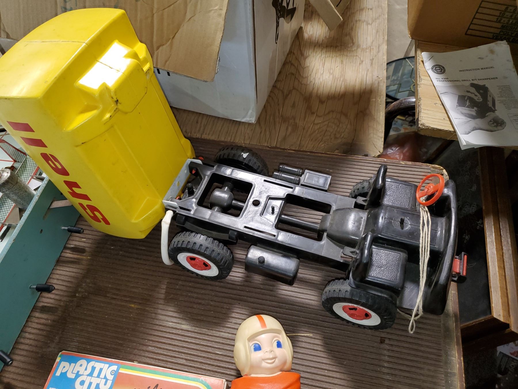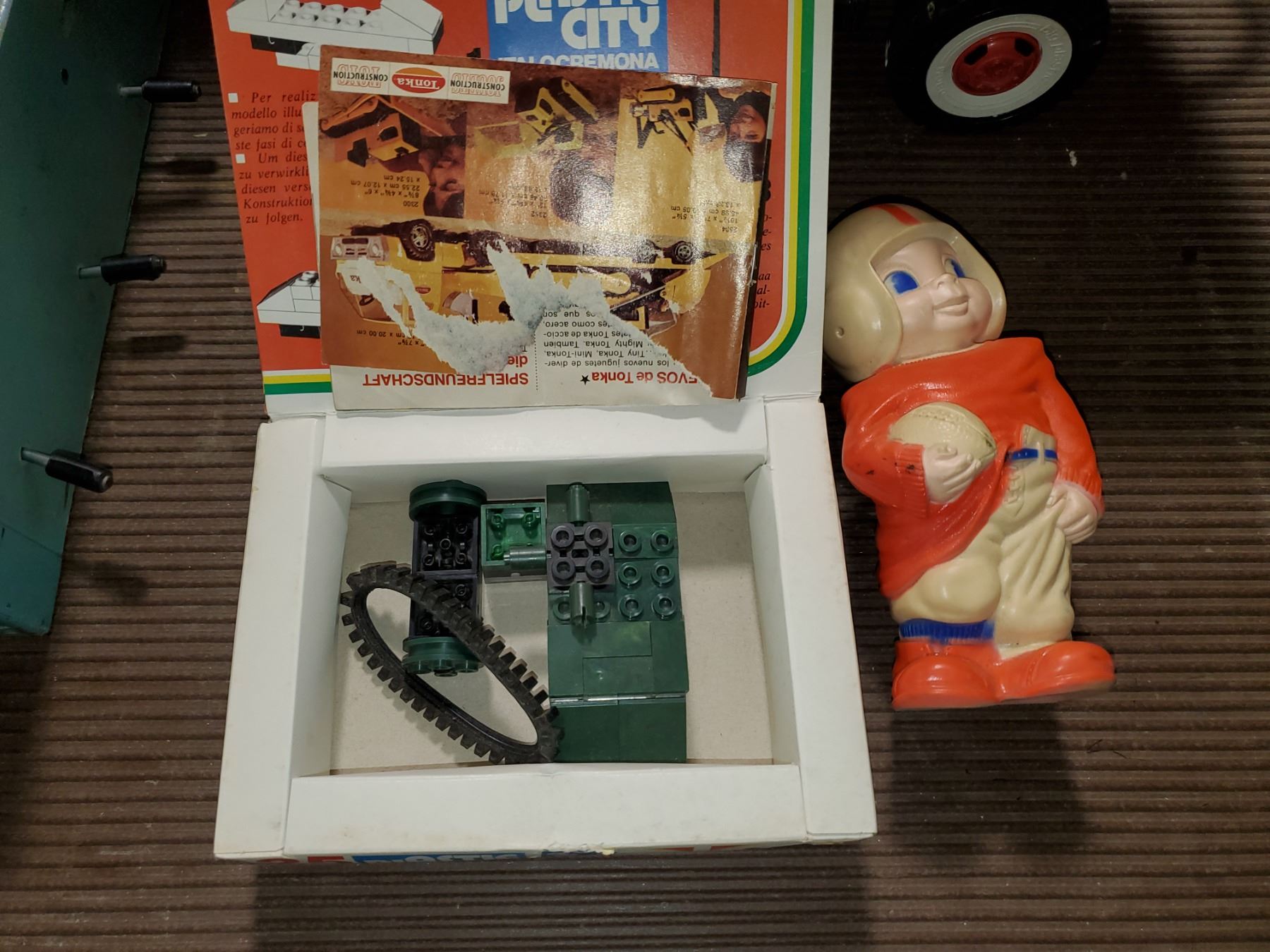 VINTAGE TOY MIX (BIG PLASTIC SHELL TRUCK, INCOMPLETE PLASTIC CITY & FOOTBALL SQUEAK TOY)