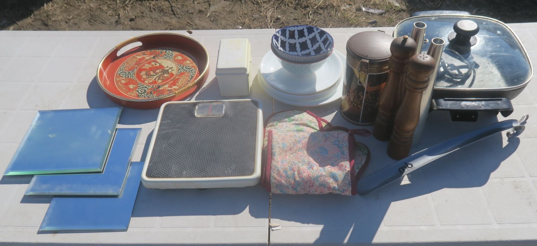 Vareity Collection of listed items (Plates, Bowls, Oven mitts, Electric Skillet, Mirors, Salt & Pepper shakers, Weight Scale, and etc)