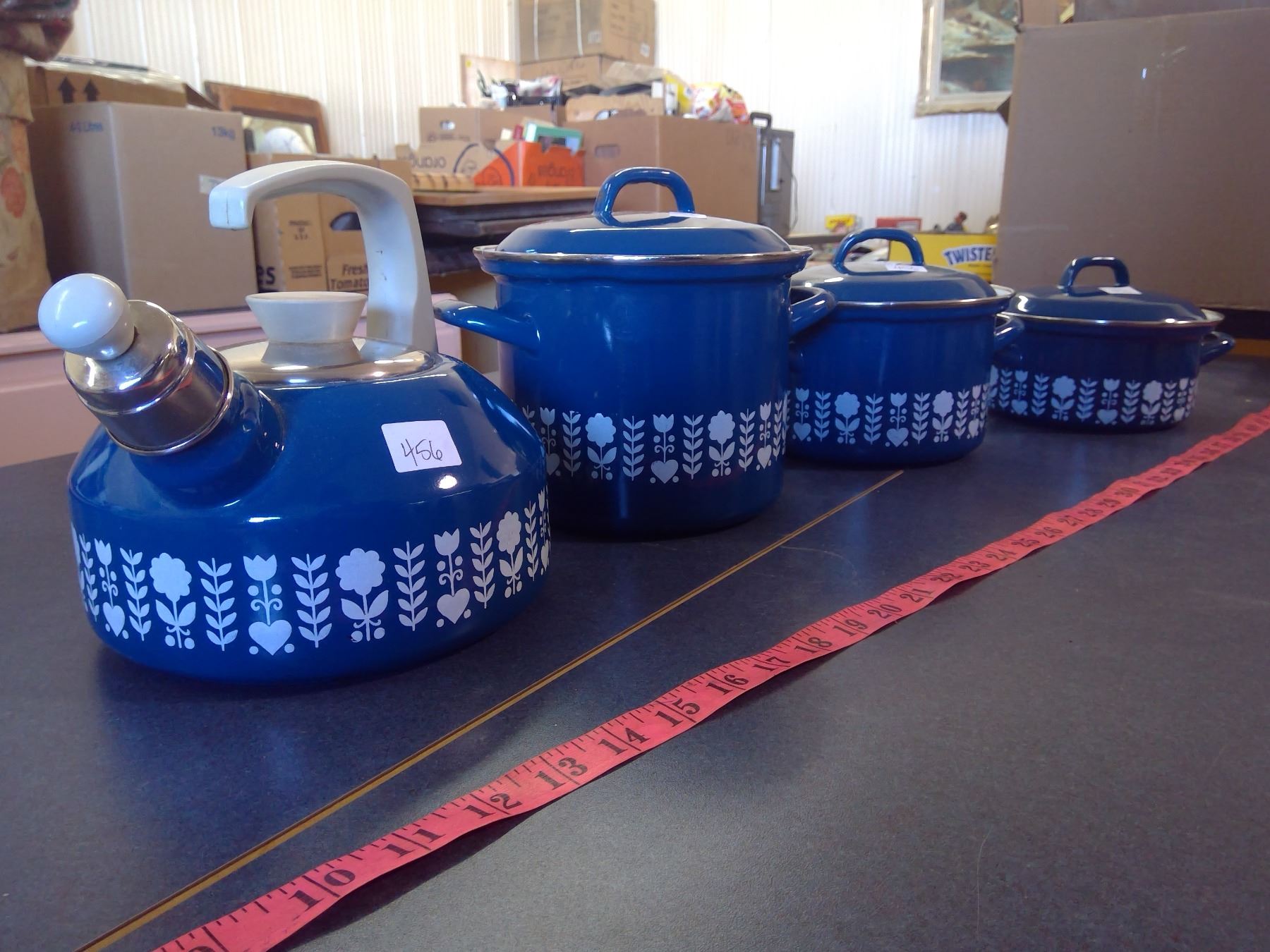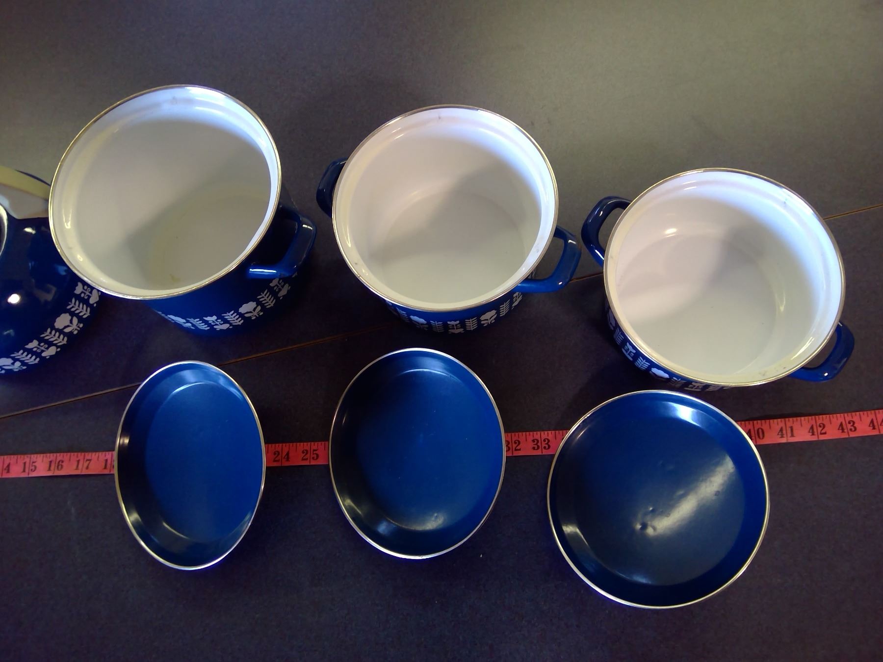 Variety of Mid Century Modern Looking Pots and Pans. Blue and White