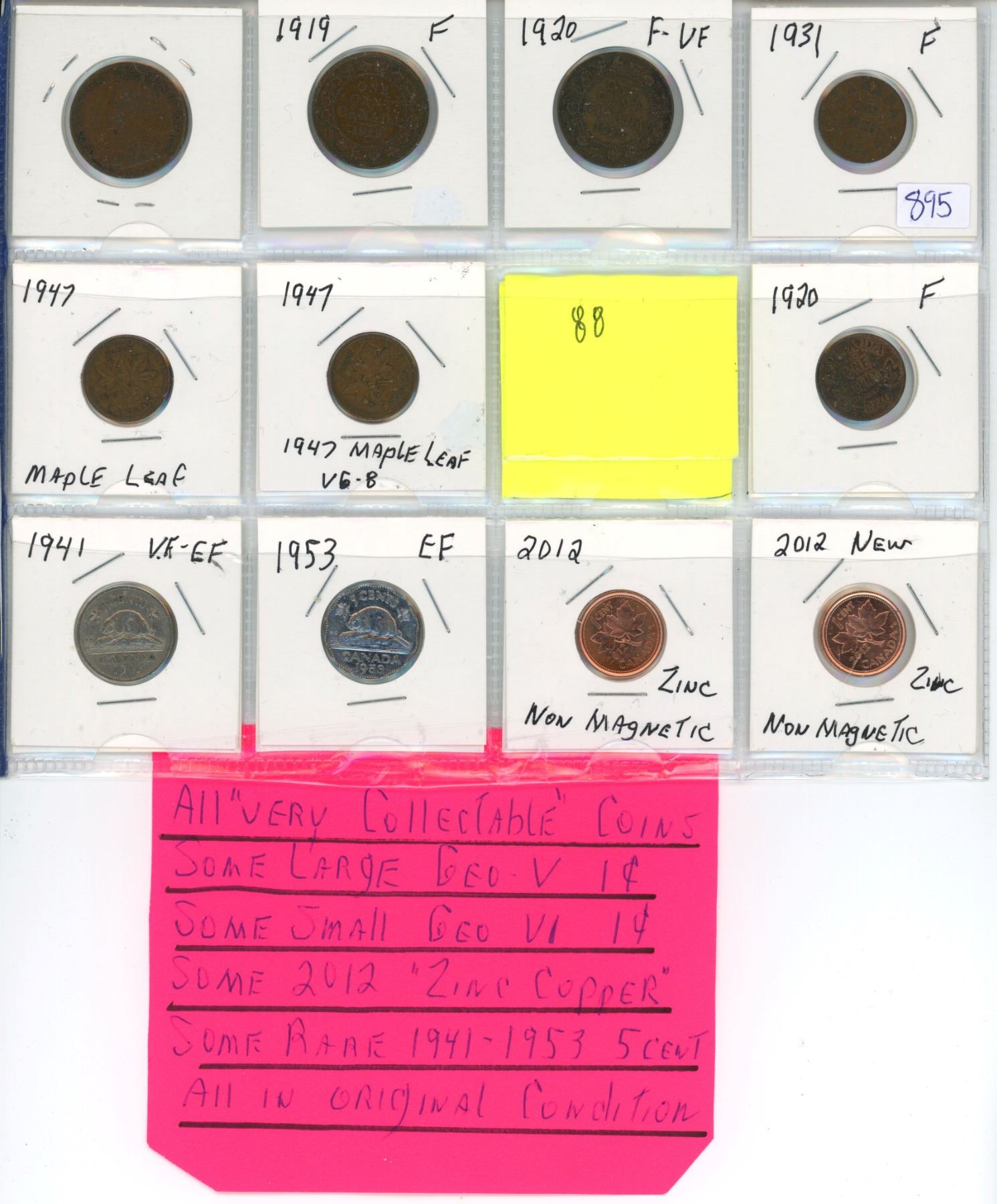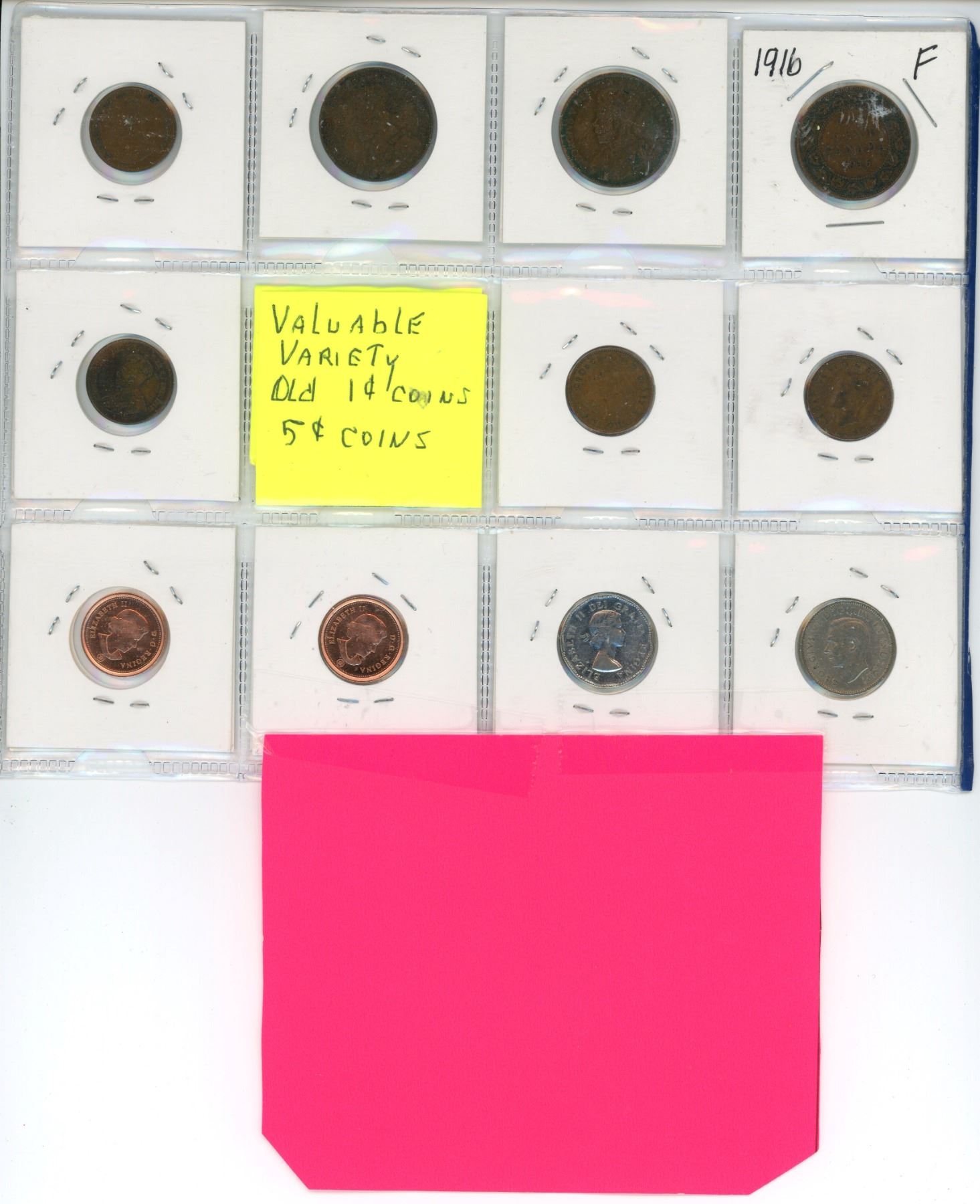Various Canadian 1 cent and 5 cent coins - 1916, 1919, 1920, 1931, 1947, 1920, 1941, 1953, 2012
