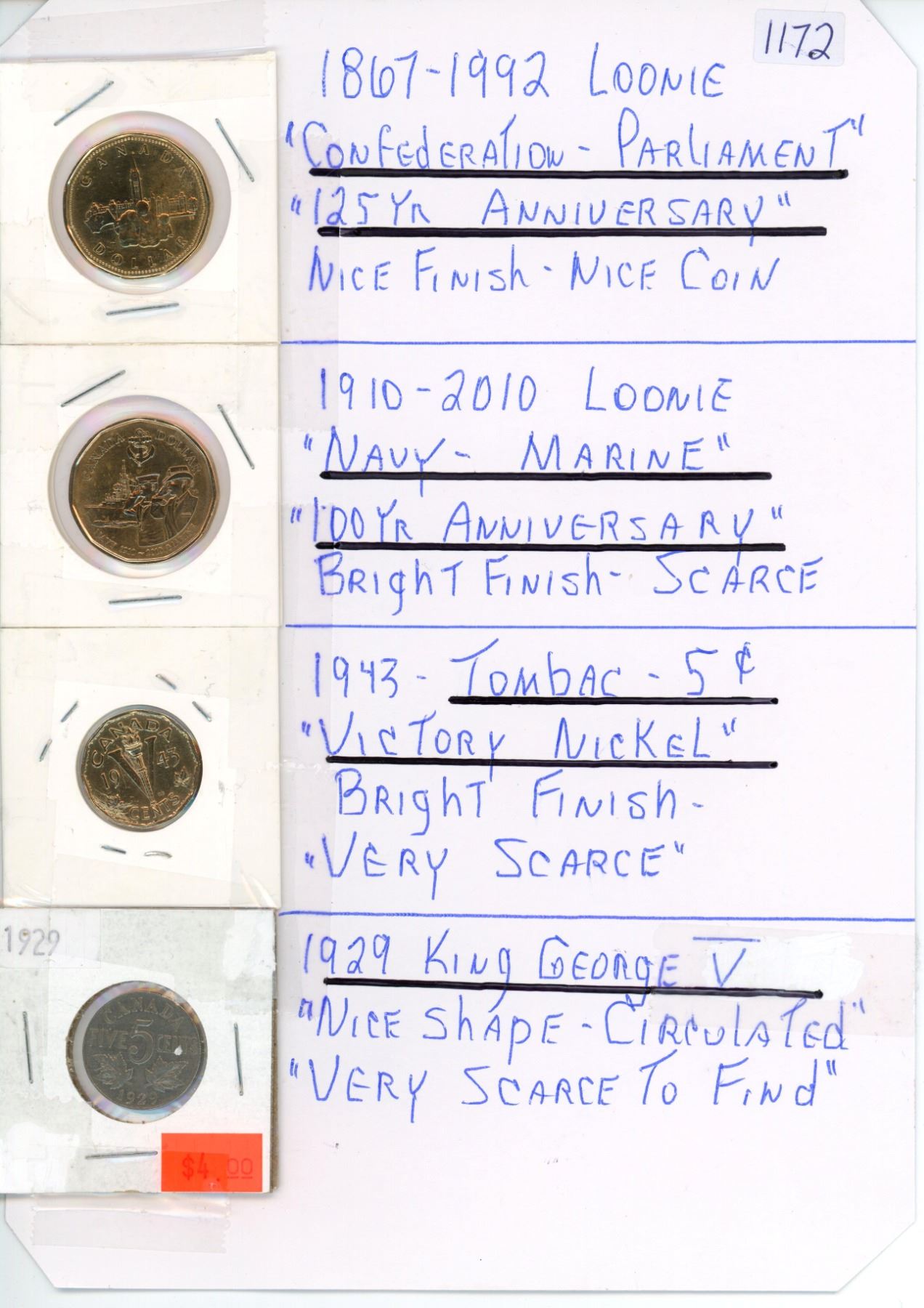 Various Canadian coins - 1992, 2010 Canadian 1 dollar coins & 1929, 1943 5 cent coins