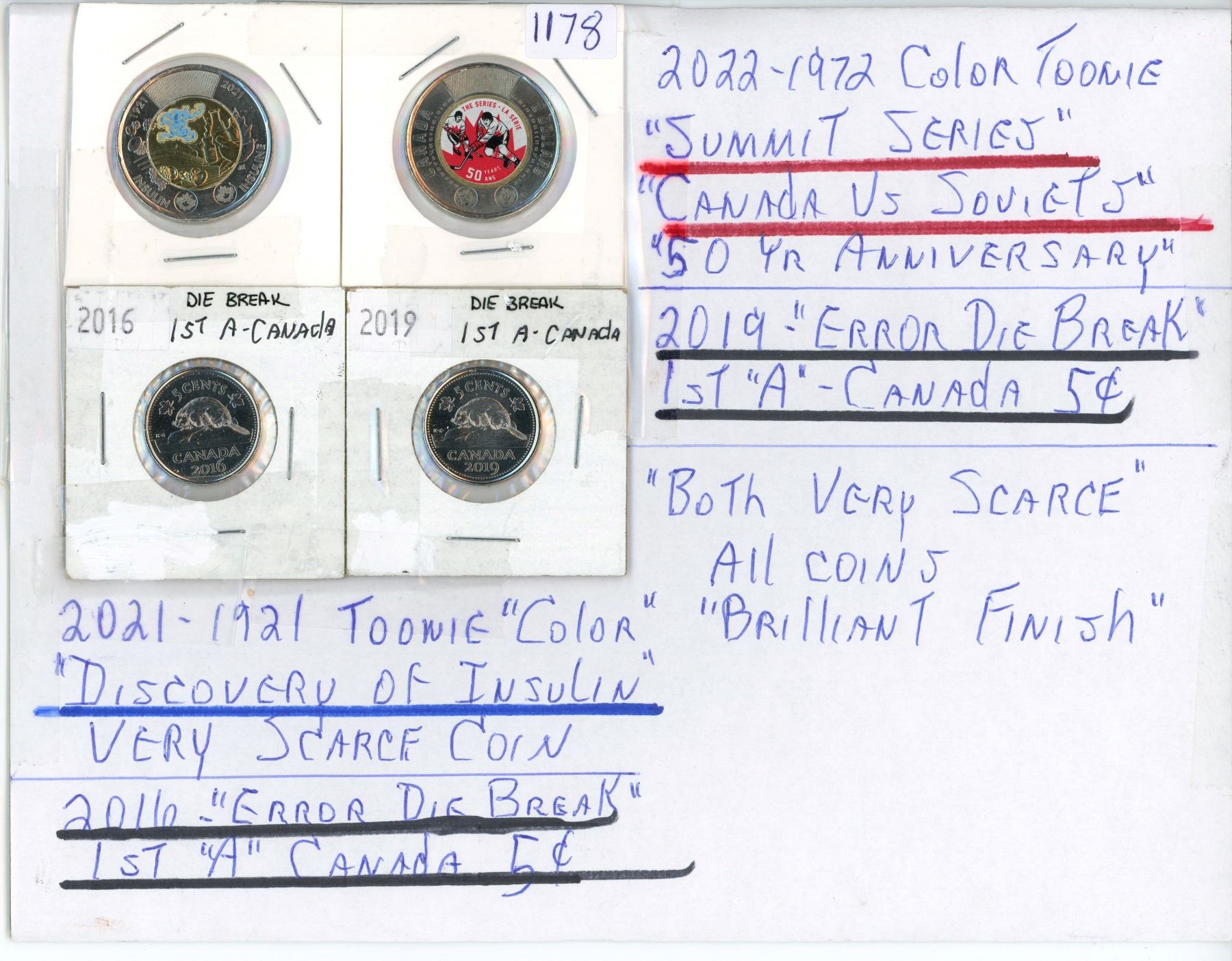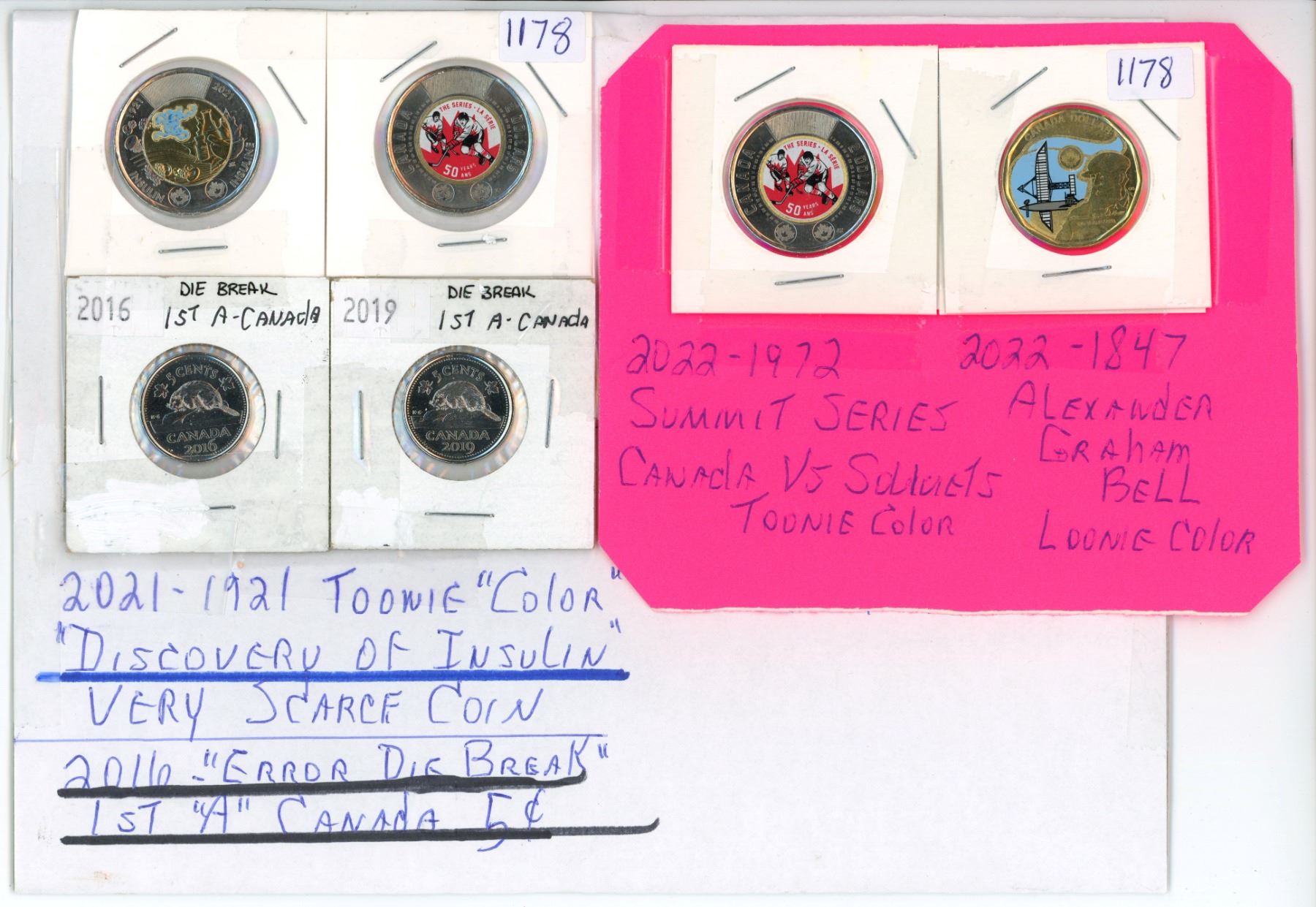 Various Canadian coins - 2021-2022 2 dollar coins, 2022 1 dollar coin & 2016, 2019 5 cent coins