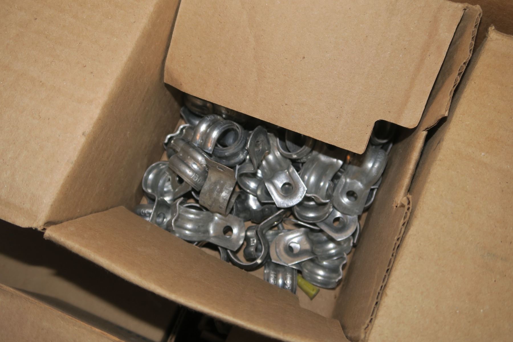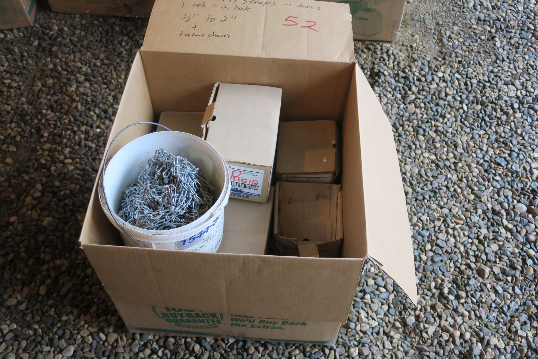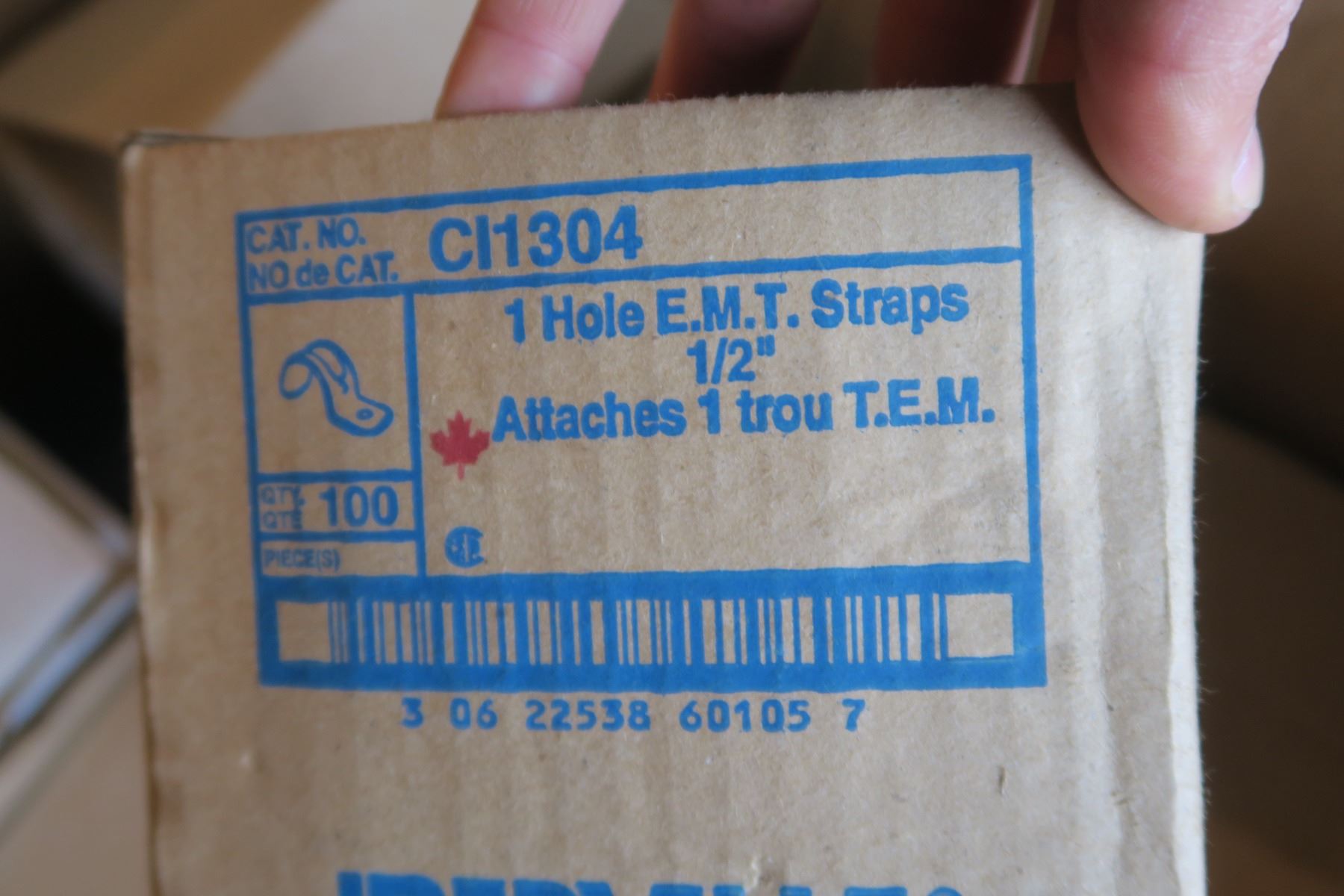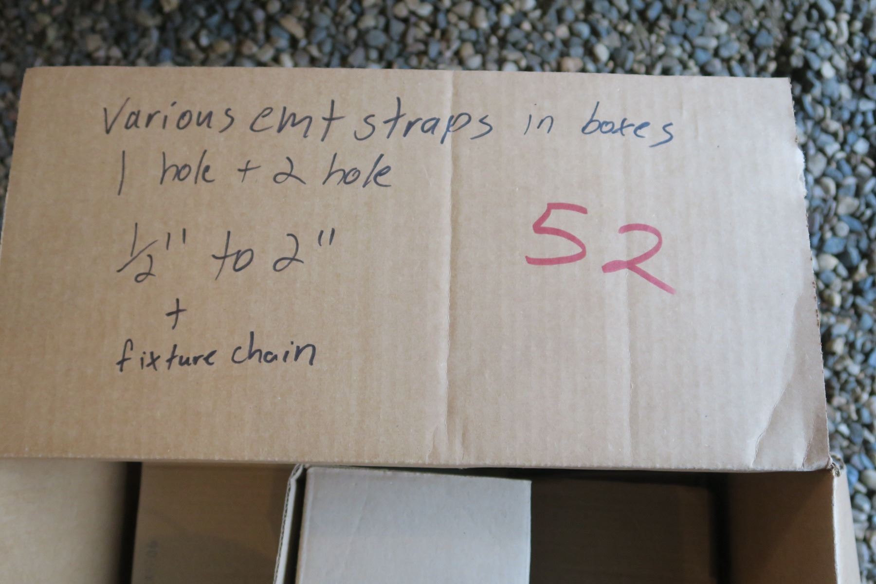 Various EMT Straps in Box, 1 Hole + 2 Hole, 1/2-2" Fixture Chain