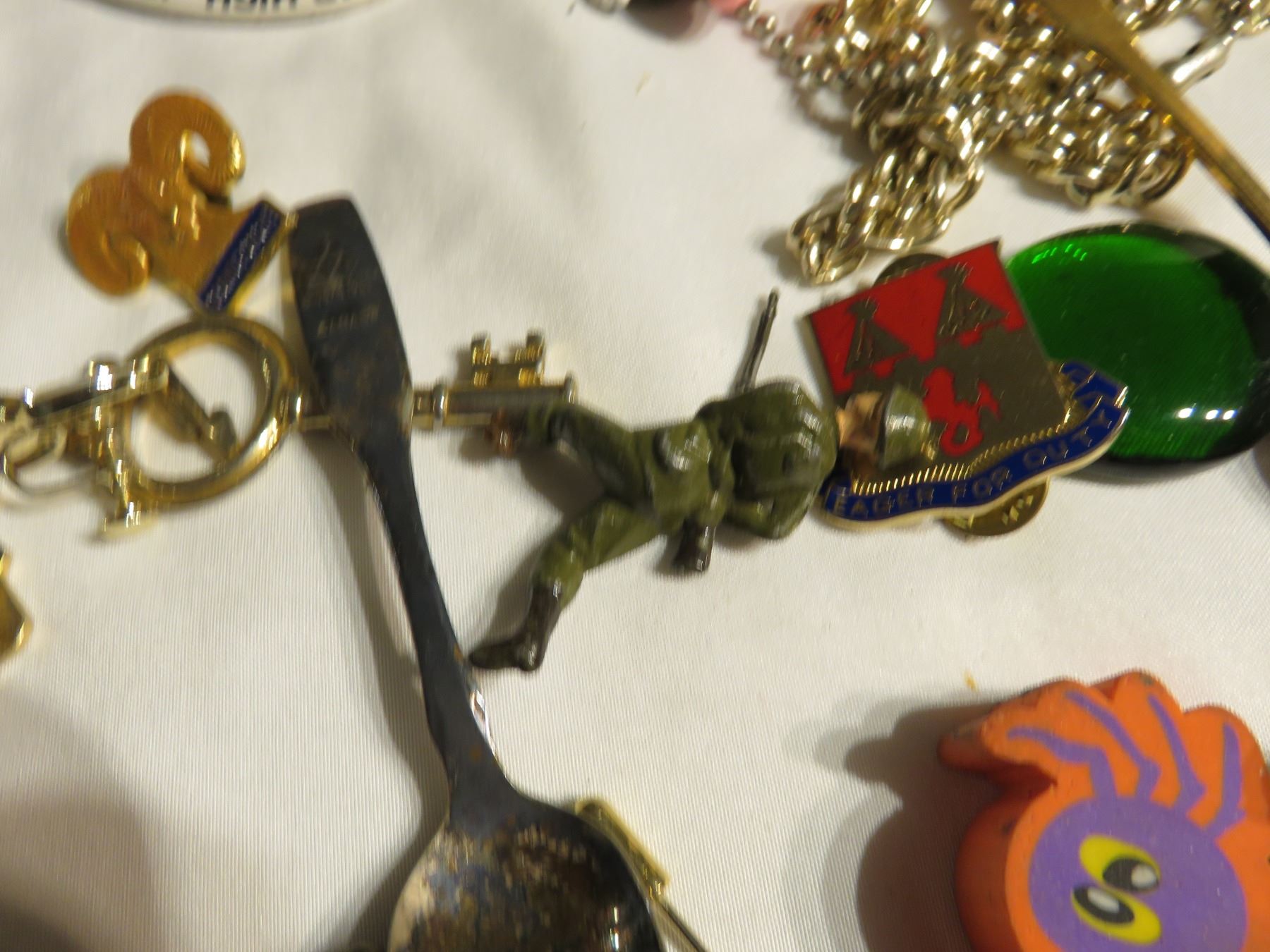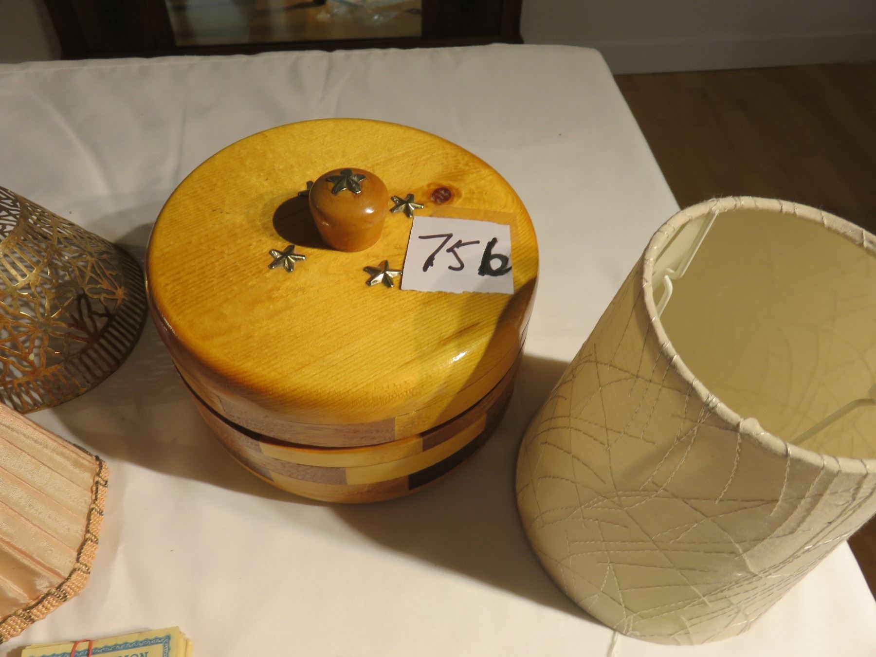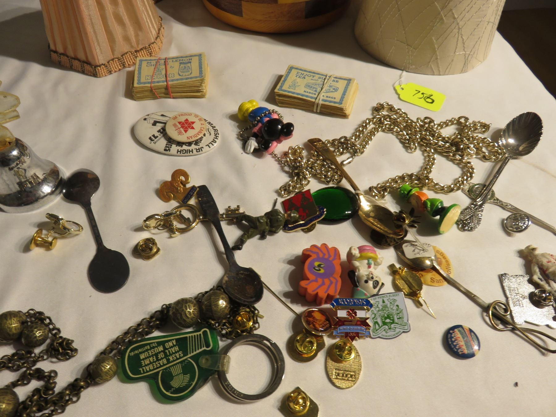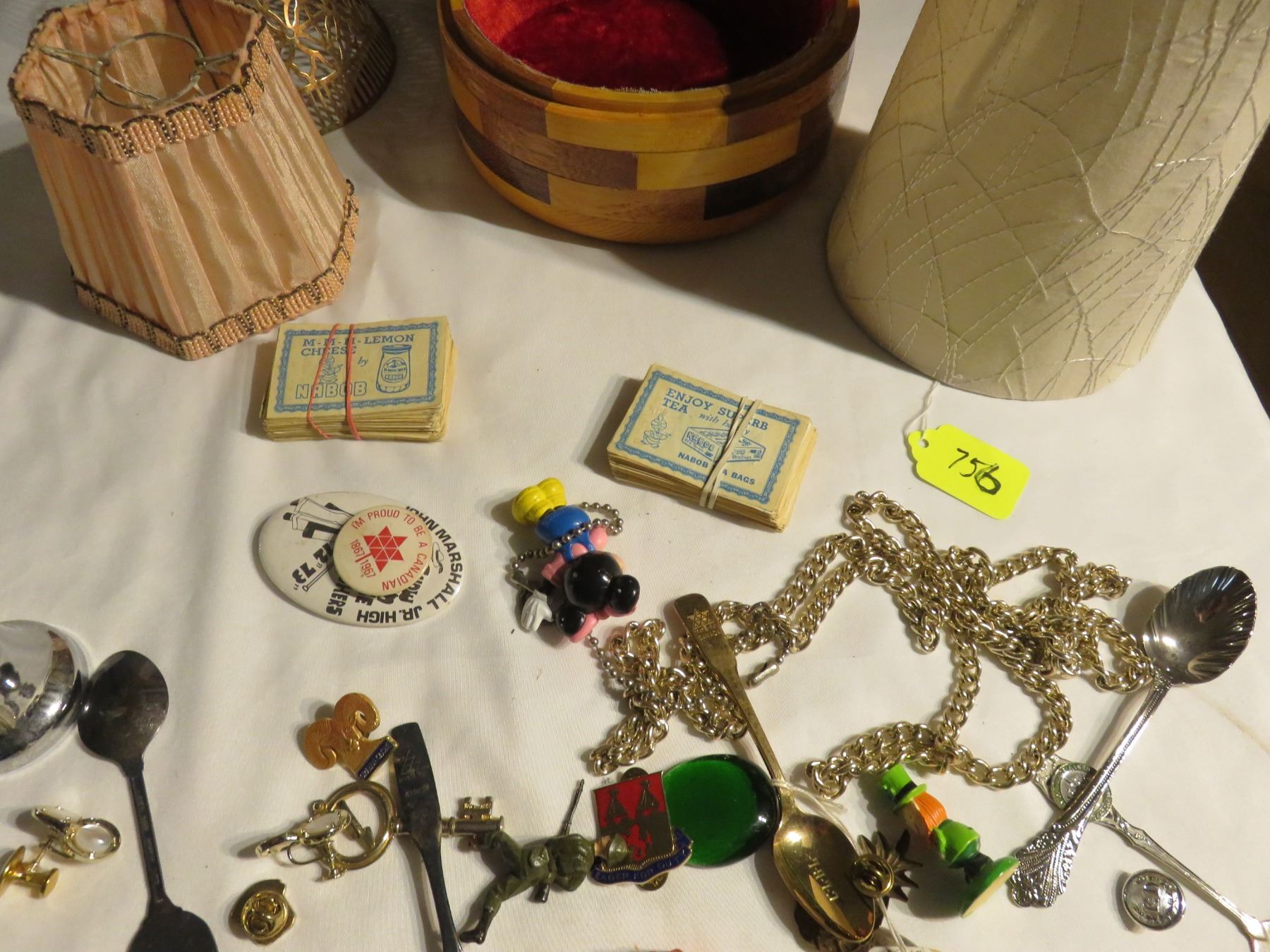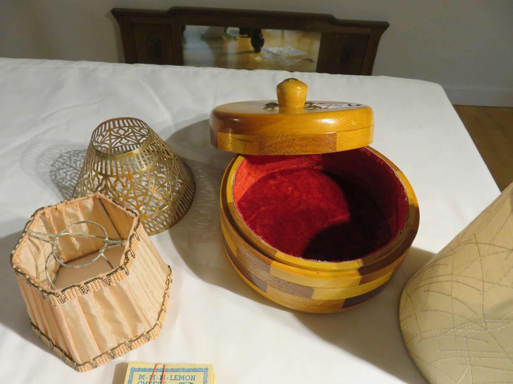 Velvet lined wooden jewellery box, spoons, curling pins, vintage lamp shade
