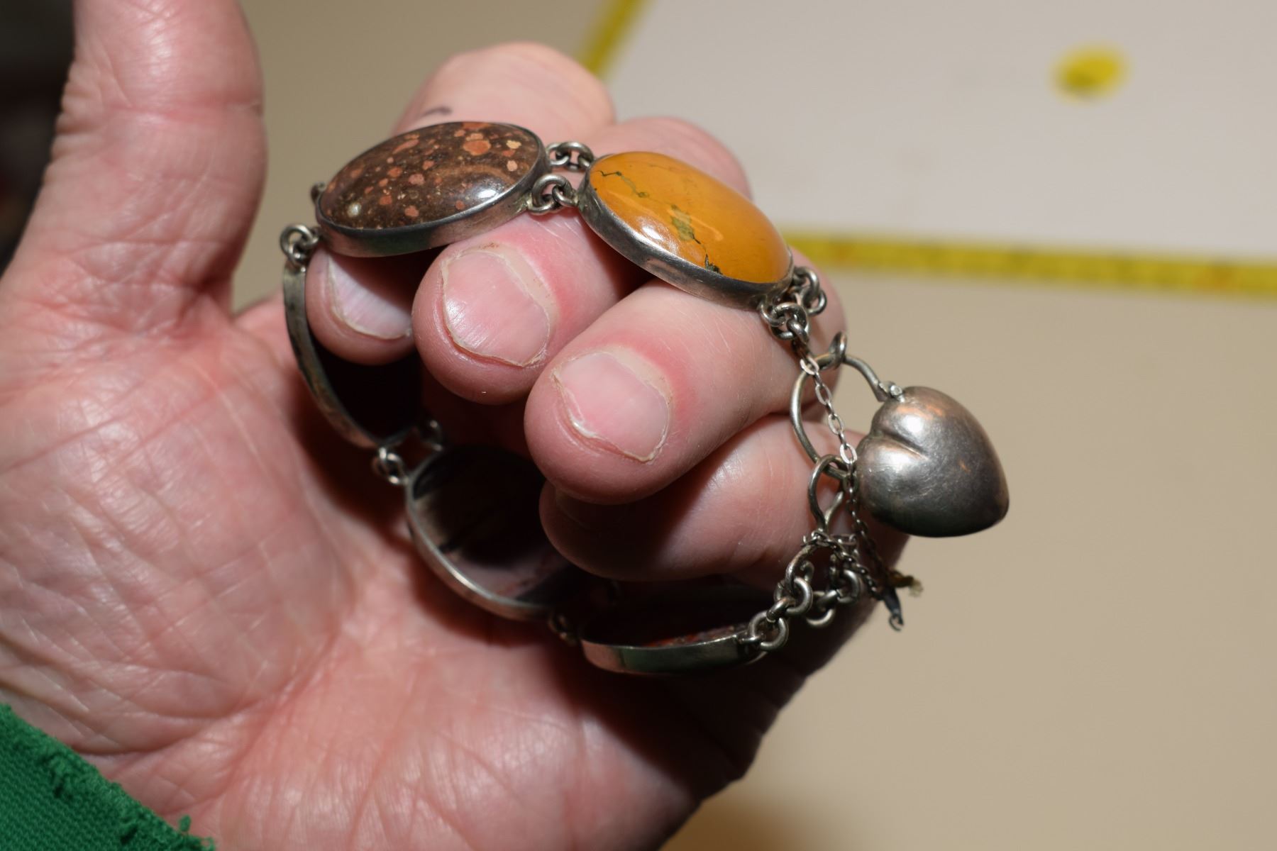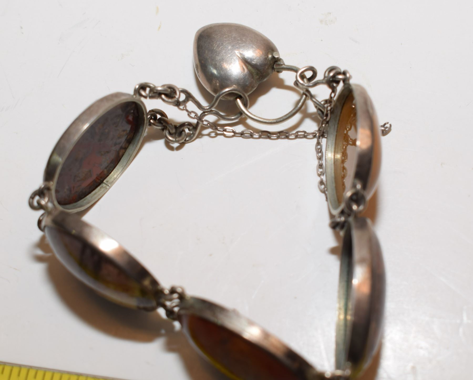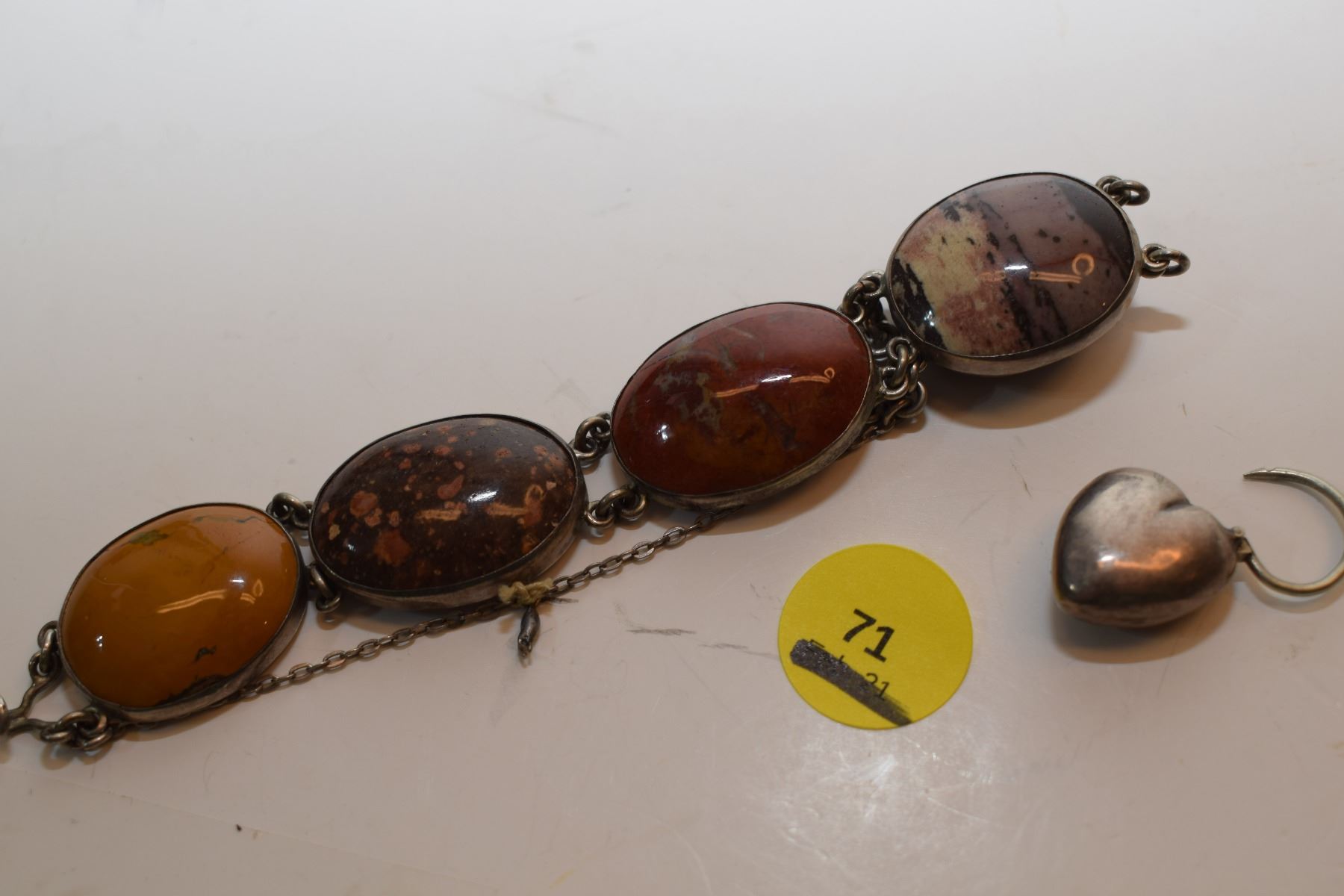 Very Old Agate Gemstones Bracelet w/ Heart Clasp (Likely Silver – Not Verified)