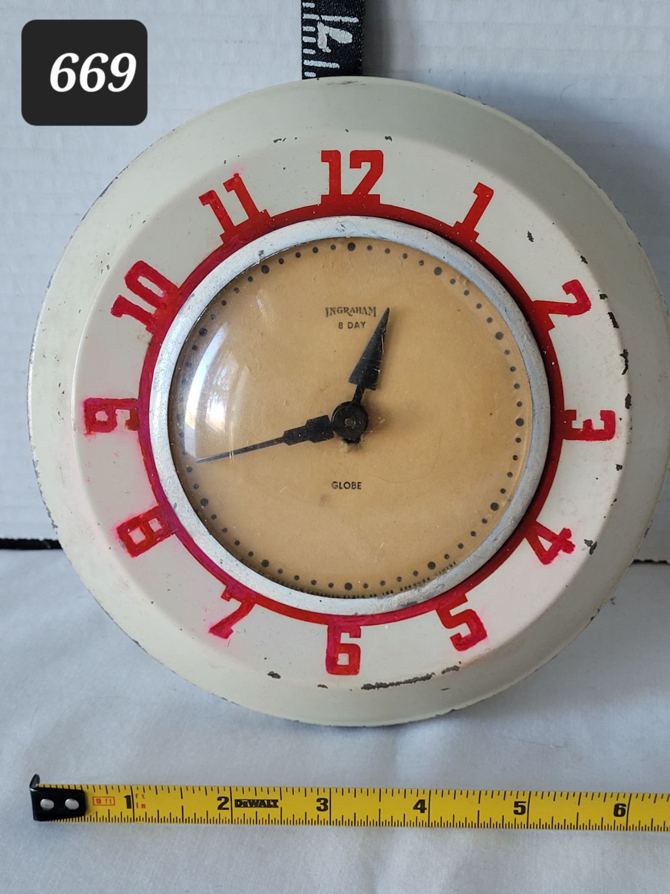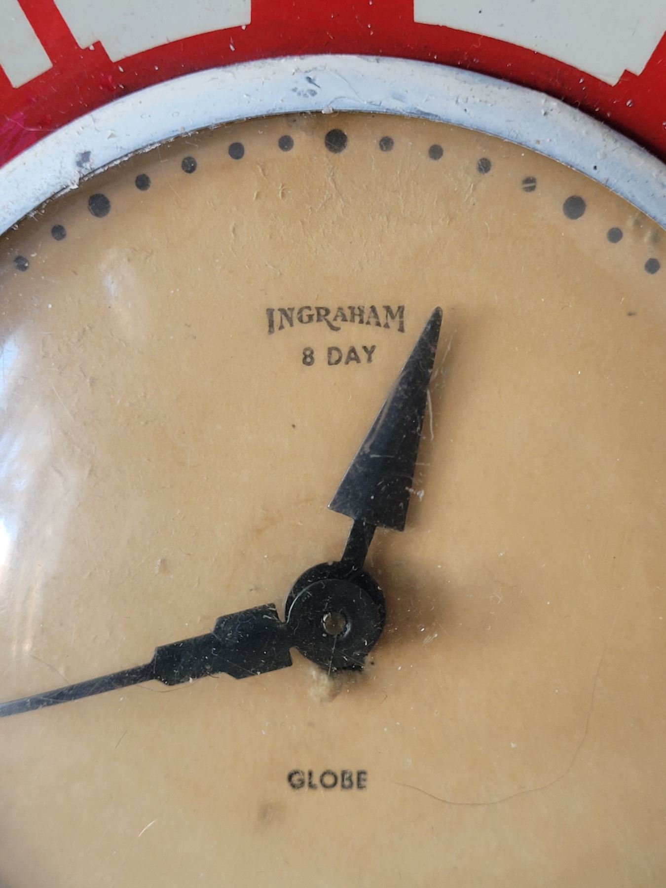 Very nice 1940's Ingraham 8 day mechanical wind, tin wall clock.
