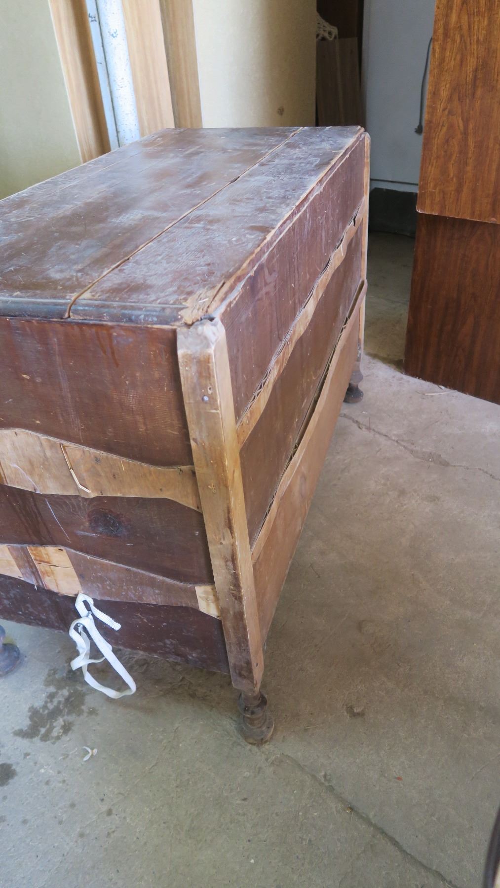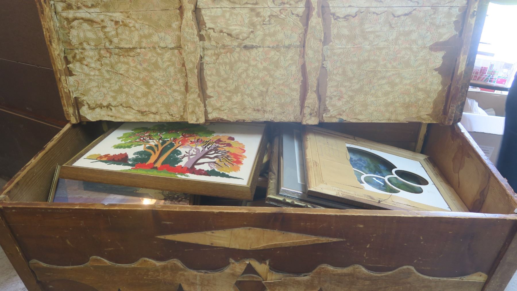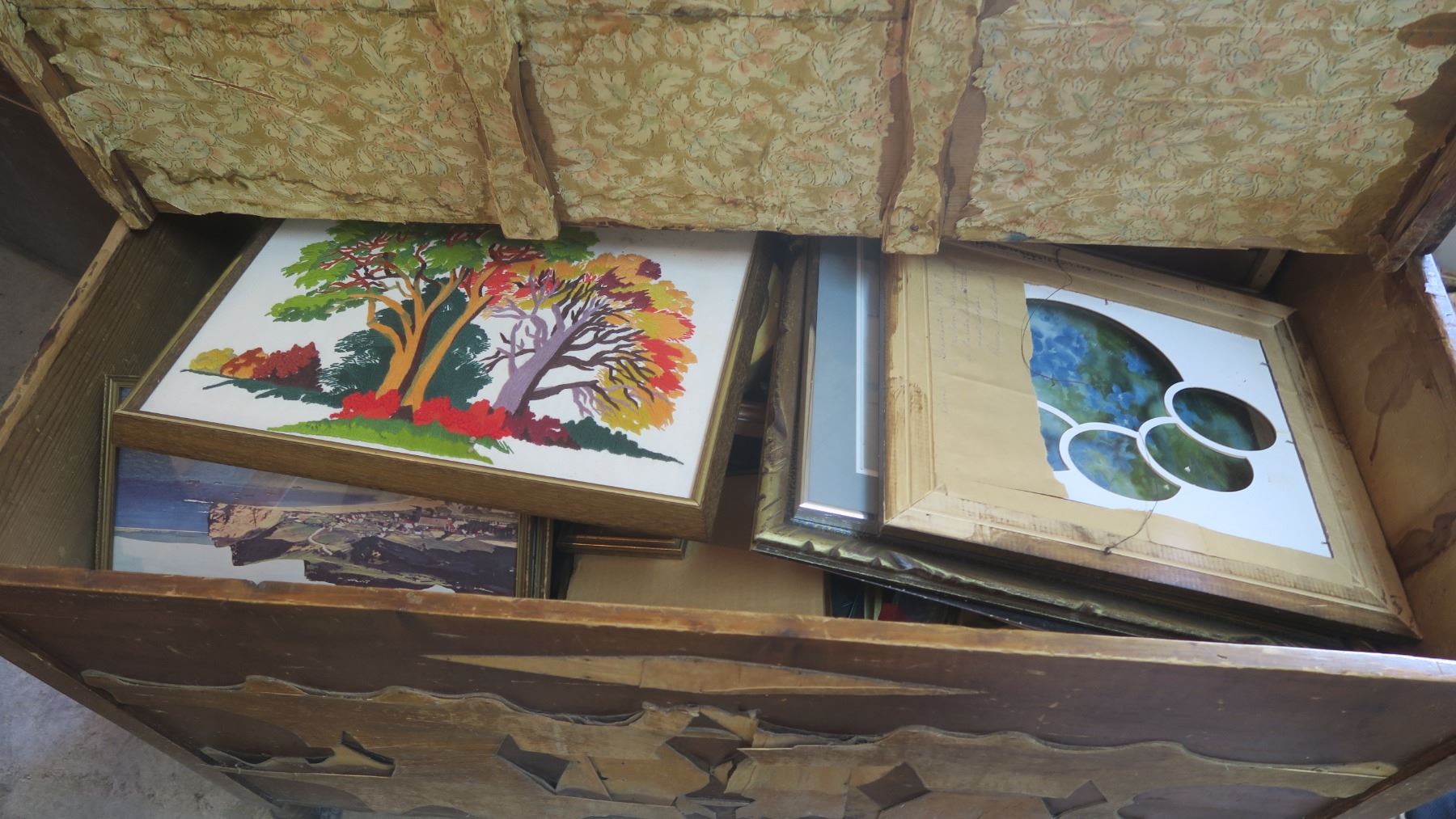 Very old wood cabinet/chest full of piture frames
