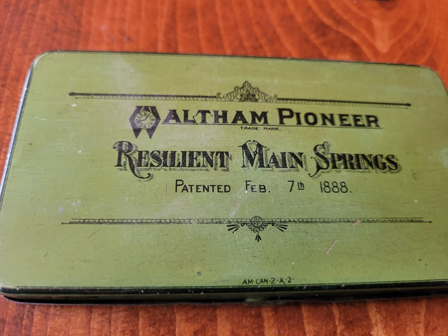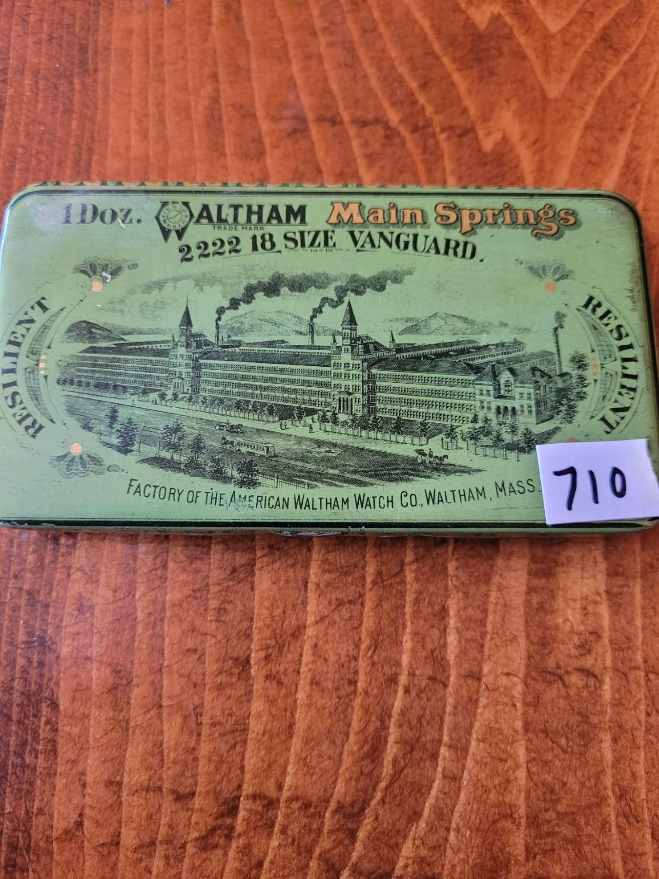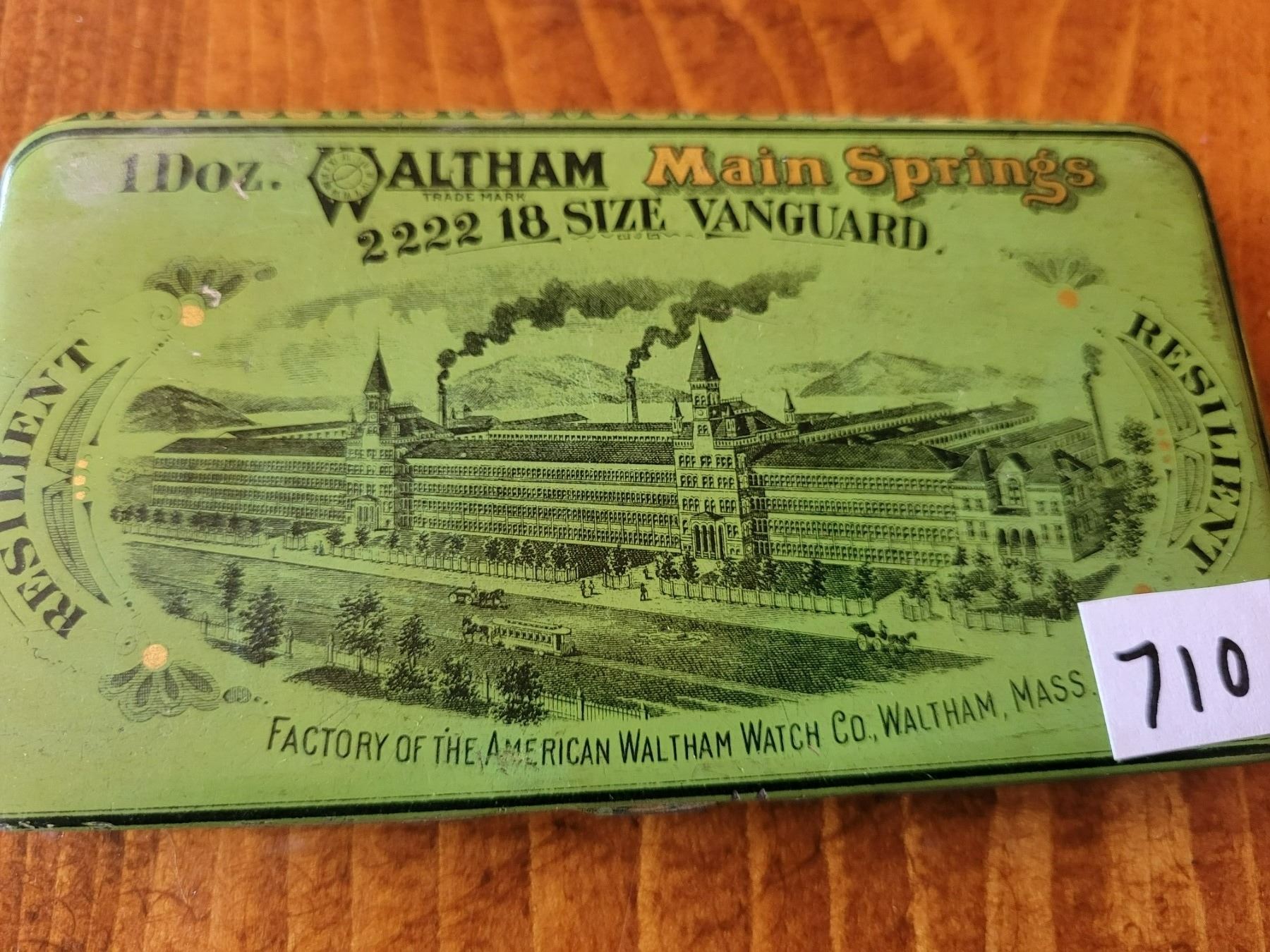 Very scarce 100 year old Waltham Main Springs sealed tin Fantastic graphic and condition for 18 size springs 5 1/4 wide x 3 deep