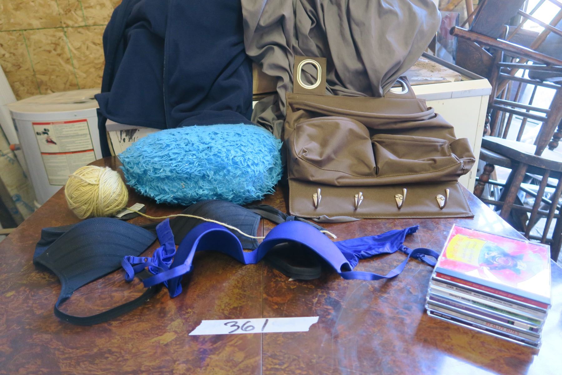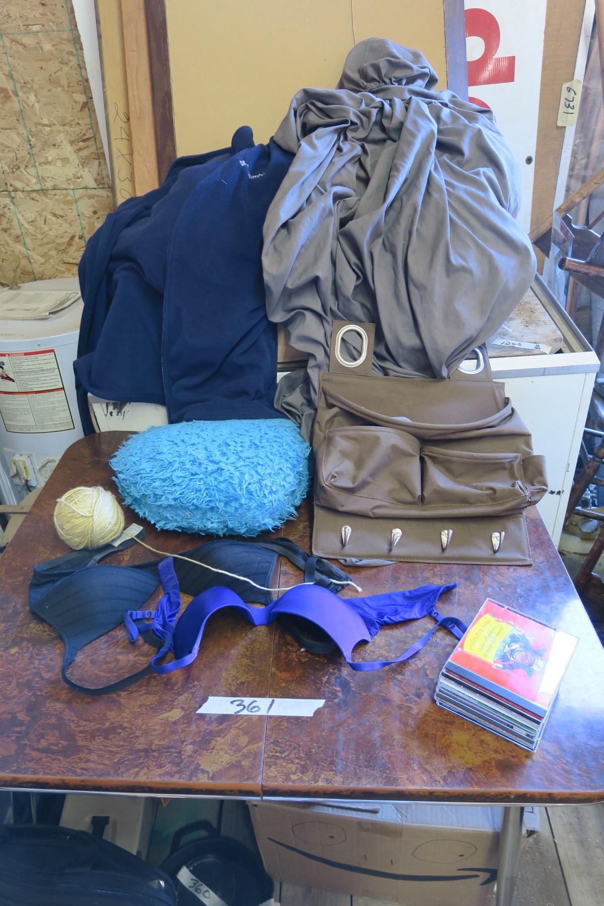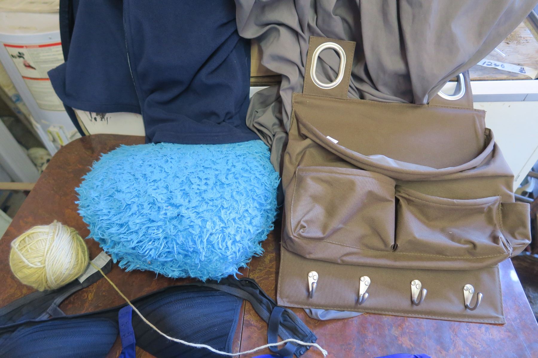 Vest Sweater, Fitted Sheet, Wall Hanging Organizer, CDs X6, Yarn, Pillow and 4X Curtains