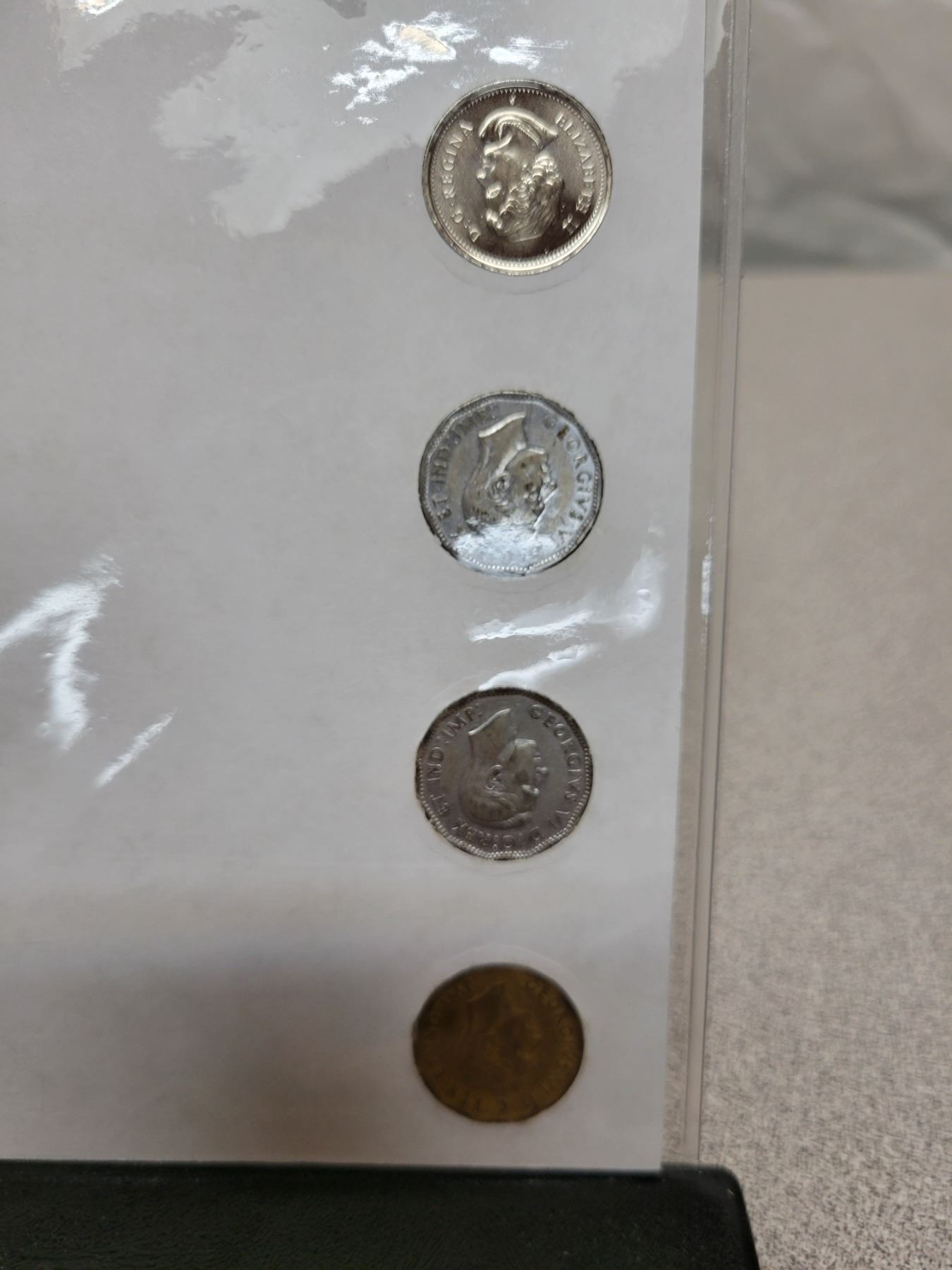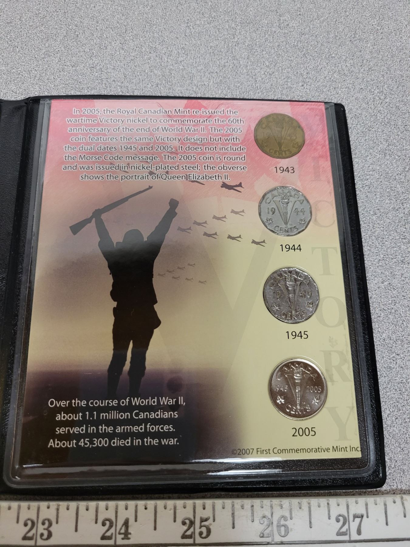 Victory 5 Cents Collection. 4 different Canadian 5 Cents including 1943 Tombac, 1944 Steel, 1945 Steel & 2005P End of World War II. Housed in a First Commemorative Mint folder.