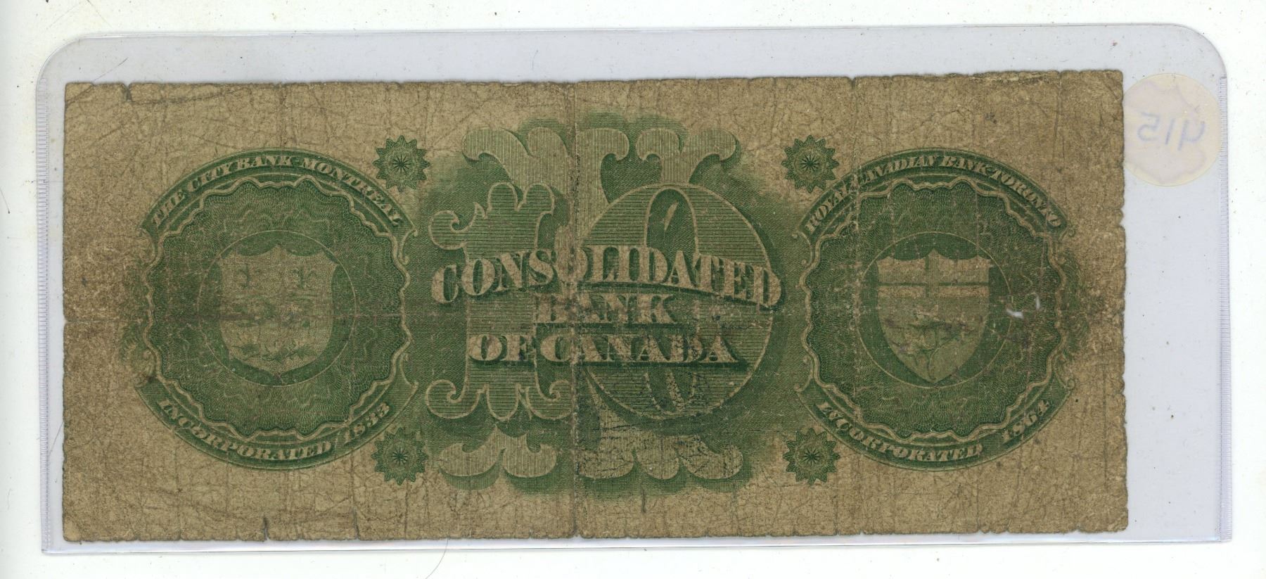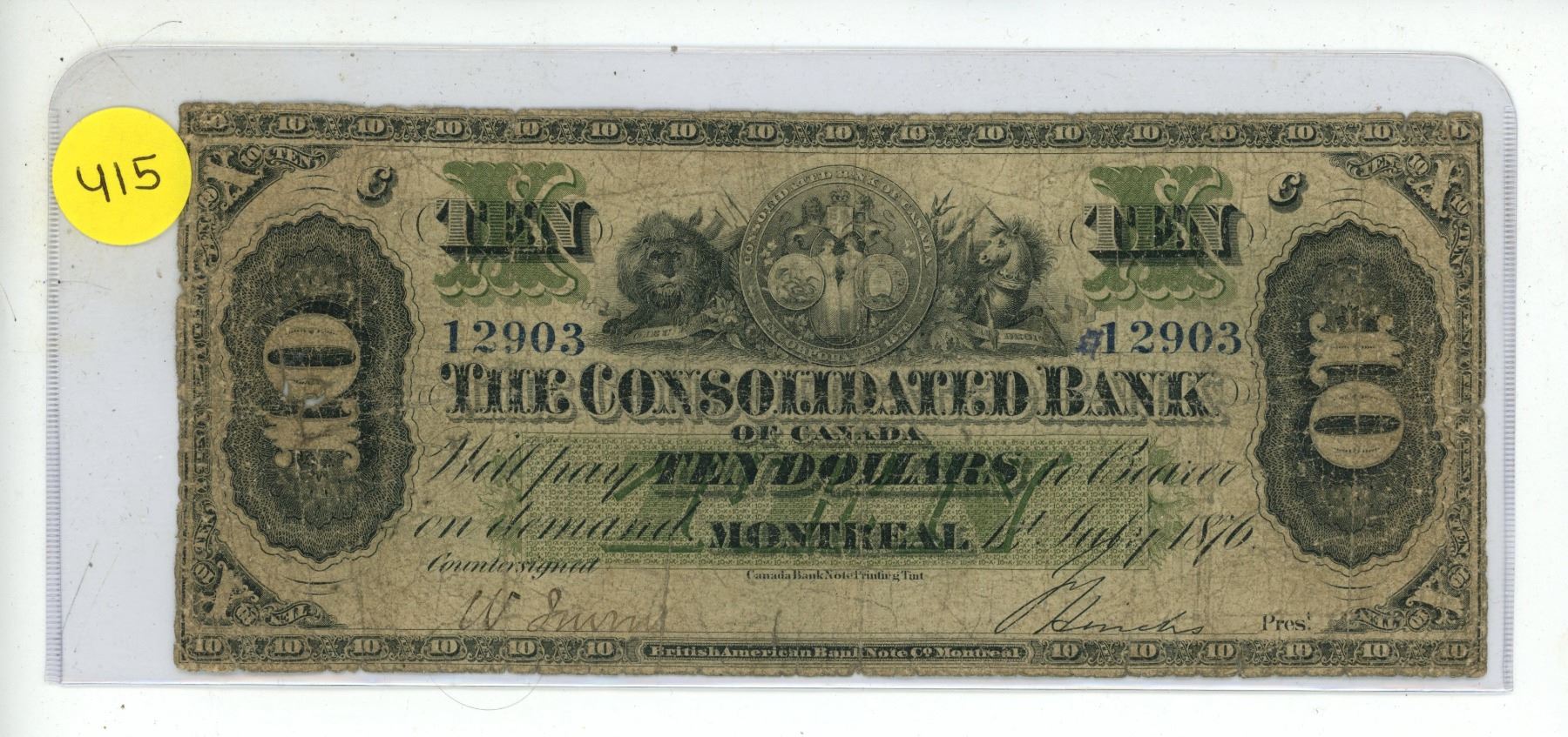 Vintage 10 Dollar Banknote Issued by the Consolidated Bank of Canada in 1876.