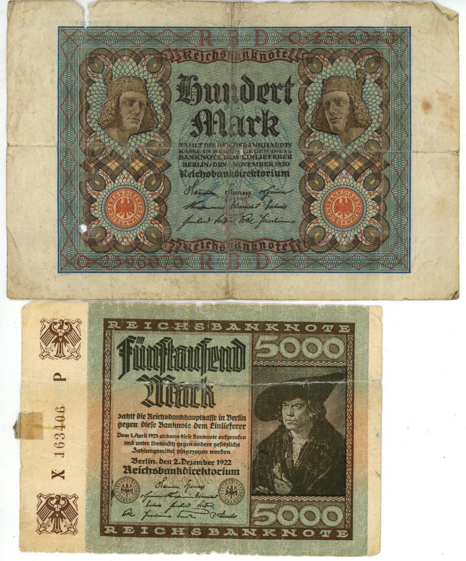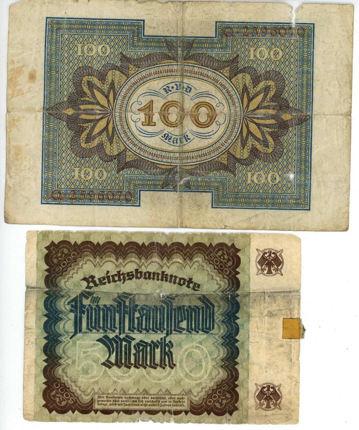 Vintage 1922 German 5000 Marks bill & 1920 German 100 Mark bill