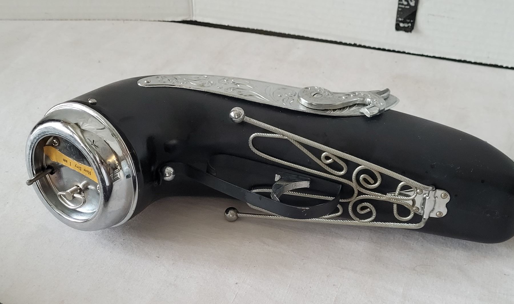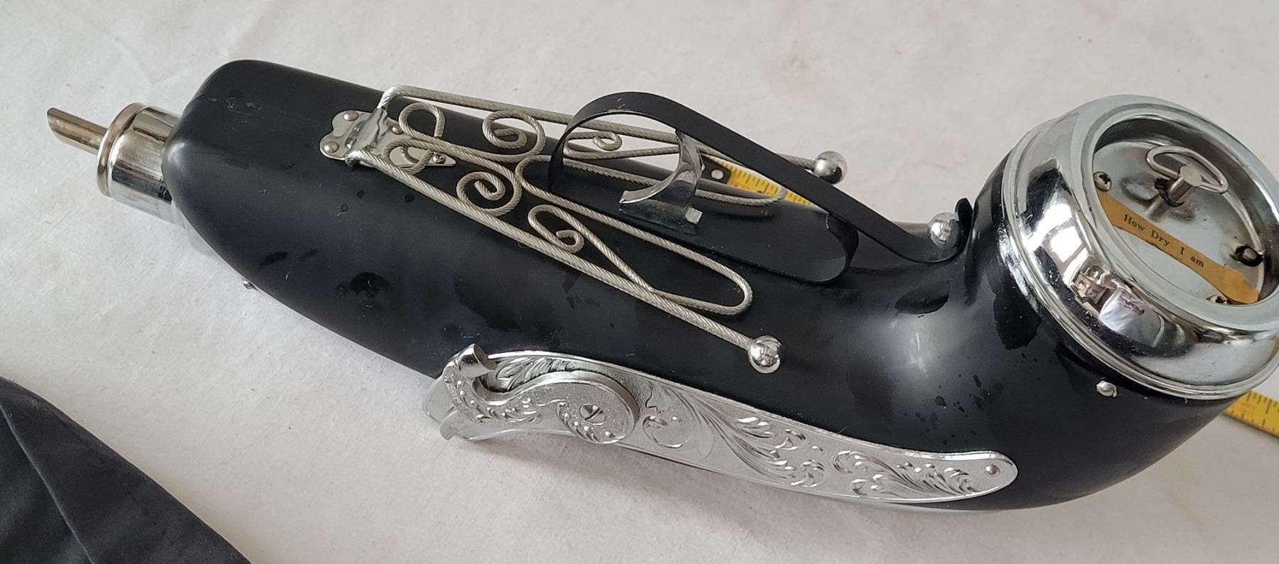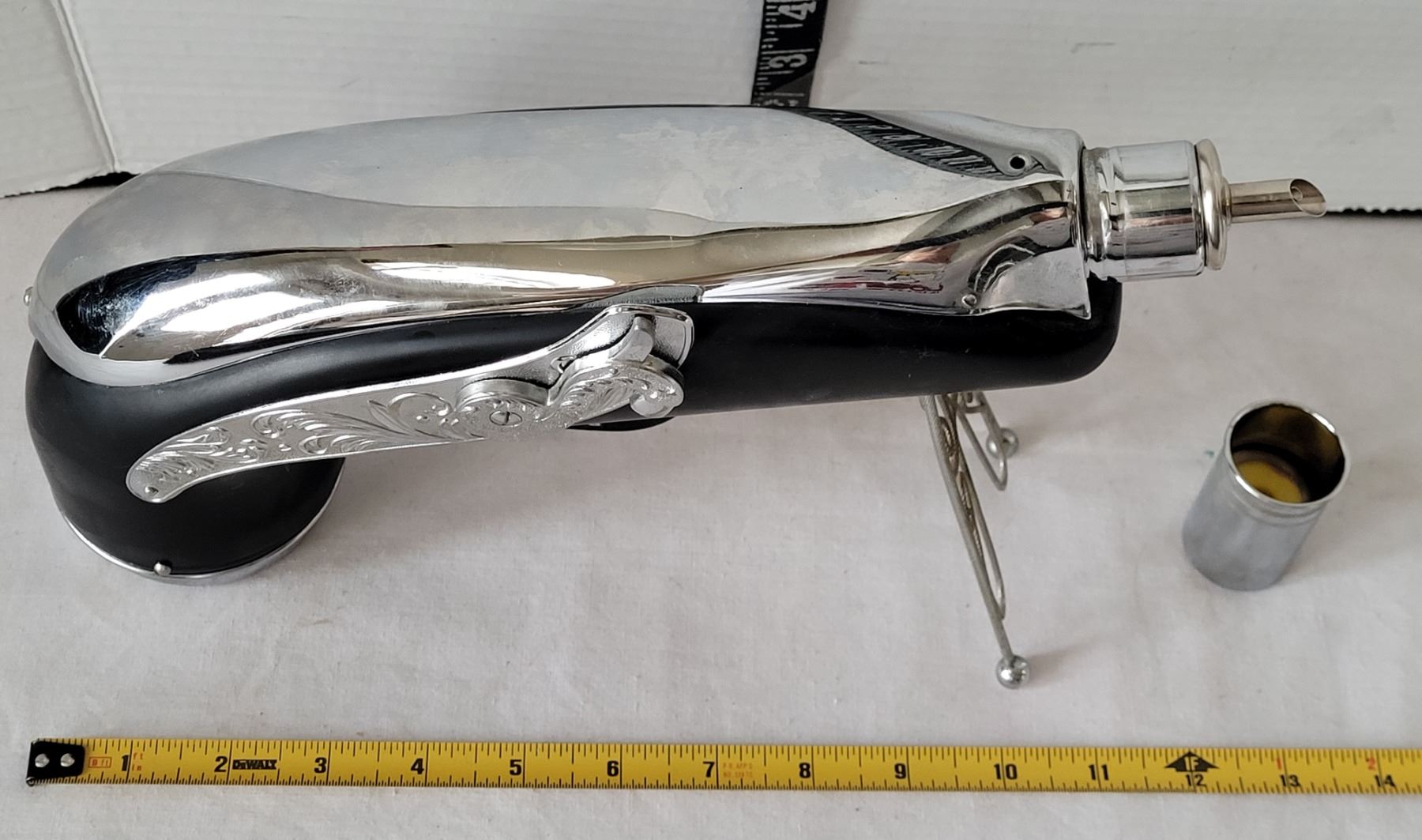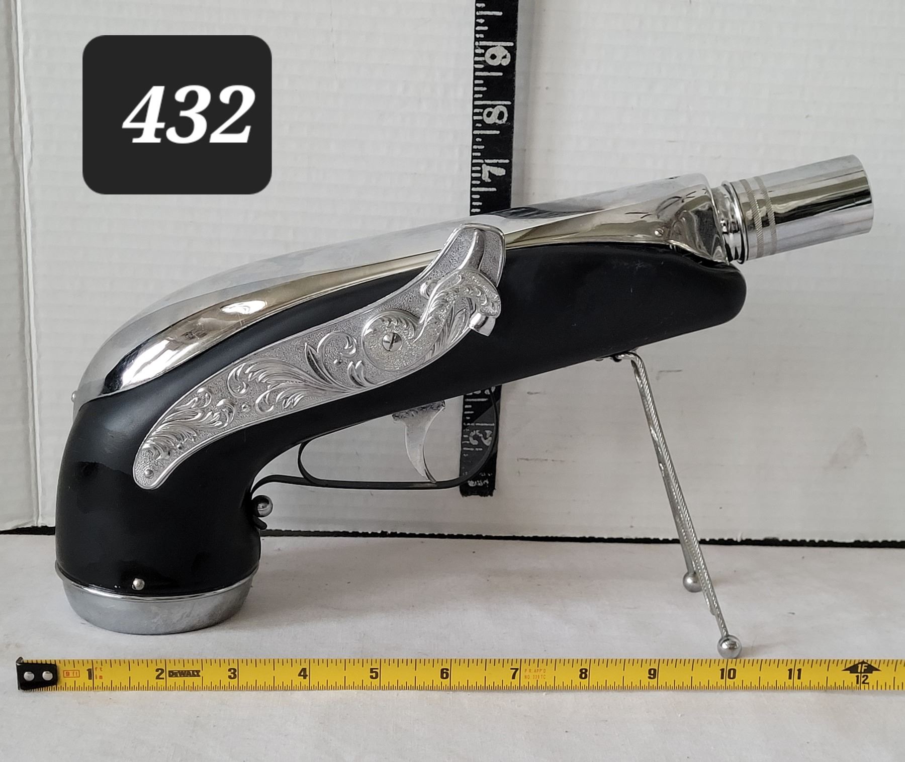 Vintage 1960-'70's Blunderbuss pistol shaped musical bourbon decanter. Chrome intricate scroll work. Japan.
