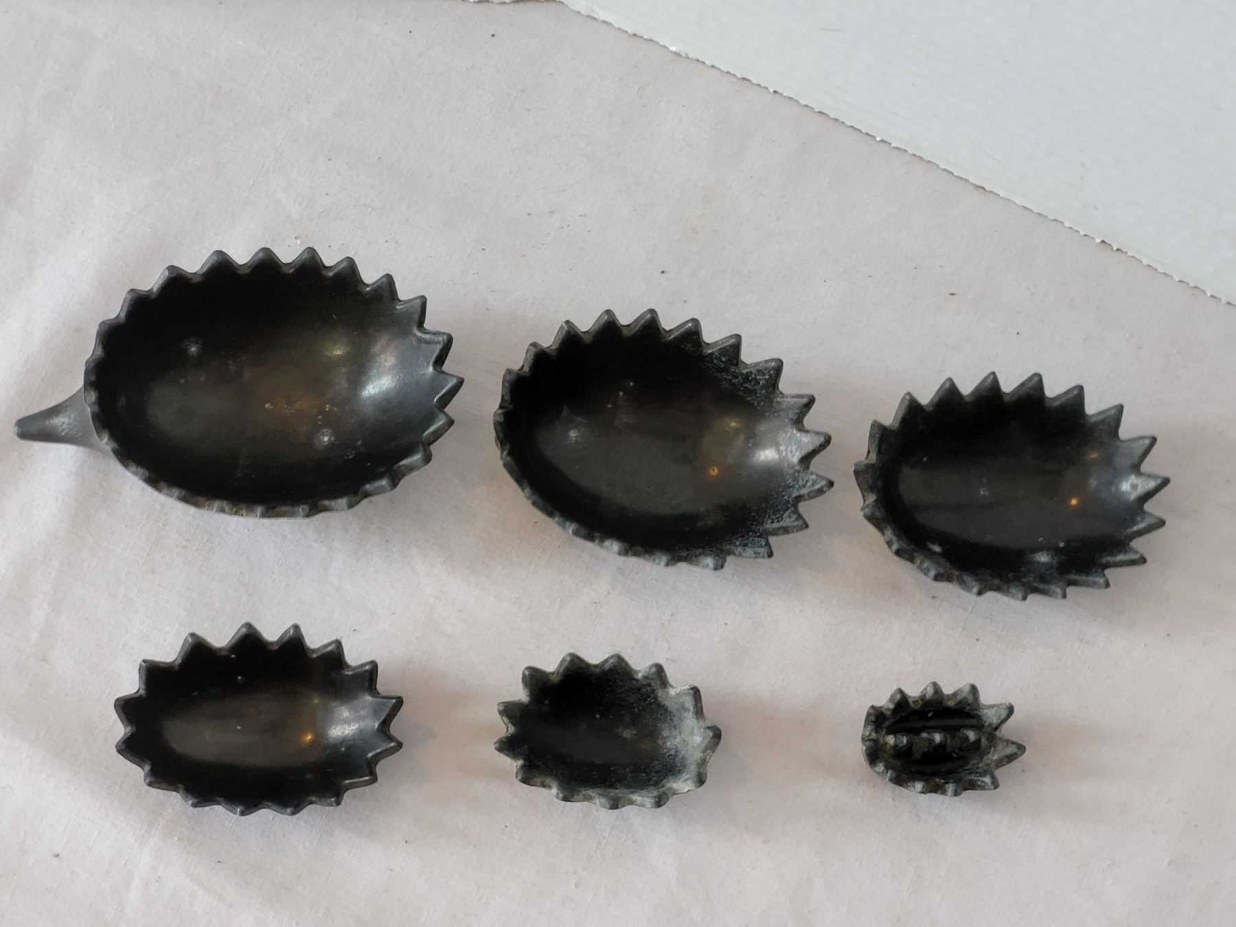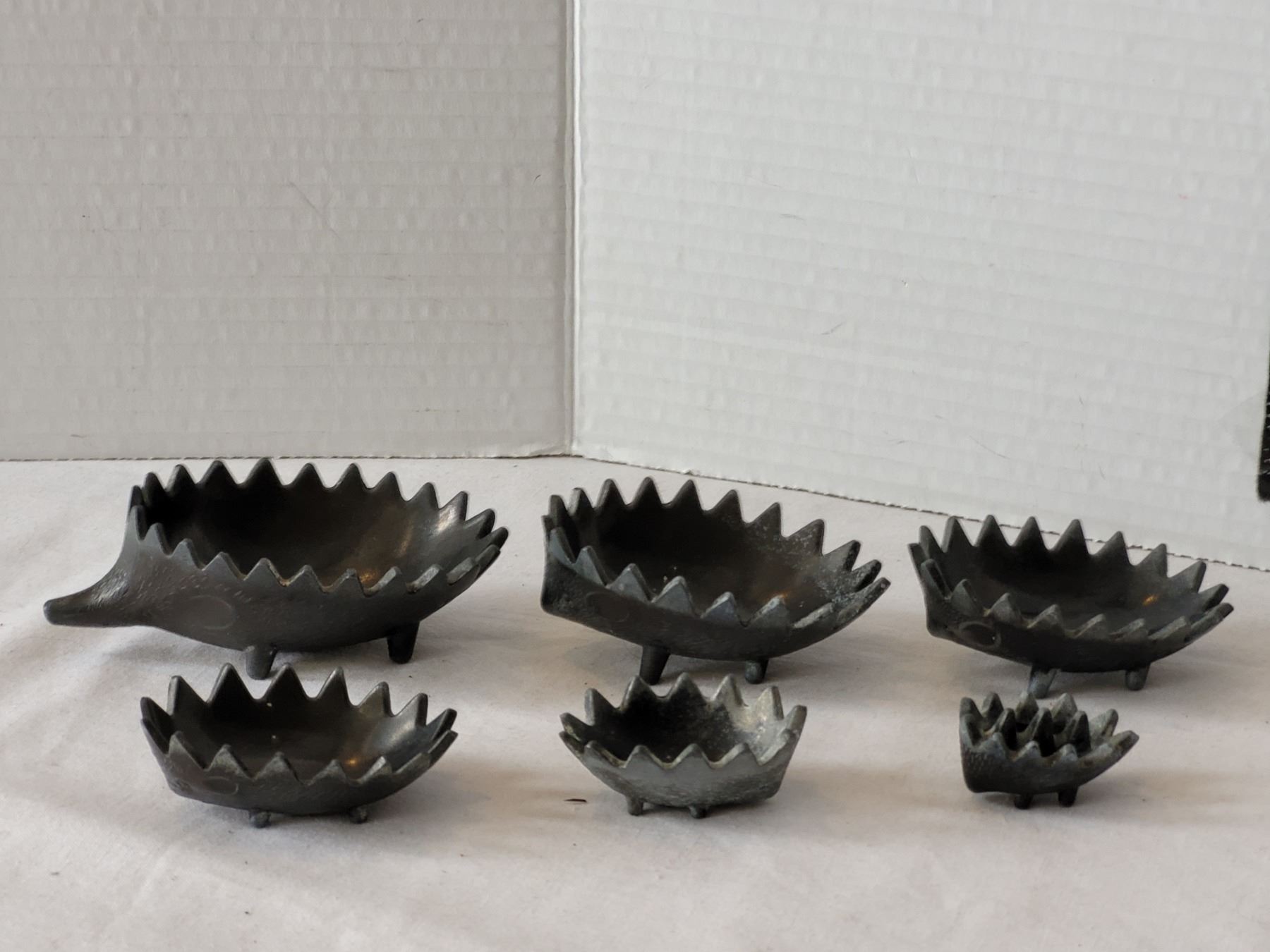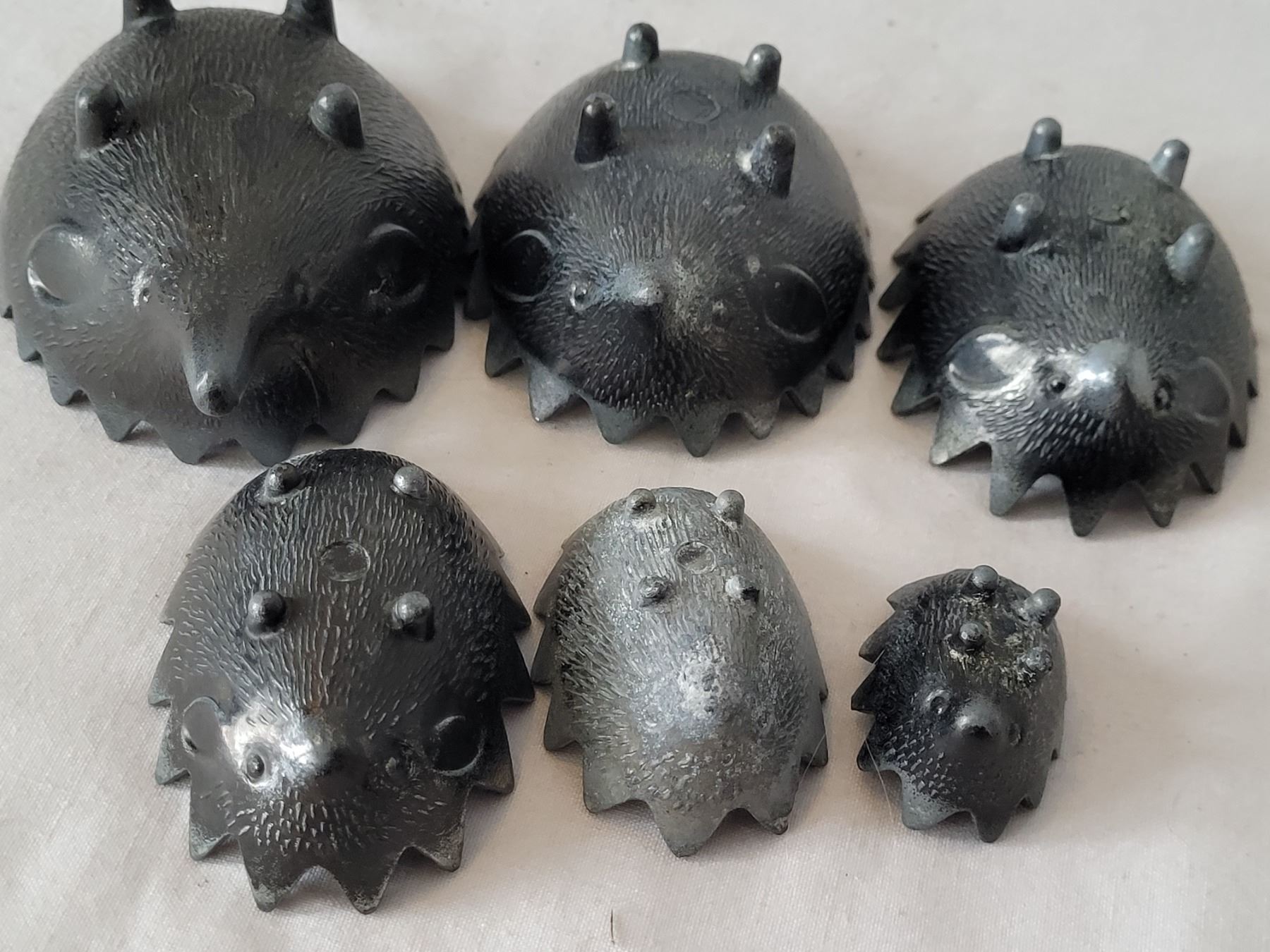 Vintage 1960-'70's Walter Bosse style, metal nesting hedgehog ashtray set of 6. USSR