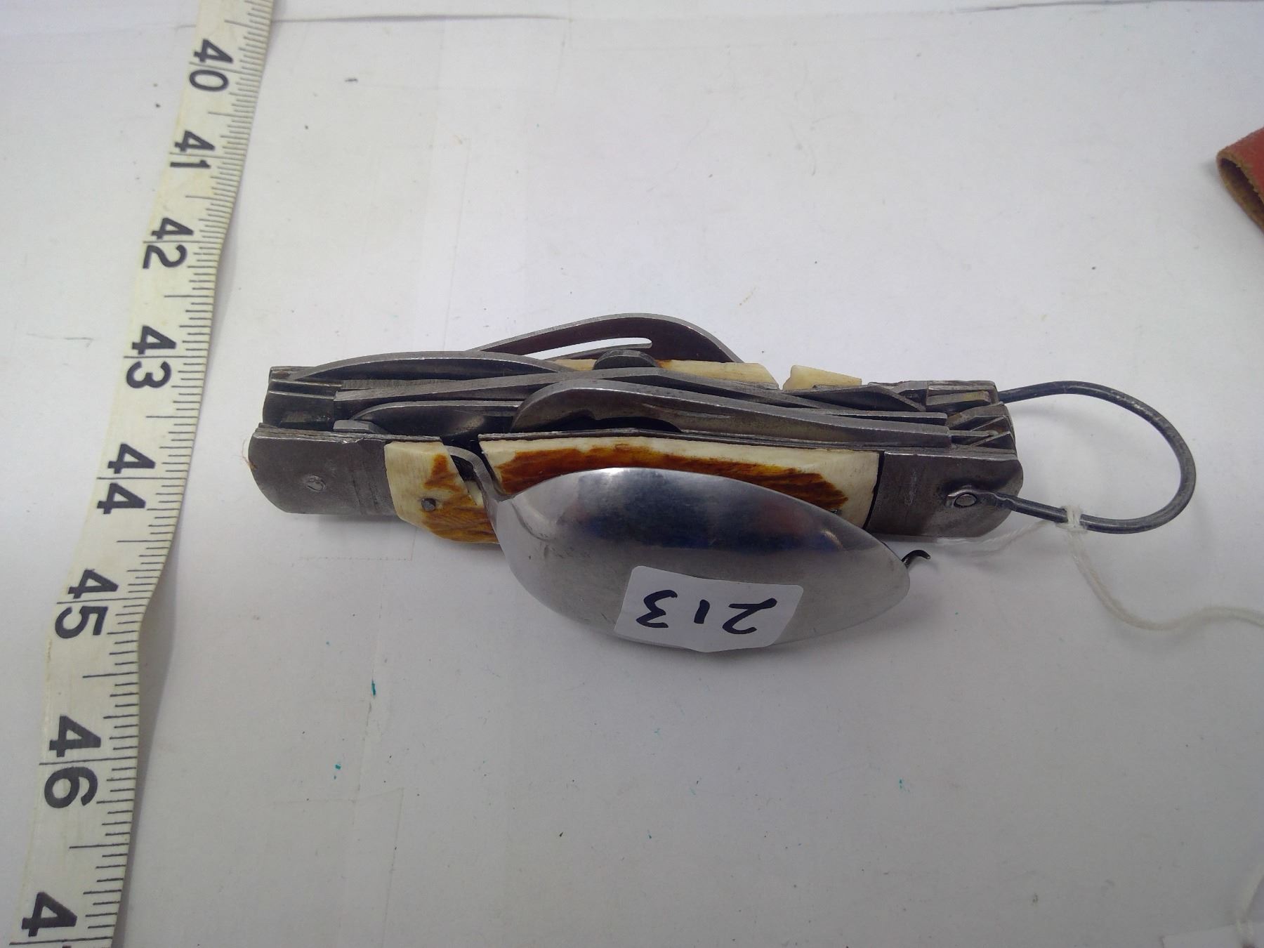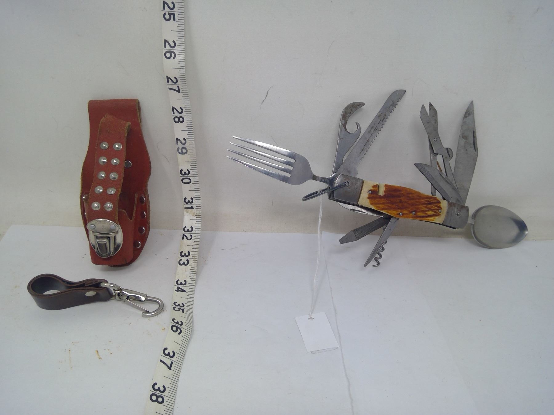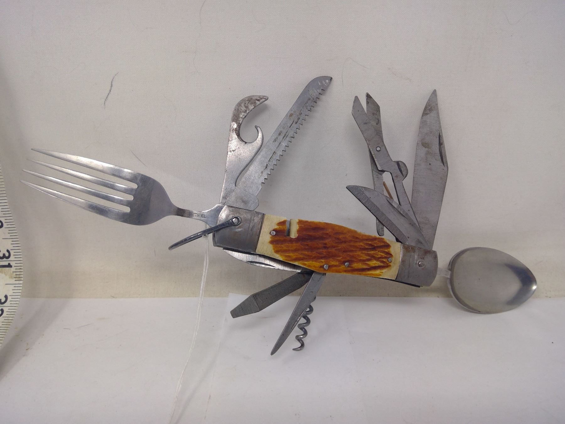 Vintage 1967 camping folder one-man-show knife, spoon, fork, big blade, scissors, can opener, awls, scrapers, etc. By Mitsubishi Corporation, 1967, Japan.