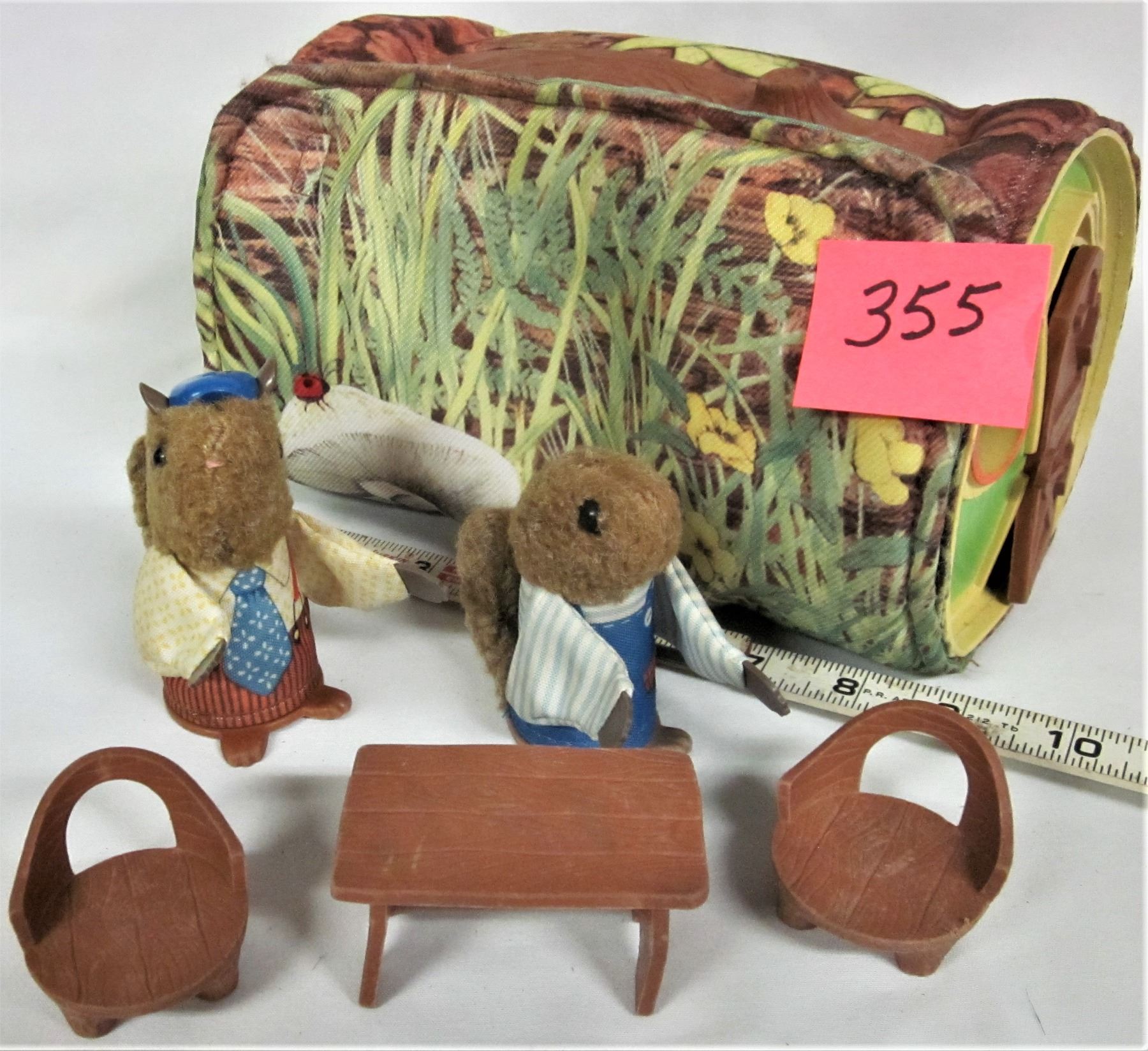 Vintage 1970's Fisher Price #960 Woodsey's Log House rubber table & 2 chairs - PAPA & Milkwood finger puppets