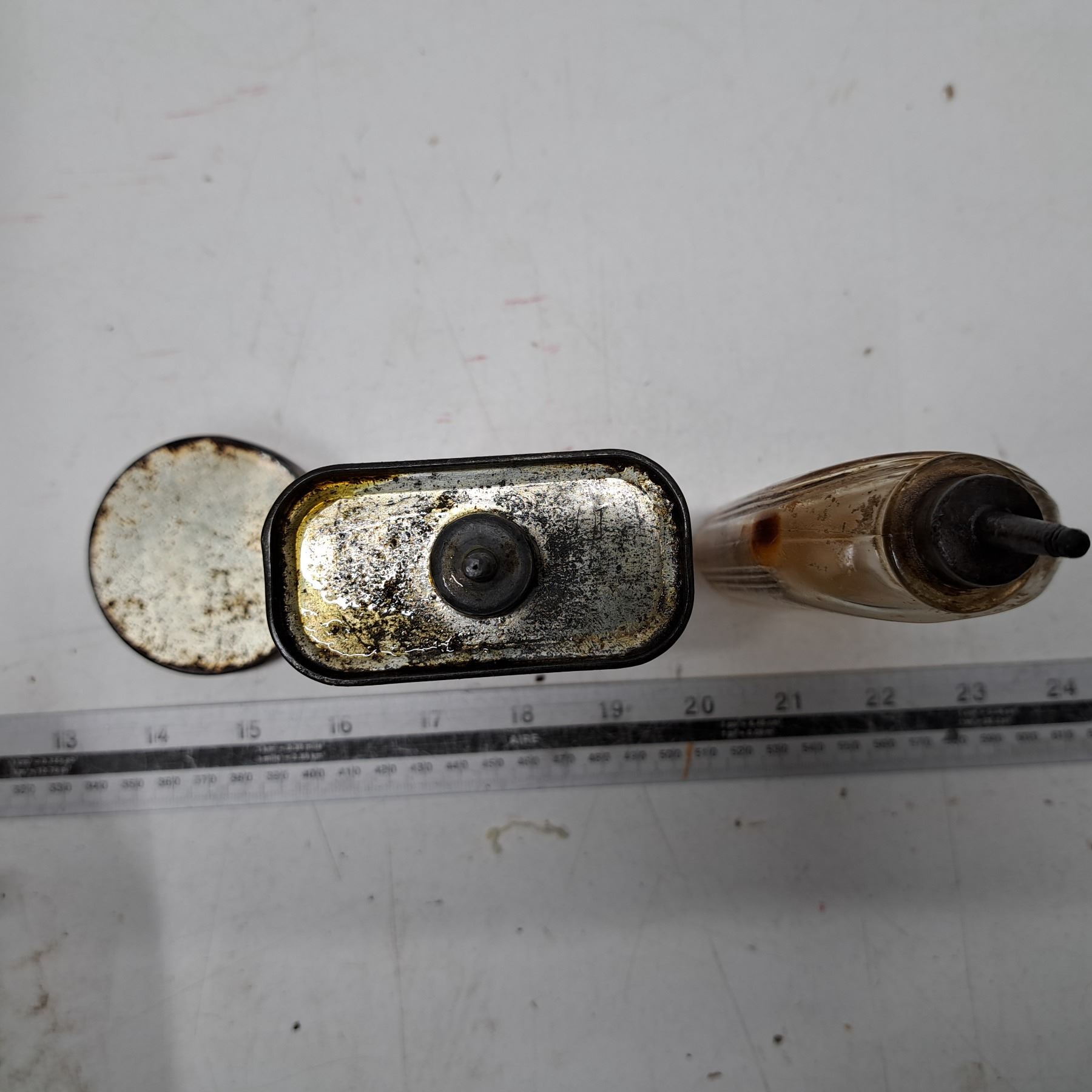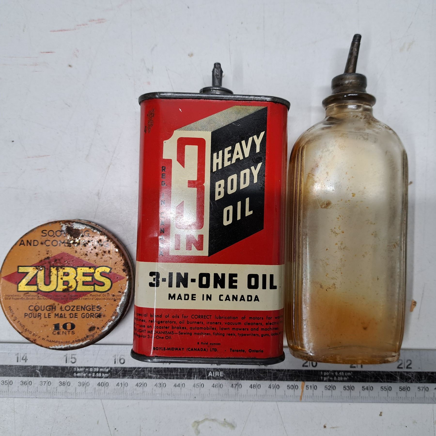 Vintage 3 in 1 oil tin, cough lozenges and glass bottle