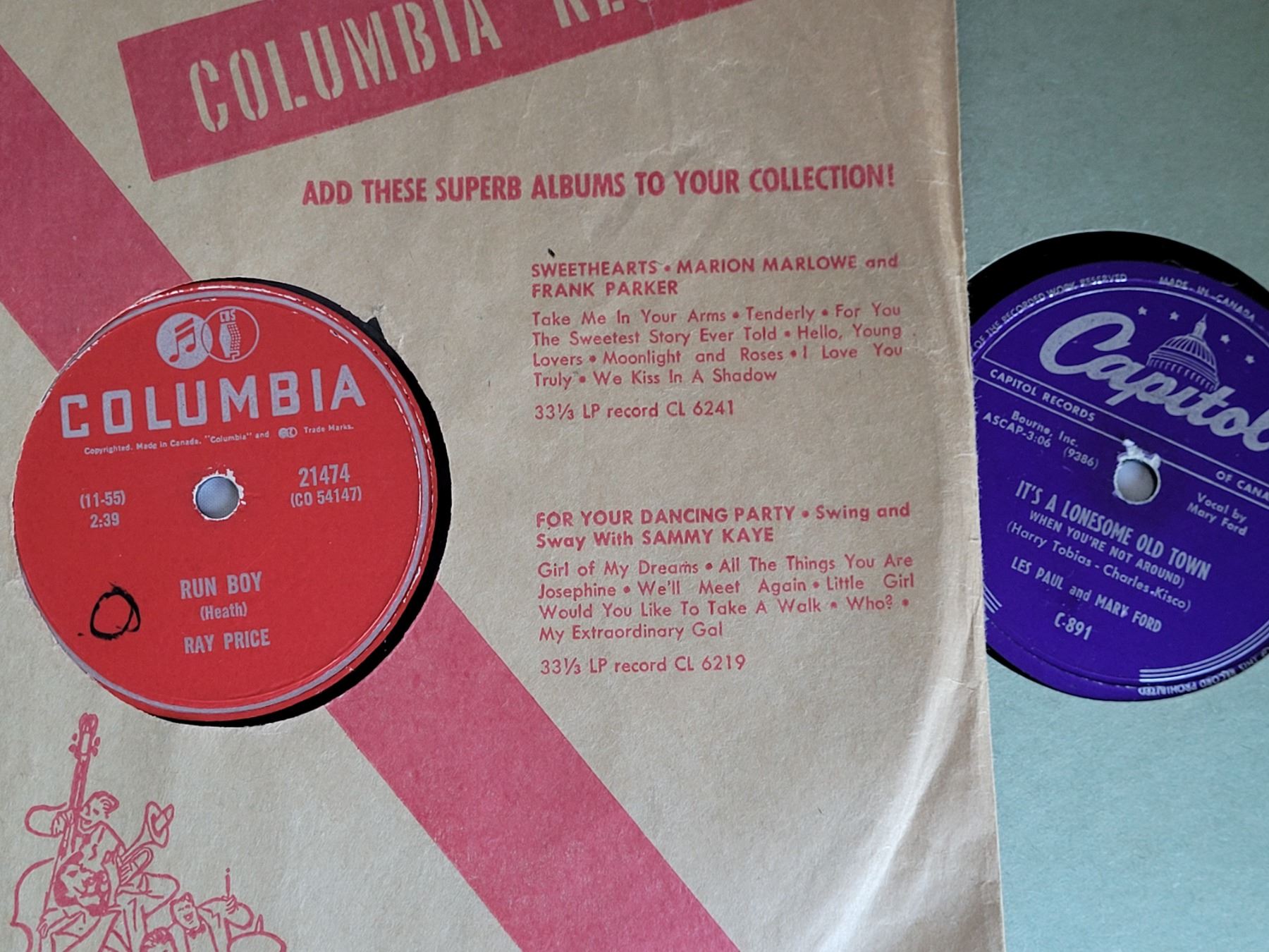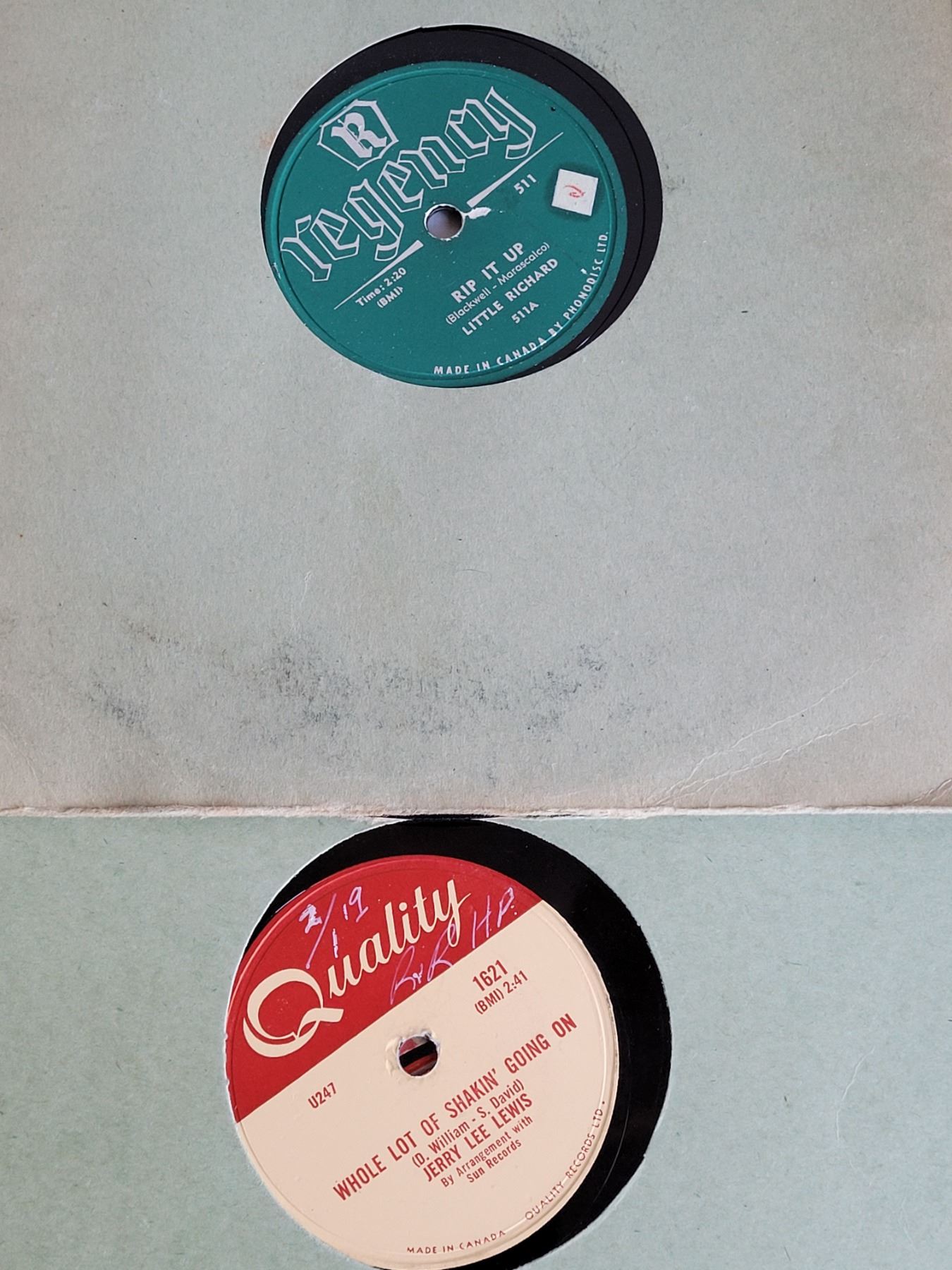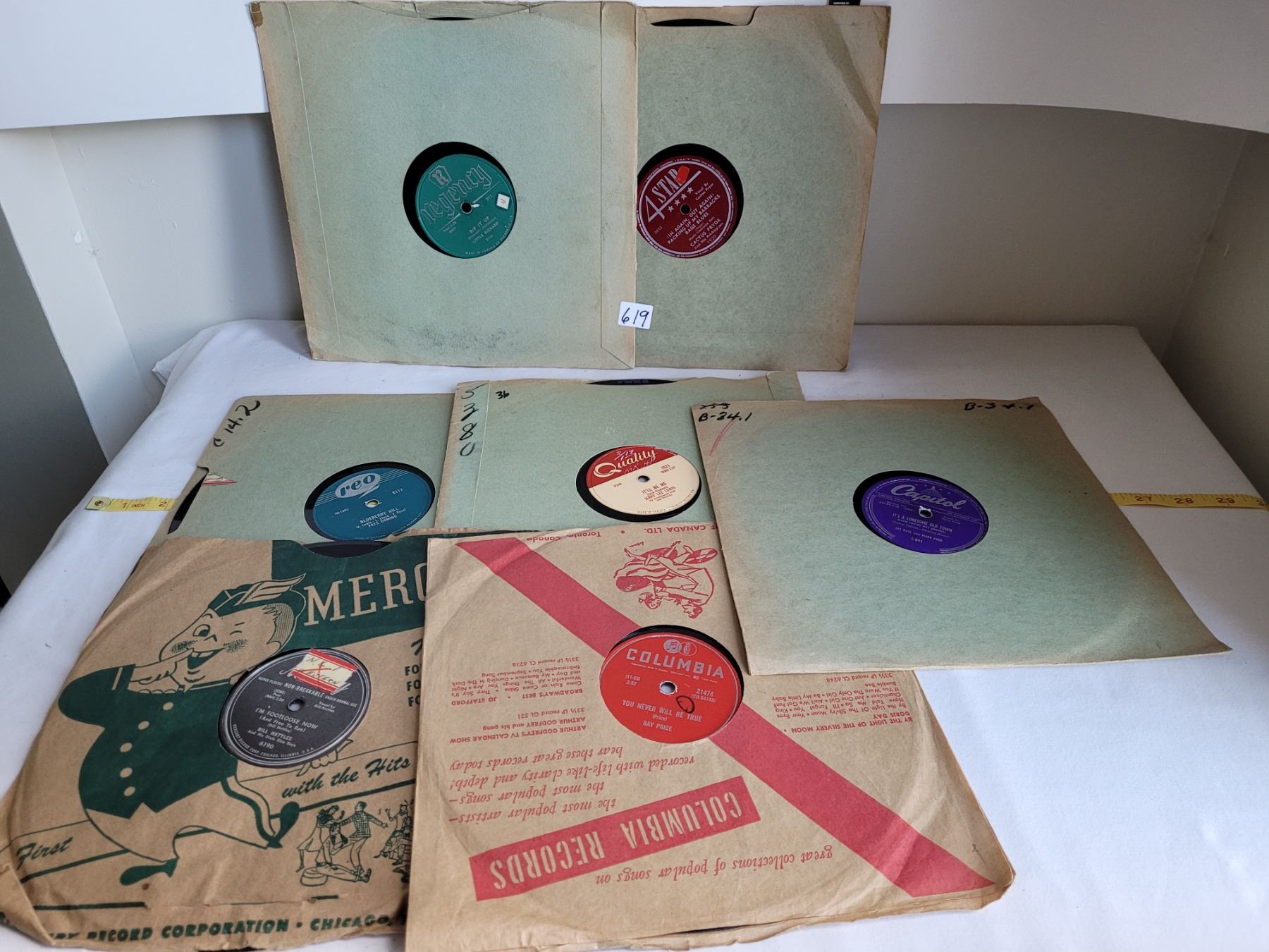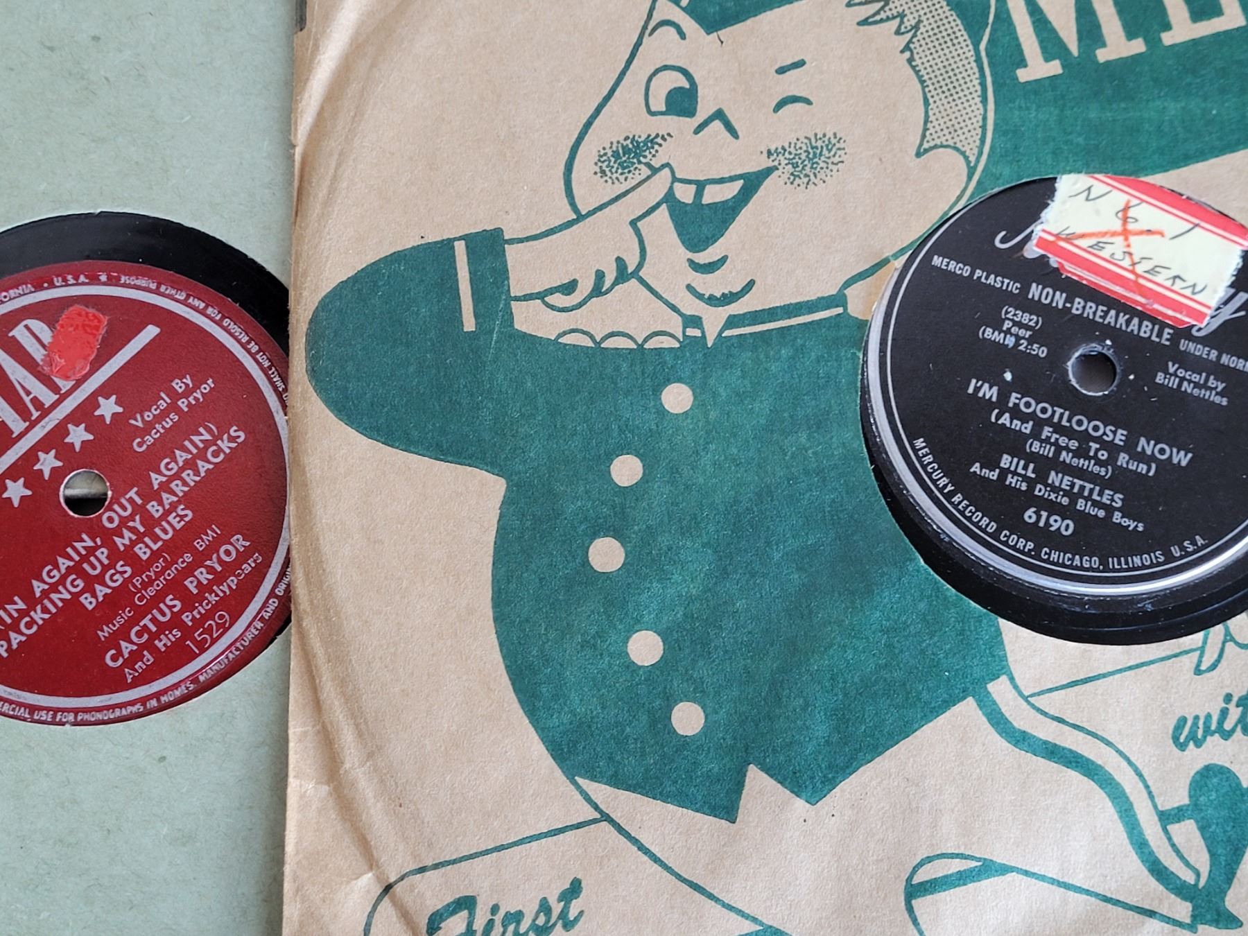 Vintage 78rpm records. Fats Domino, Ray Price, Jerry Lee Lewis, Little Richard, Cactus Pryor, Bill Nettles & Les Paul.