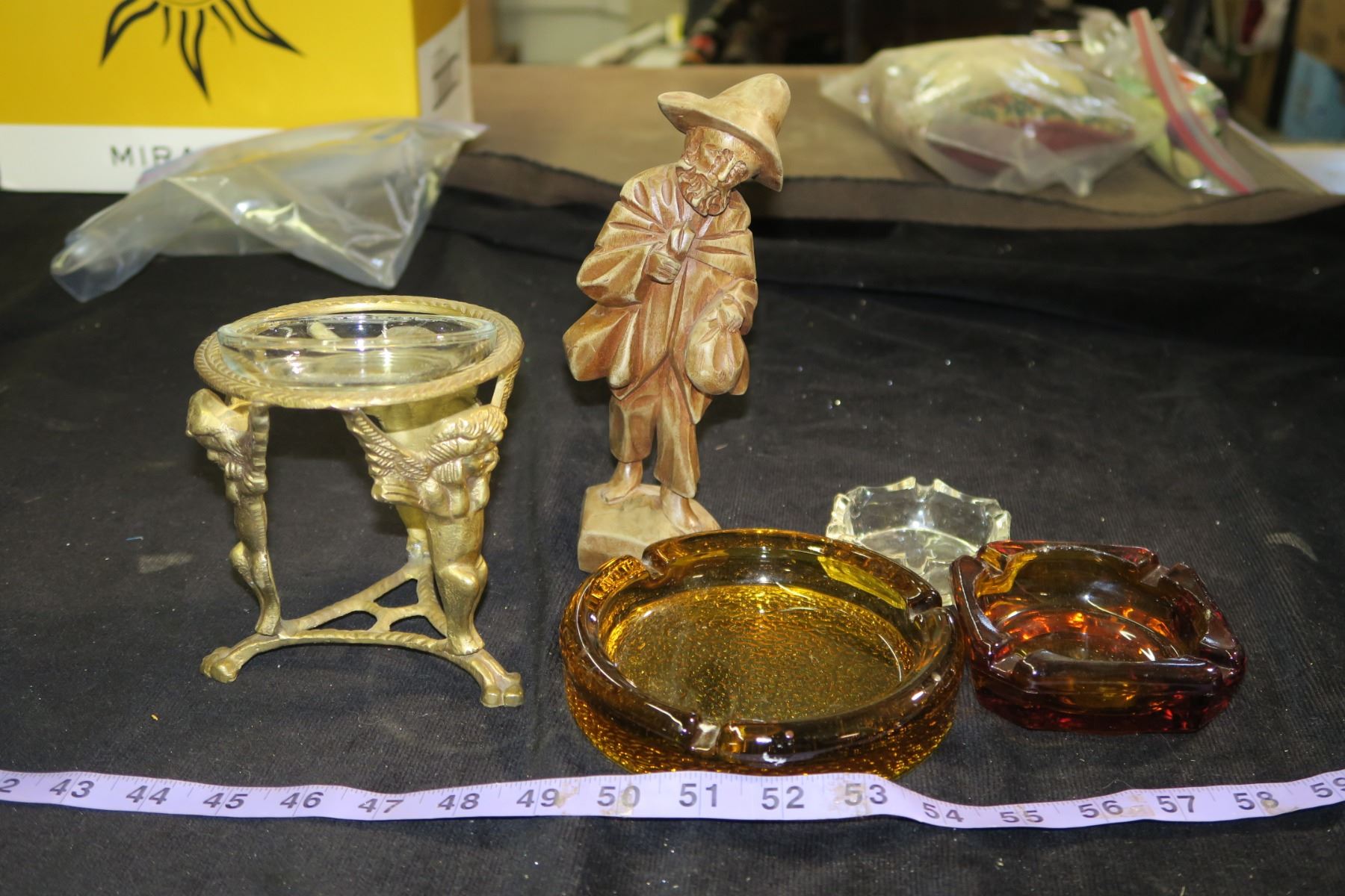 Vintage Ashtray Stand + Ashtrays & Wooden Carved Hobo